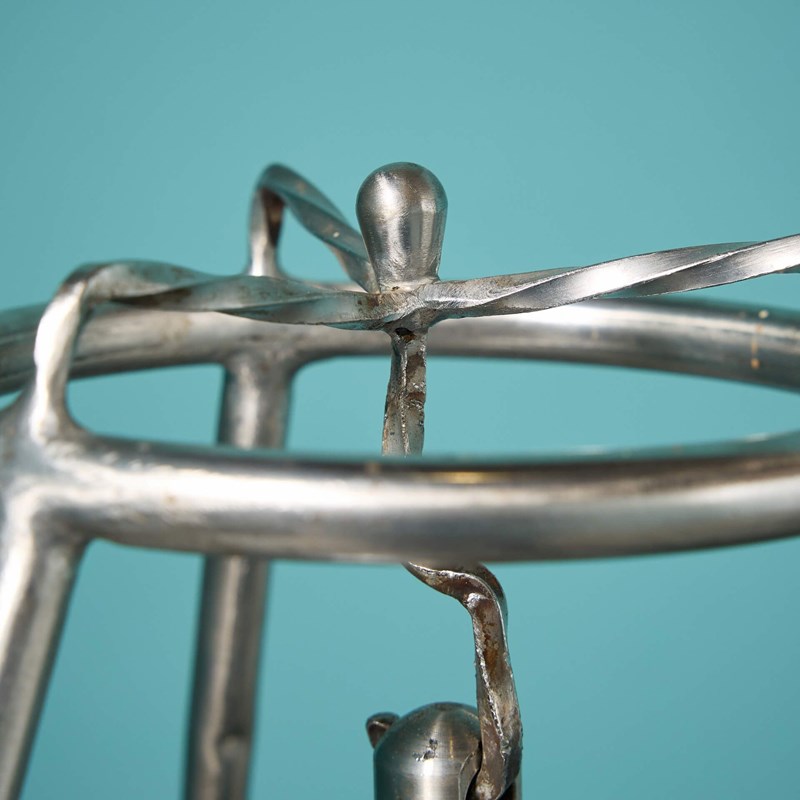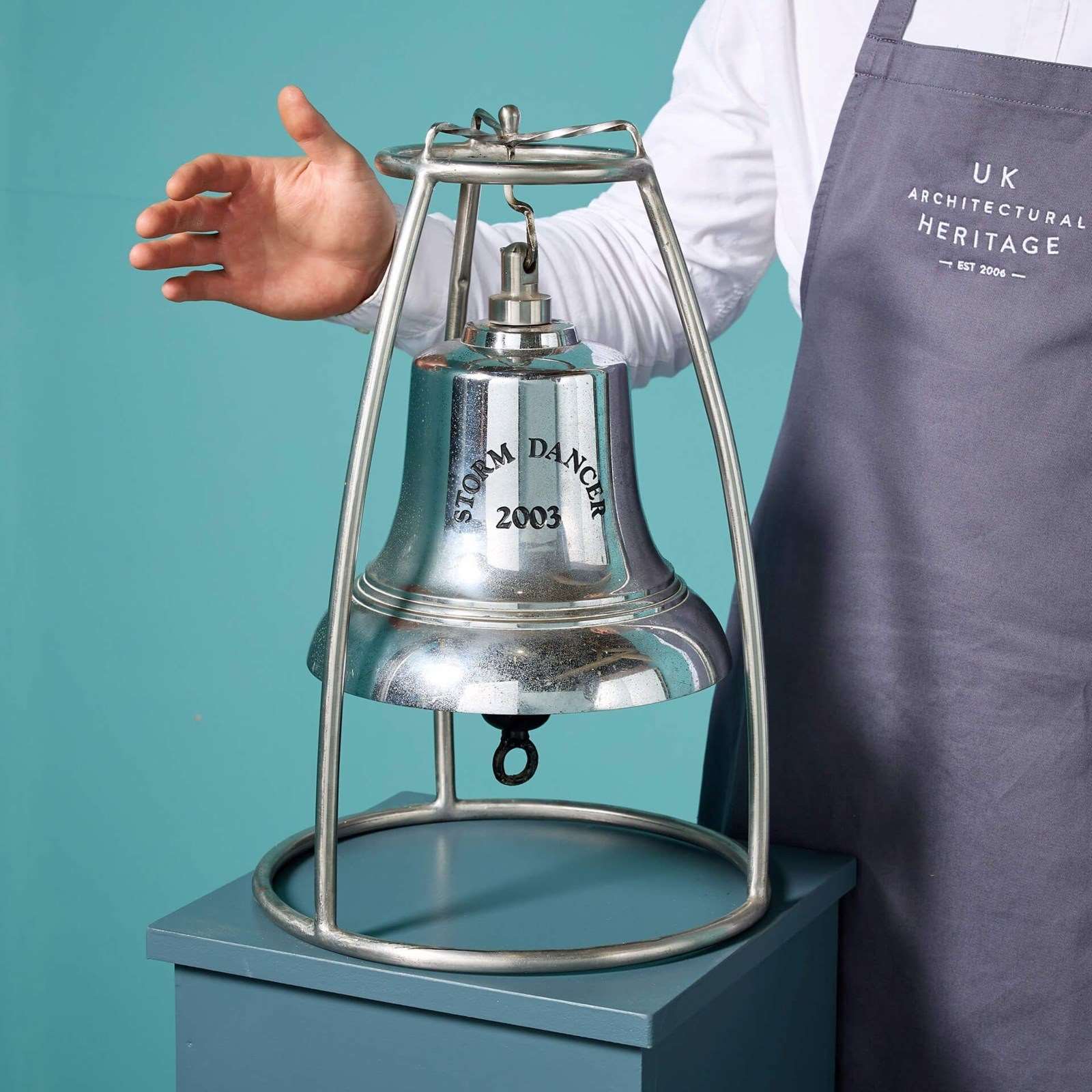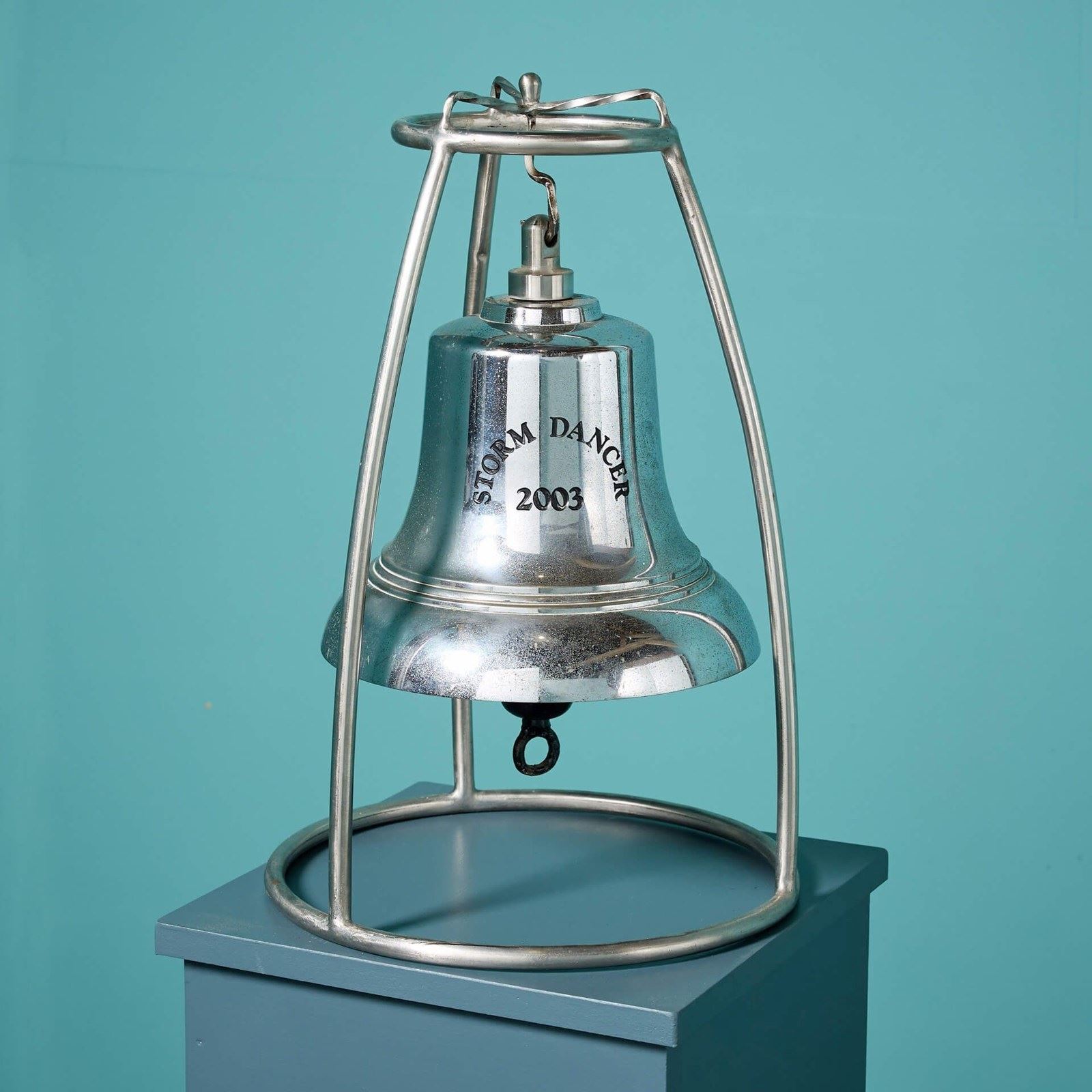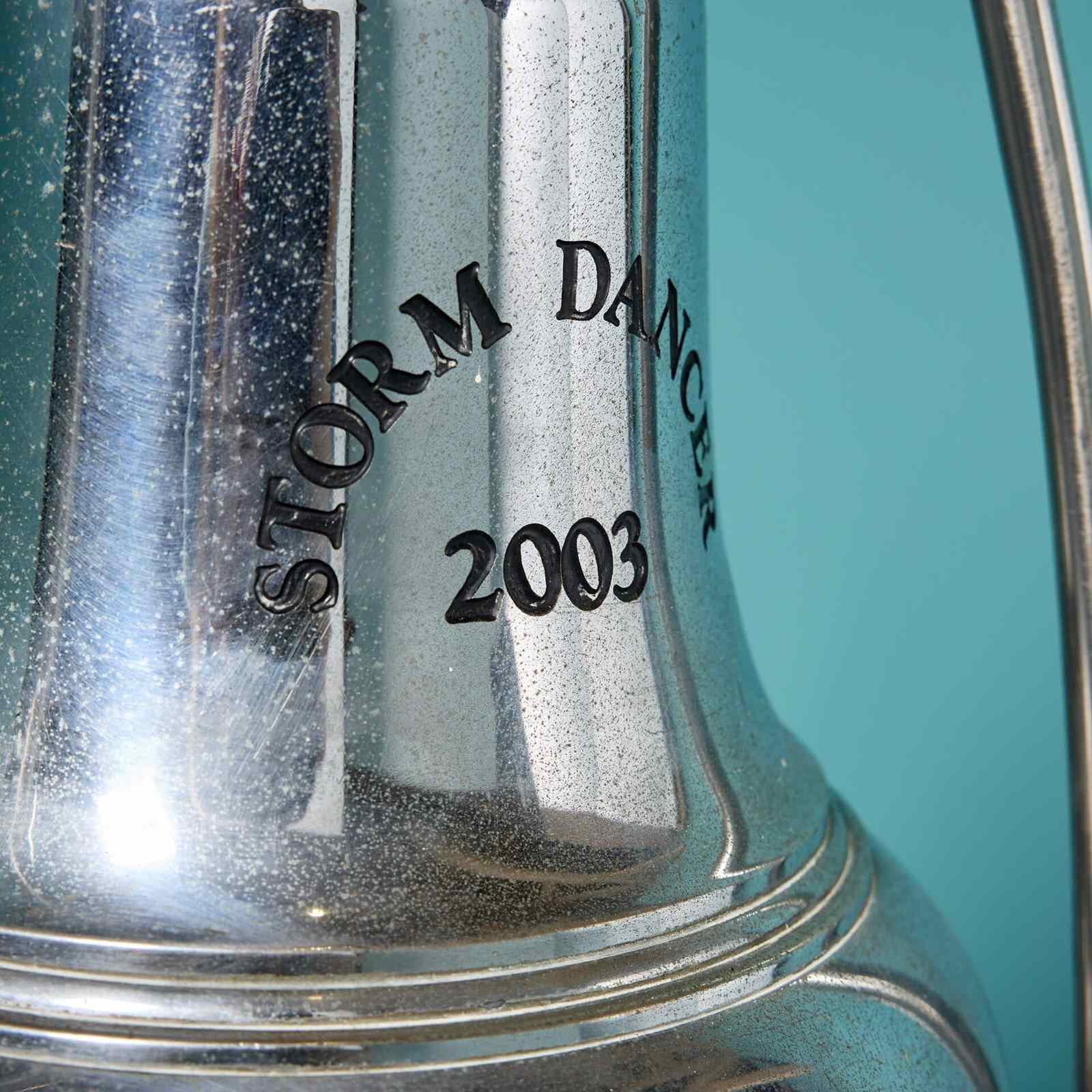 An interesting object for the nautical collector; a reclaimed chrome-plated bronze maritime bell marked ‘Storm Dancer 2003’ on a bespoke stainless steel stand.