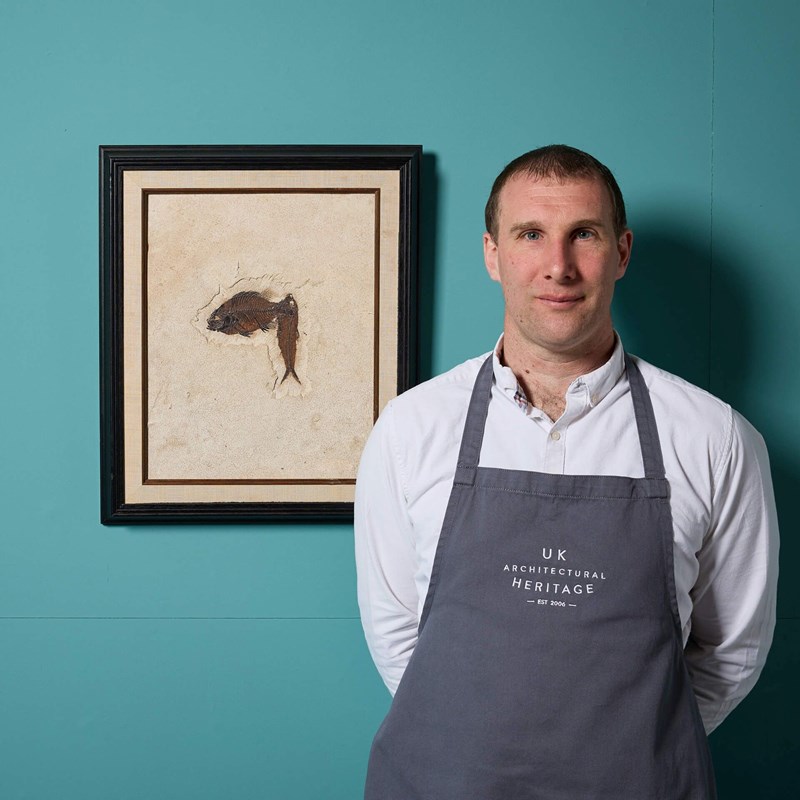 A reclaimed limestone panel of a fossil fish housed in a black painted frame with a cloth border.
