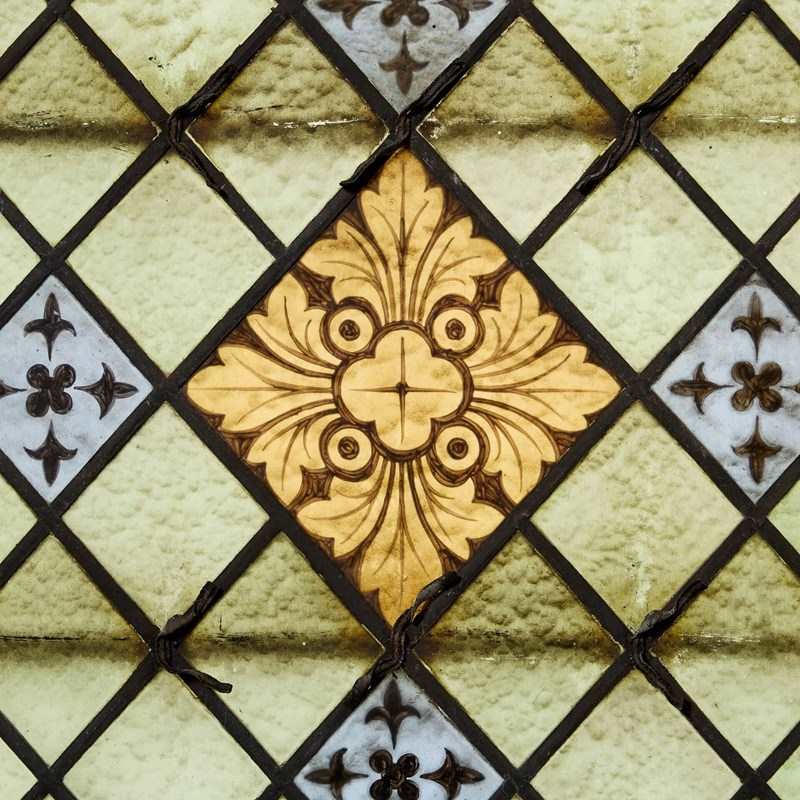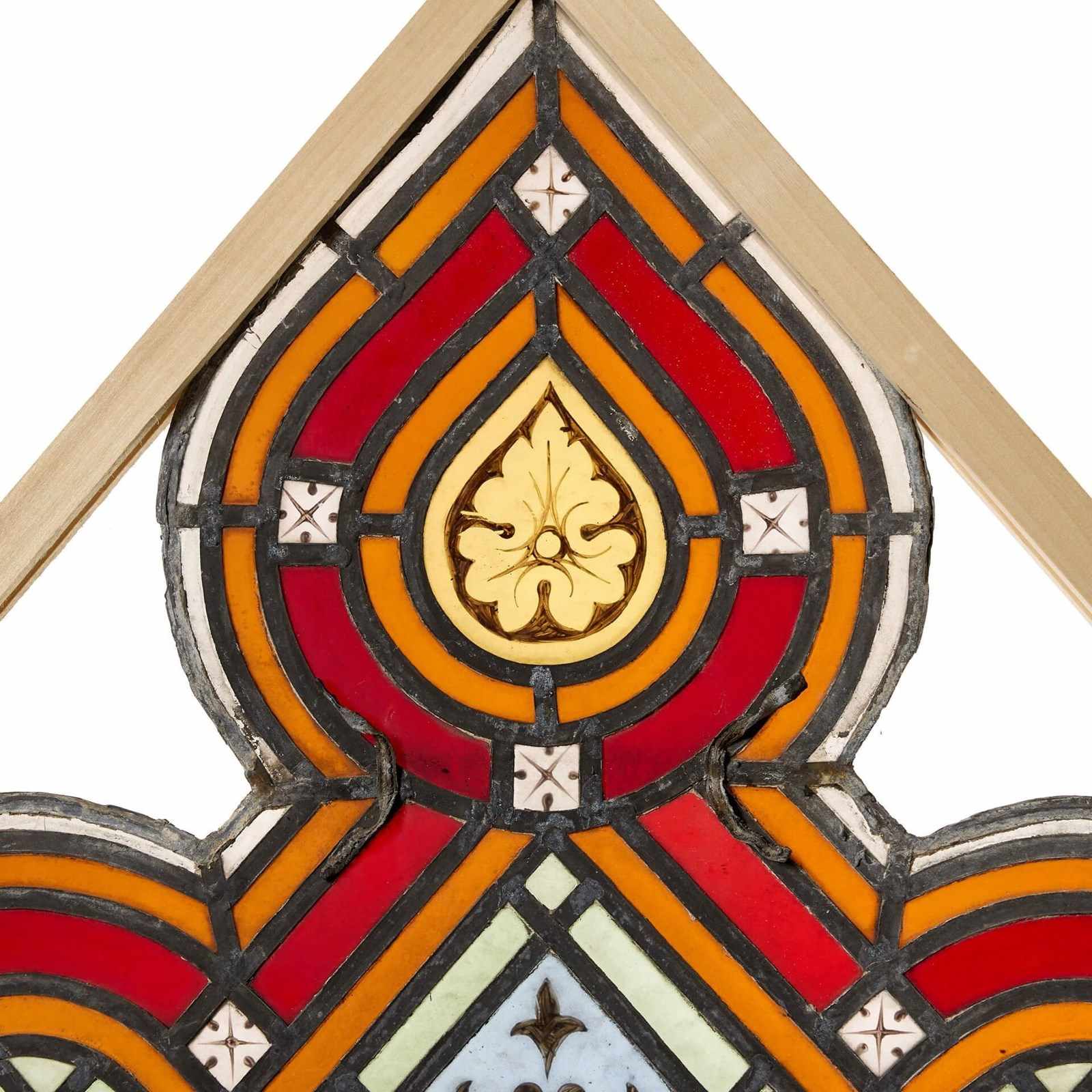 A reclaimed stained glass church window dating from the late 19th century with decorative foliate panels within a red glass border. This stunning antique window is comprised of two coordinating stained glass panels - a rectangular panel alongside a further shaped ogee panel - to create a beautiful stained glass feature window for any property. We have a further rectangular panel available under Stock No. 34178. ADDITIONAL DIMENSIONS Top panel: H54 x W 67 x D1cmBase panel: H65 x W67 x D1cm CONDITION REPORT Good structural condition. Transports as 2 pieces, both fitted into temporary pine frames. Original lead ties are still attached; these can be removed if not required. Top panel has a couple of small cracks to the very perimeter. The lower panel has one crack in the clear perimeter glass. Some areas of discolouration where support bars were previously fitted; would benefit from further cleaning. Photographed in front of a light box.