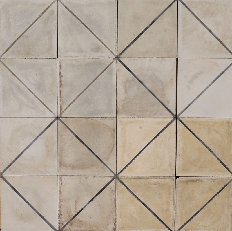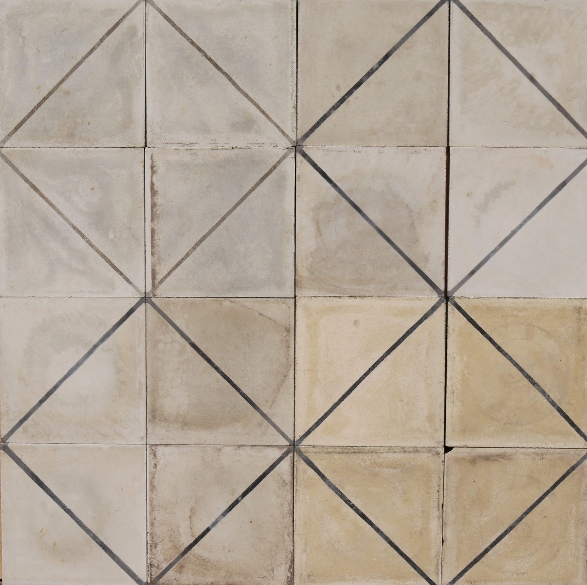 A batch of 76 reclaimed cement patterned floor or wall tiles in three different shades of cream. These tiles will cover 3 m2 or 32 sq ft.