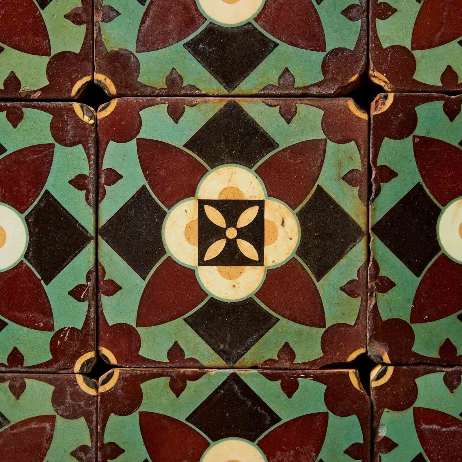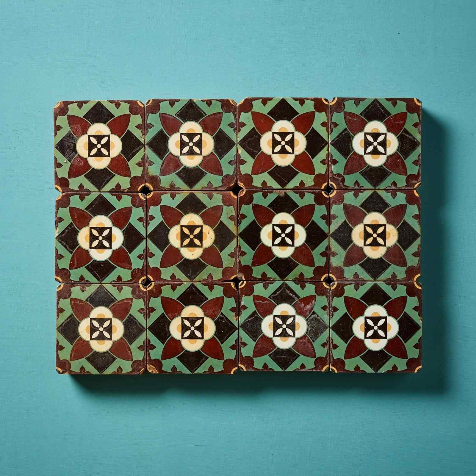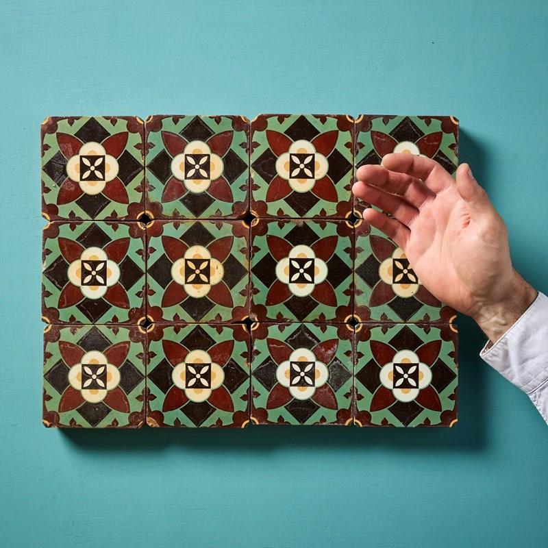 Twelve 4-inch antique encaustic tiles by Minton & Co, beautifully glazed with floral embellishments on a green, black and red backdrop.