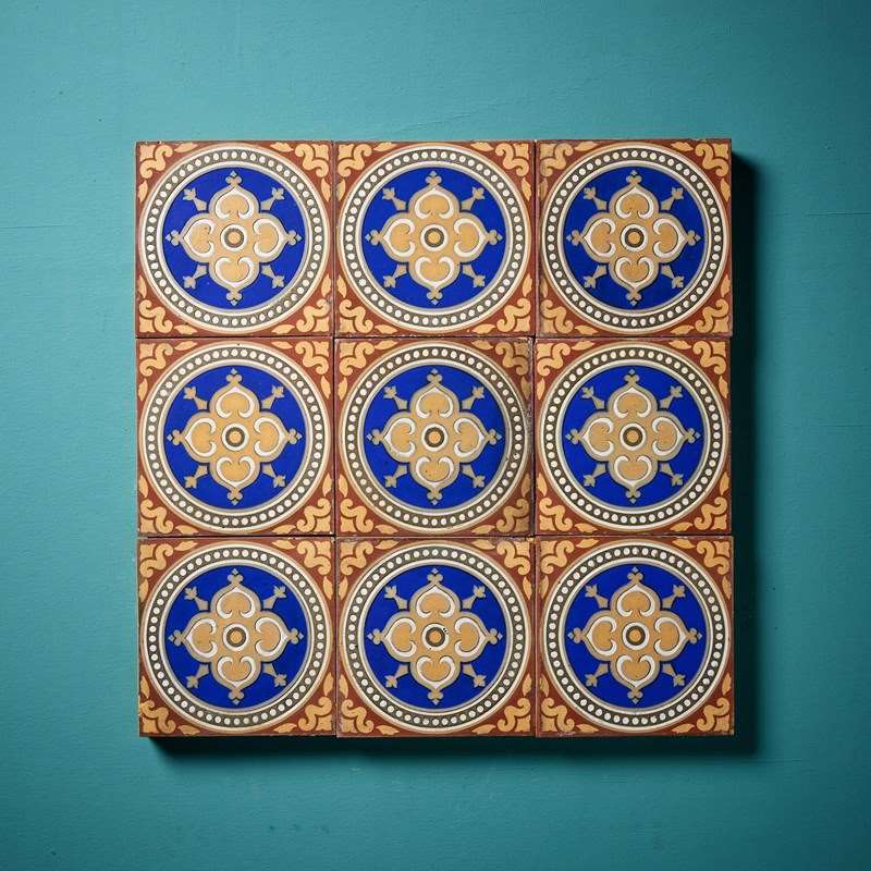 This set of nine reclaimed tiles could be used in a number of ways including a decorative panel or a vibrant splashback for a vintage kitchen. We are selling various sets of these tiles in panels of nine as pictured which could be used together as floor tiles.