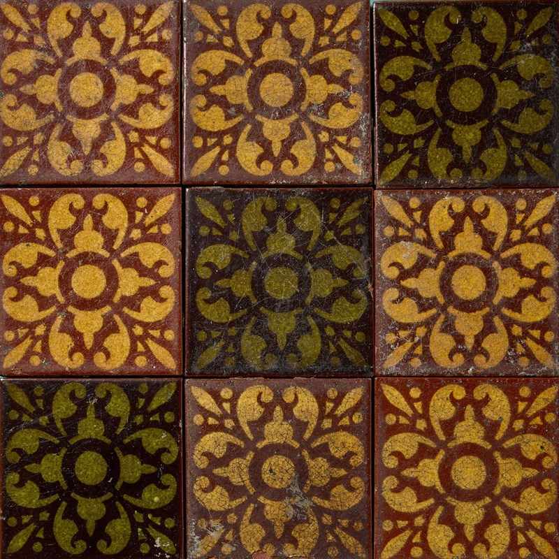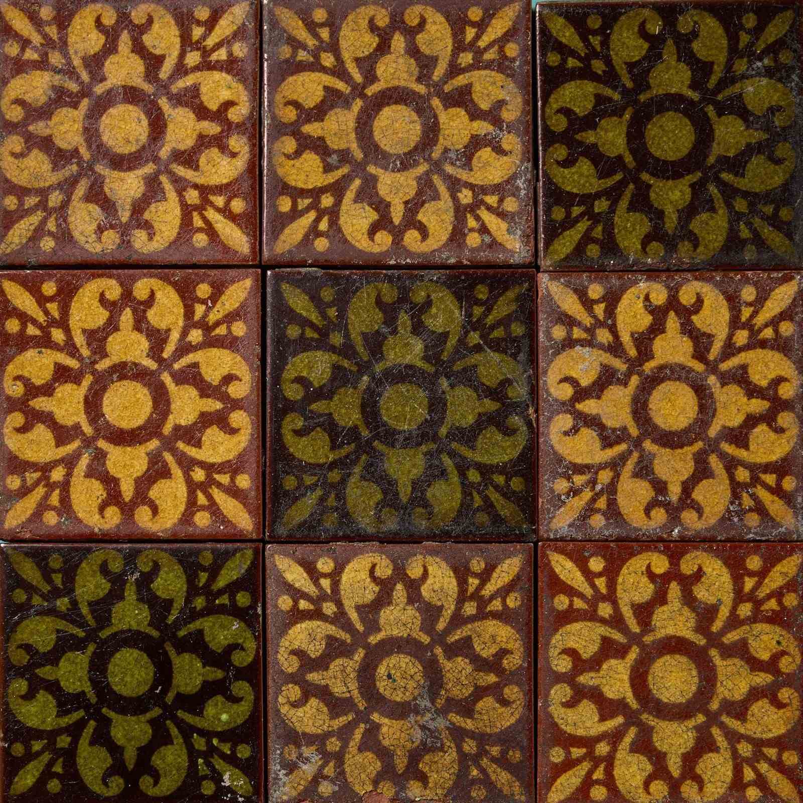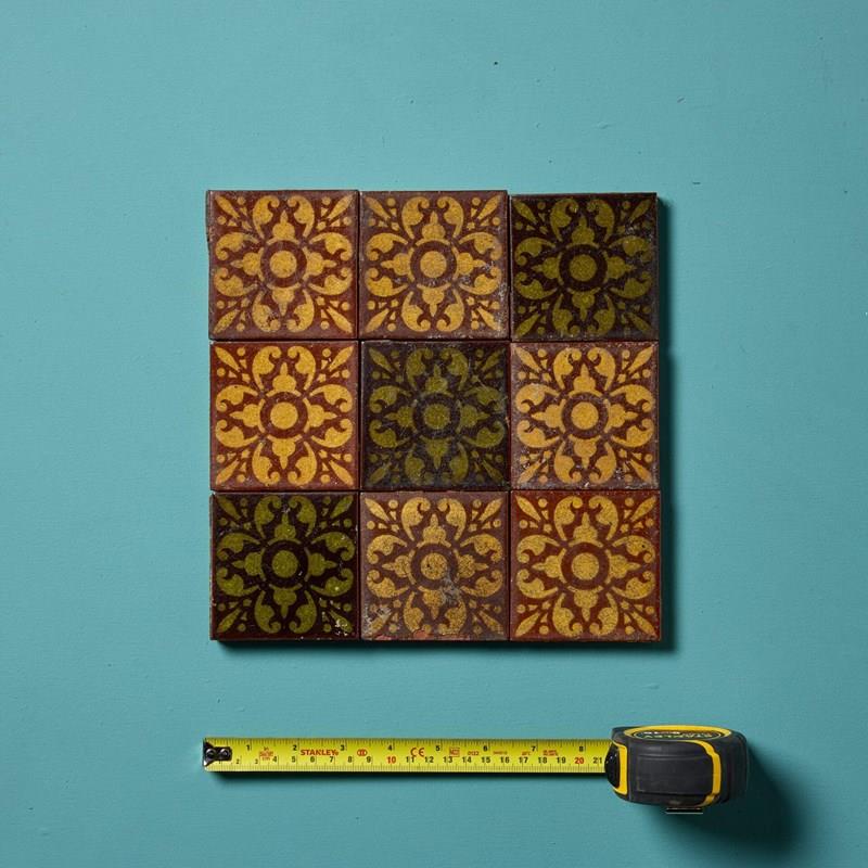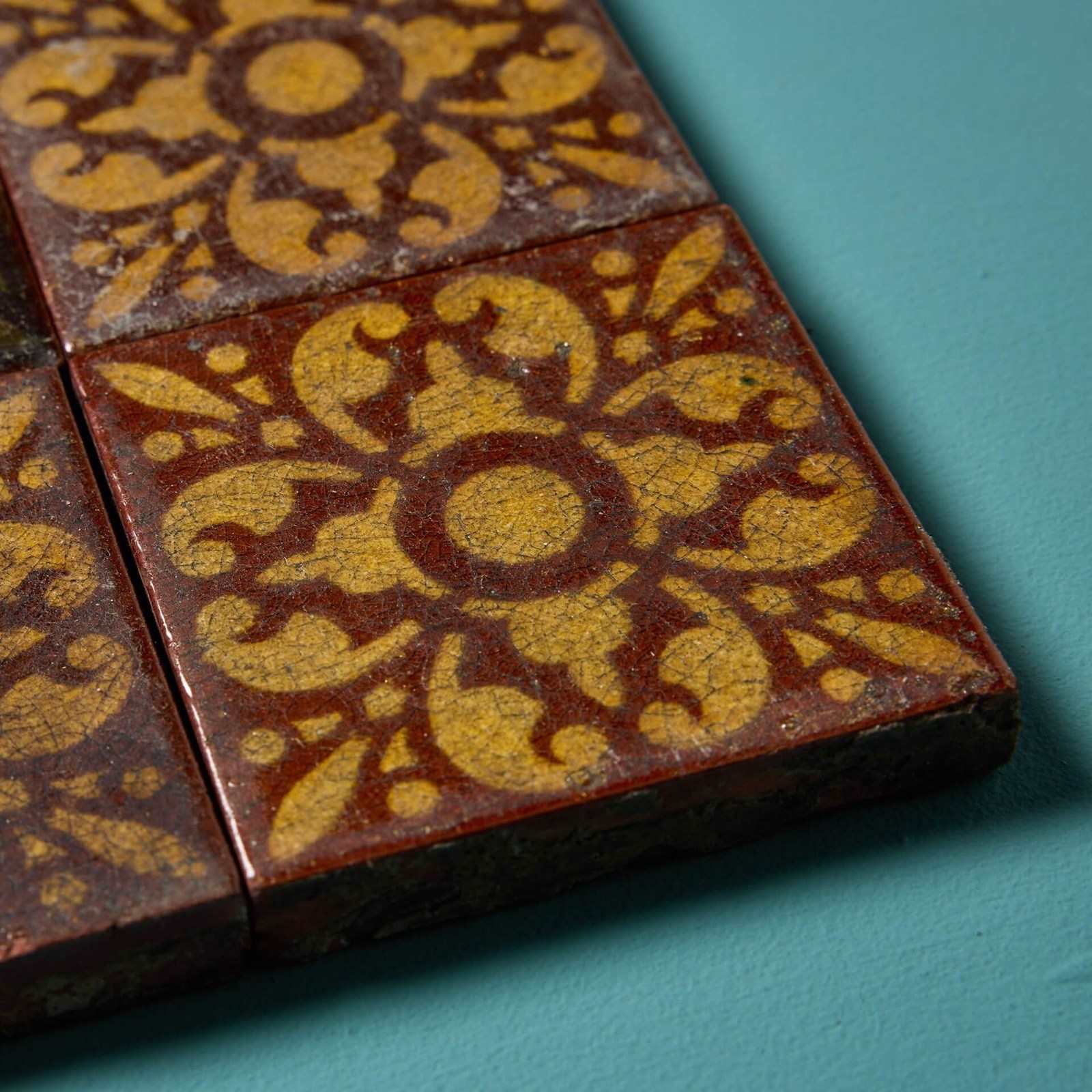Dating from the late 19th century, these tiles feature a matching floral pattern design in varying shades of dark red and golden yellow. They will make a striking feature tile panel in an interior, usable as decorative tiles or a stylish Art Nouveau splashback. We are also selling another set in the same style.