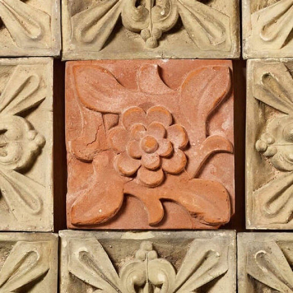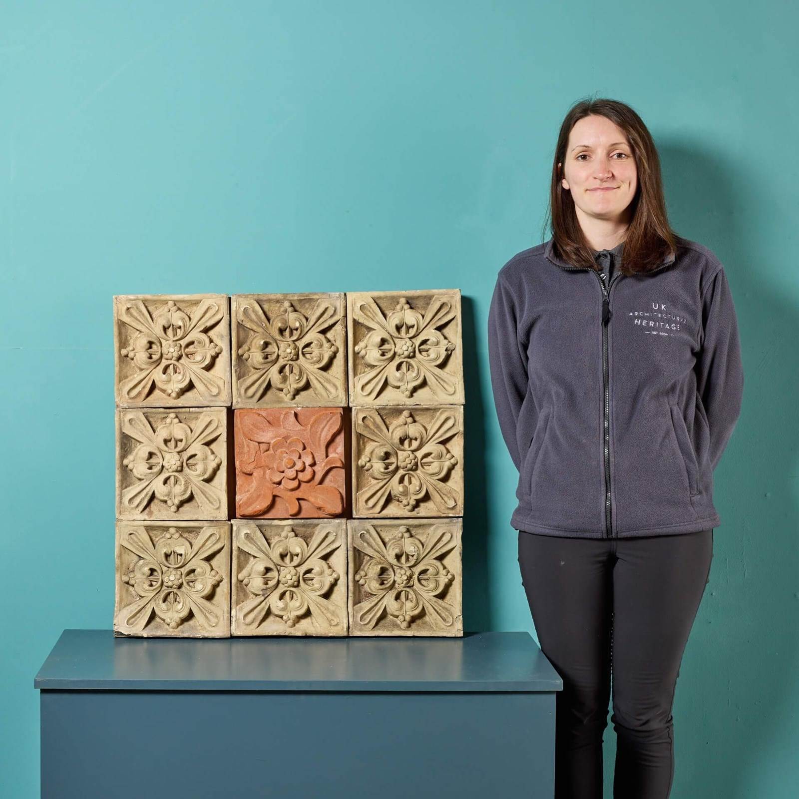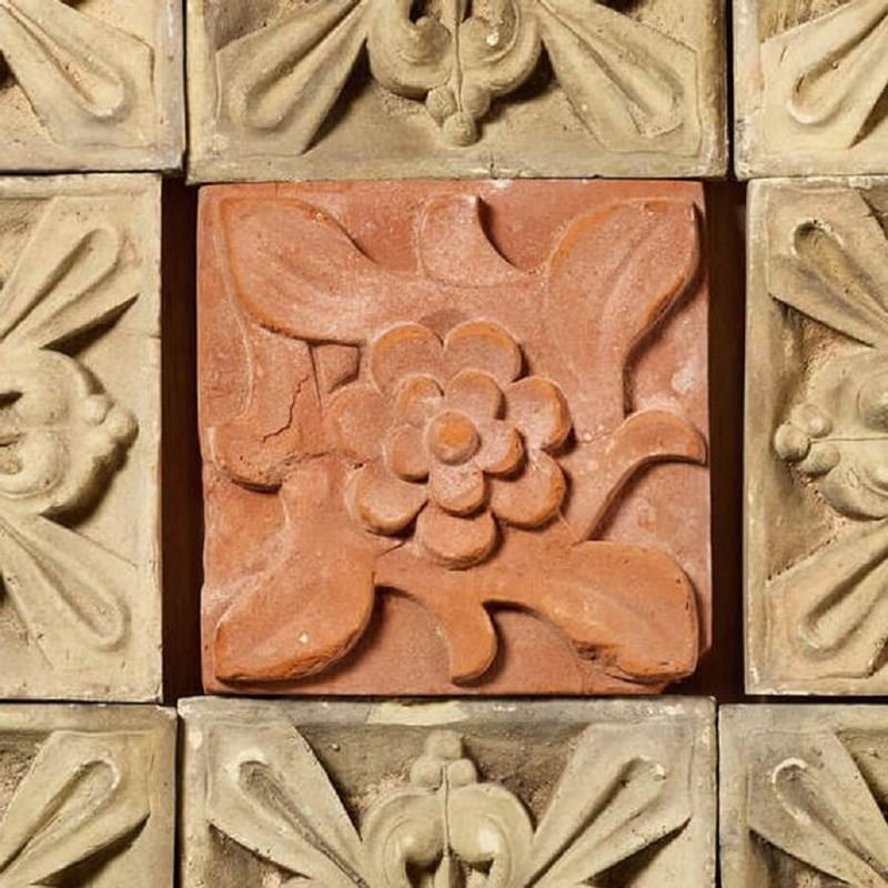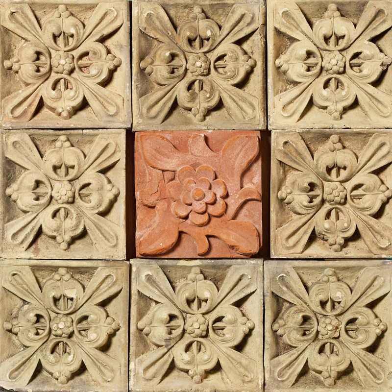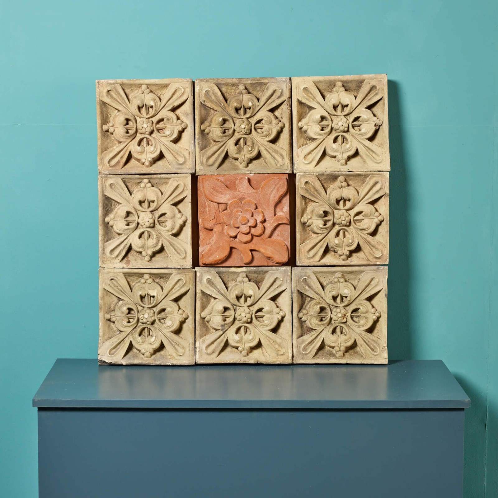 An antique 19th century decorative panel of 9 individual terracotta plaques, sourced from an estate in Cambridge.