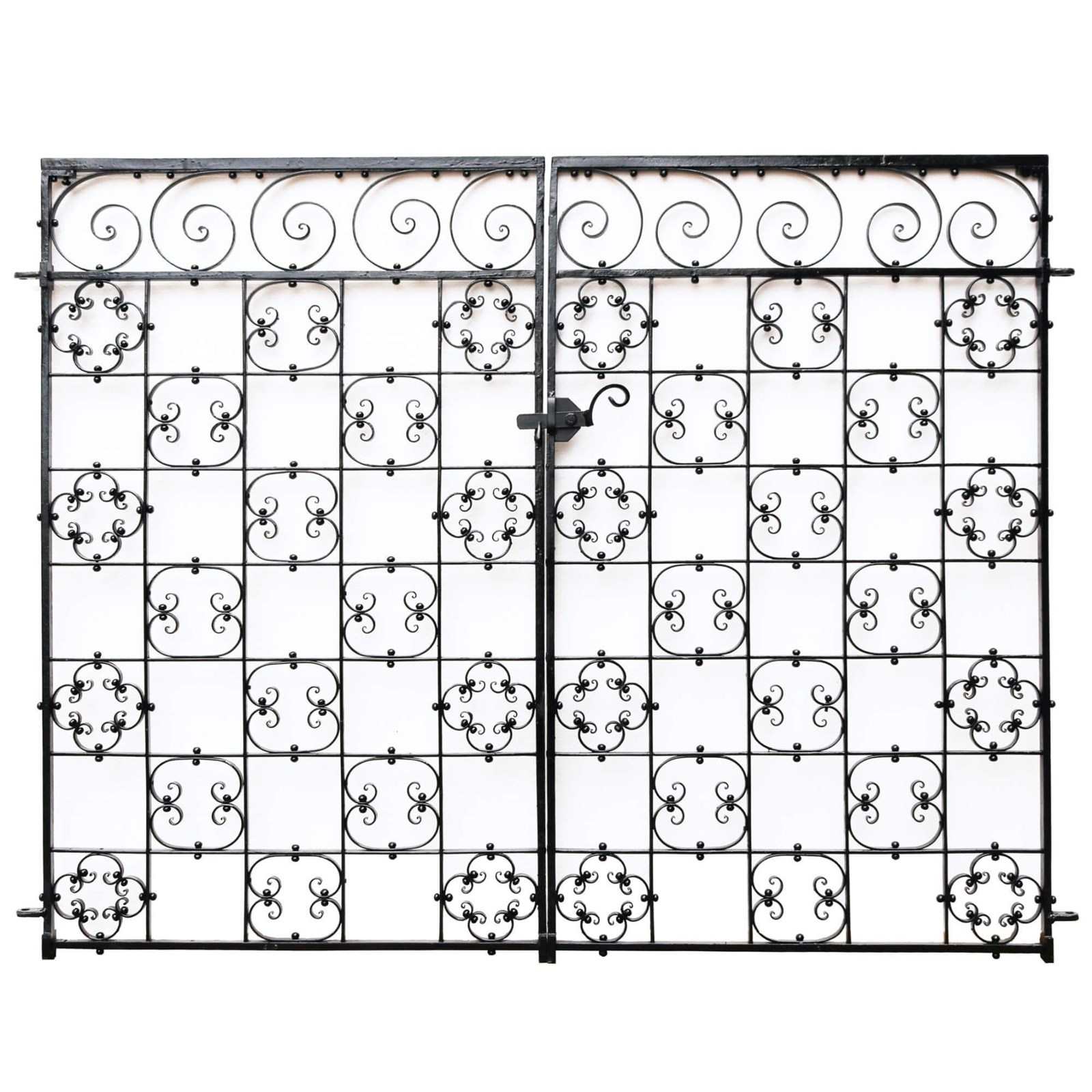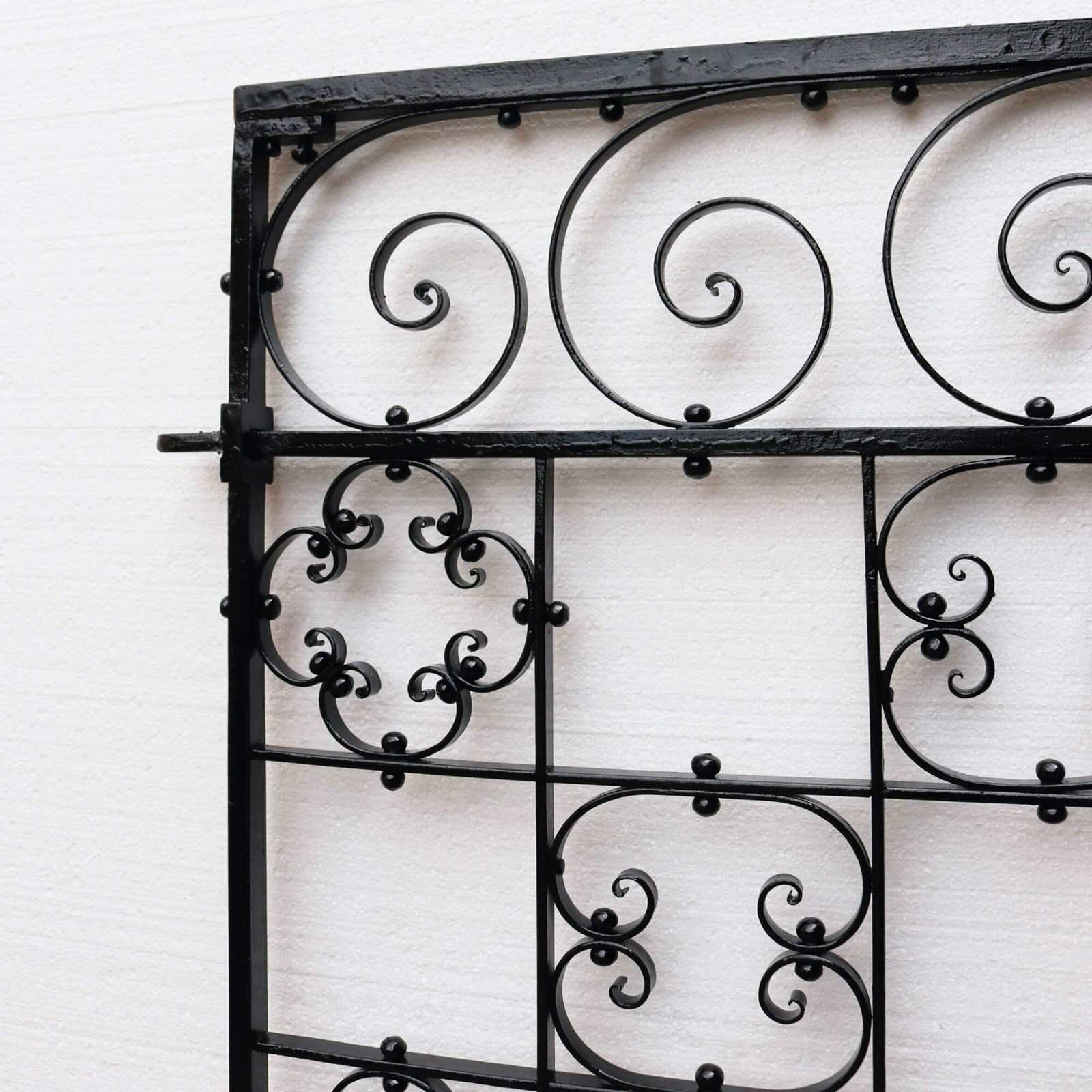 An ornate pair of antique wrought iron side gates, dating from the 1890s. These gates are beautifully detailed with a series of scrolled quatrefoils that together make a smart, uniform look. At over 120 years old, these gates are in good condition, applied with recent paint and fitted with a new latch and hinges, making them ready to hang in situ in a garden or yard.