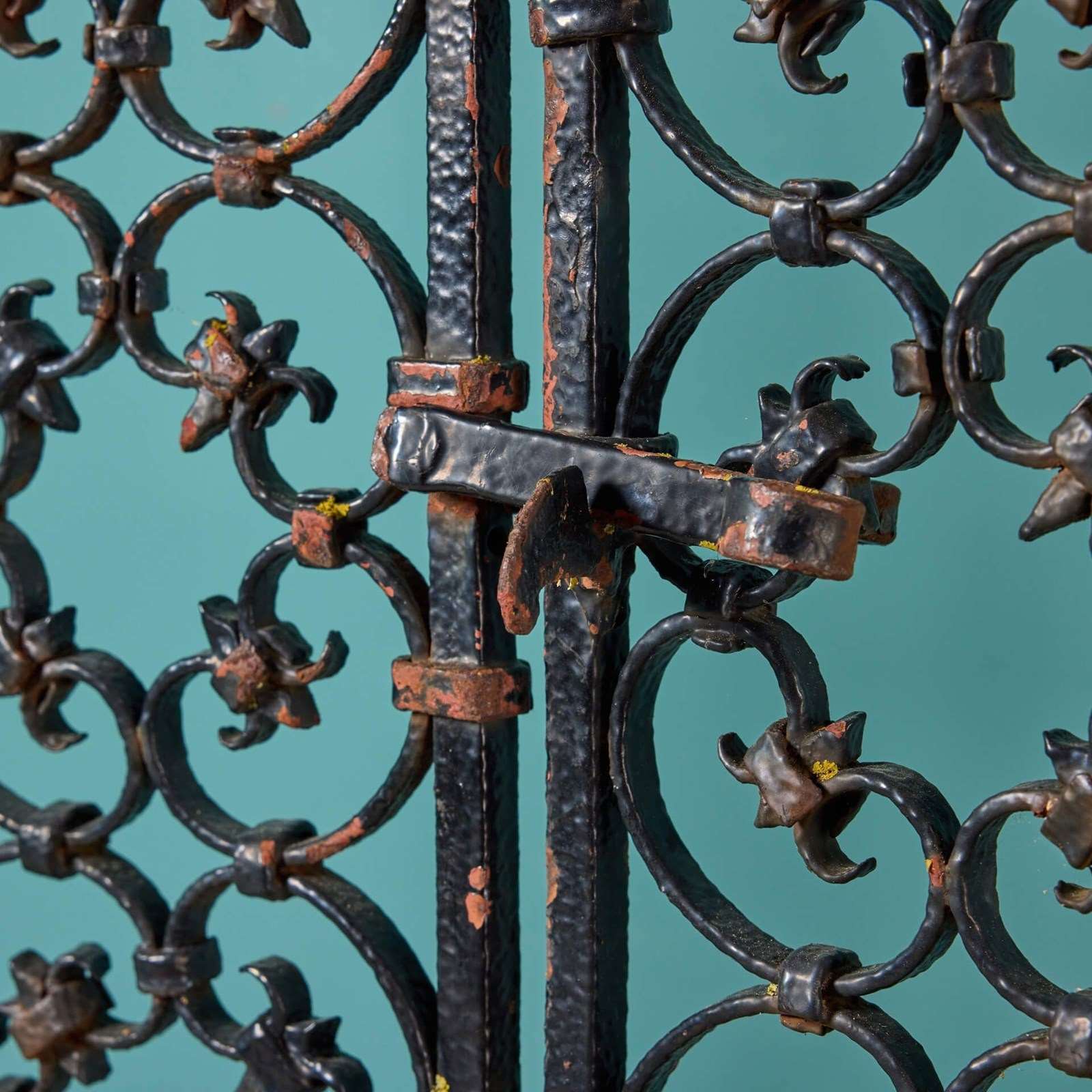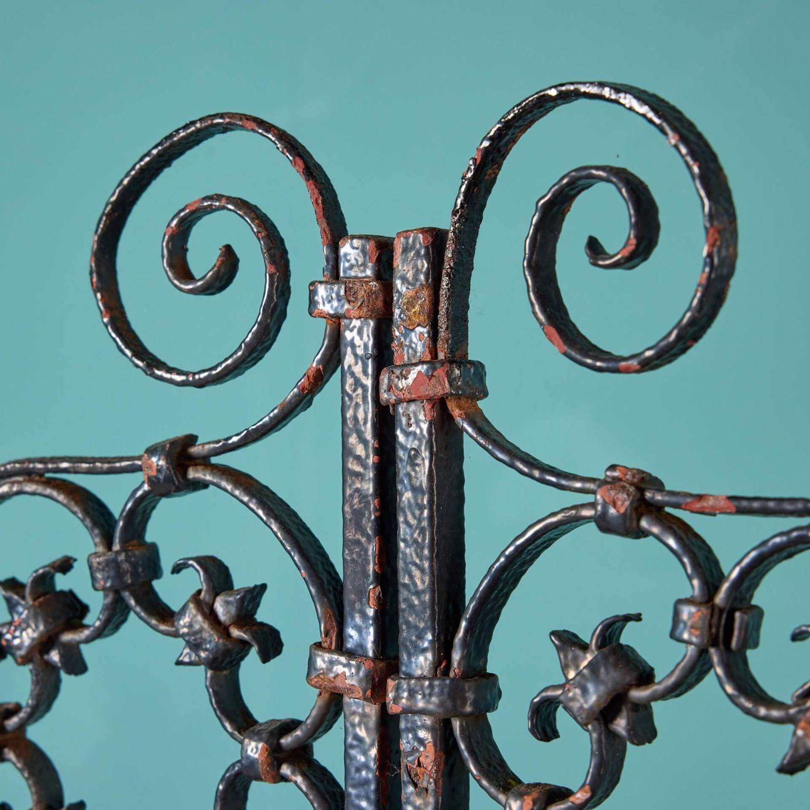 These Edwardian era wrought iron garden gates circa 1900 bring instant grandeur to a garden with their ornate craftsmanship and abundance of repeating scrollwork. They have stood the test of time for more than 120 years and as such would look beautiful in a period cottage garden or at the entrance to a traditional walled courtyard. These antique gates are well crafted, fitted with hinge eyes and an original latch. Width stated excludes any hinges.