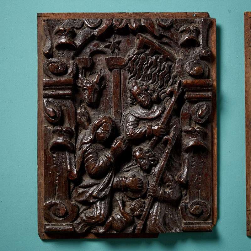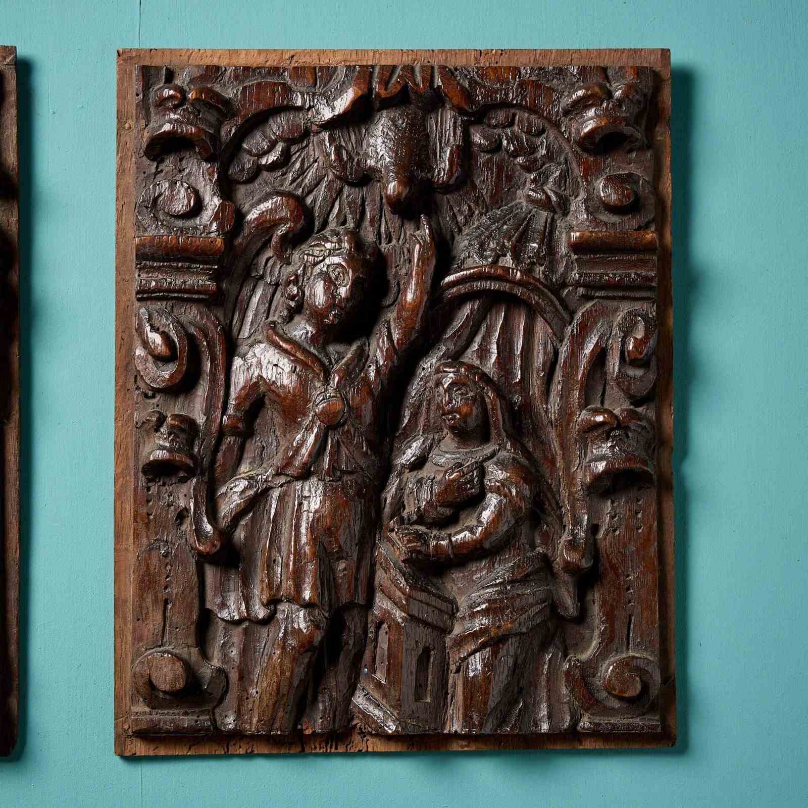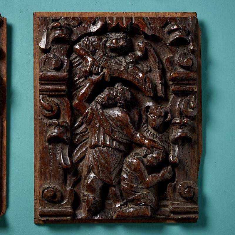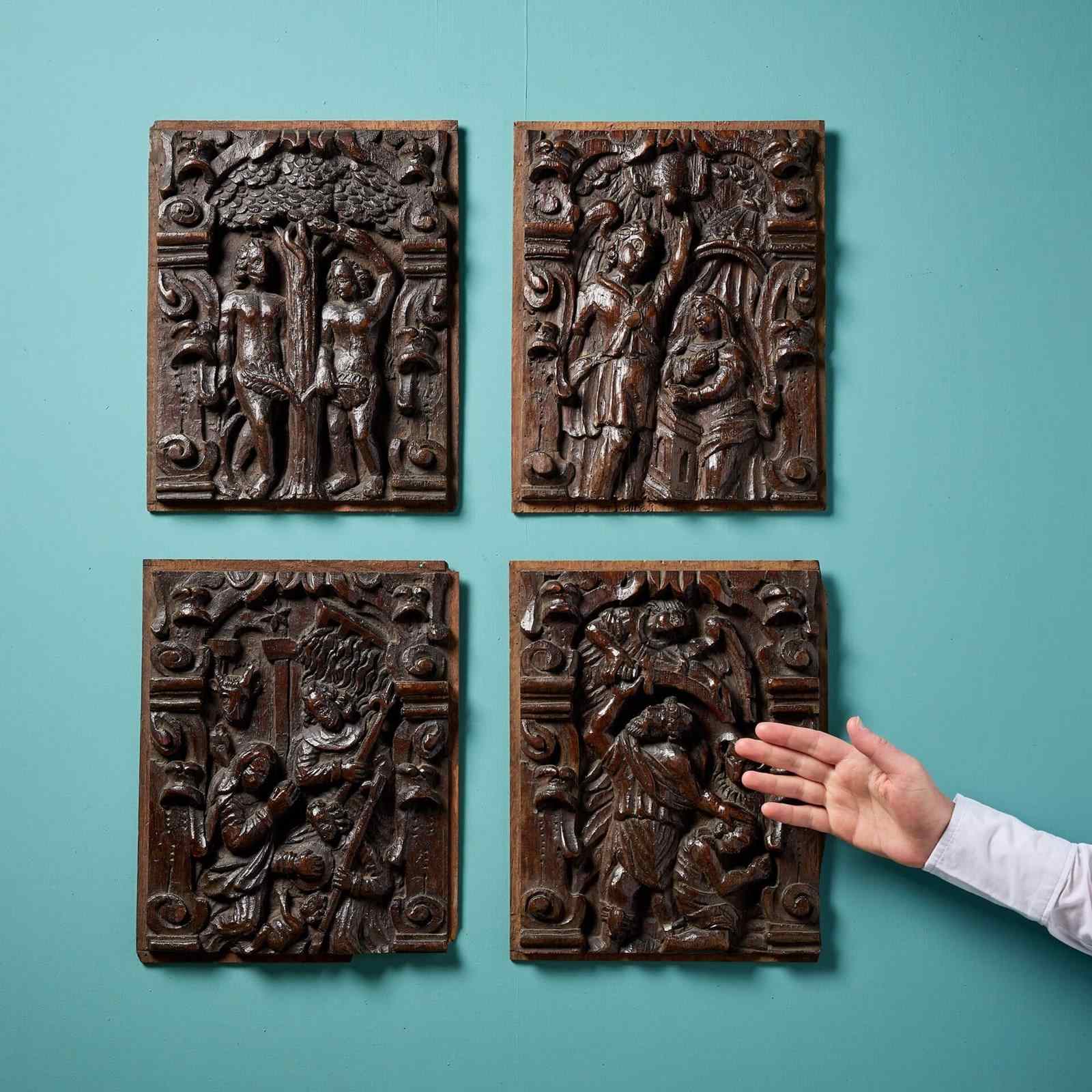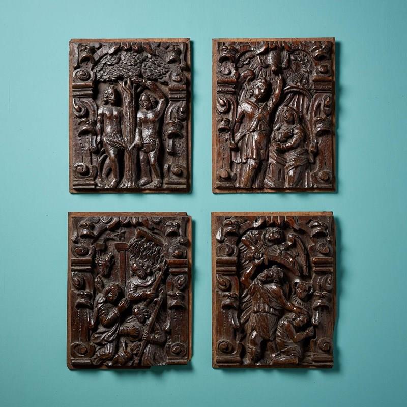 Set Of Four 17Th Century Carved Oak Panels Of Religious Scenes