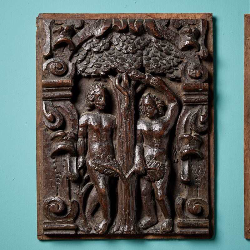 A set of four early 17th century carved oak relief panels depicting Adam & Eve and the Tree of Wisdom, the Annunciation, the Adoration of the Shepherds and the Sacrifice of Isaac.