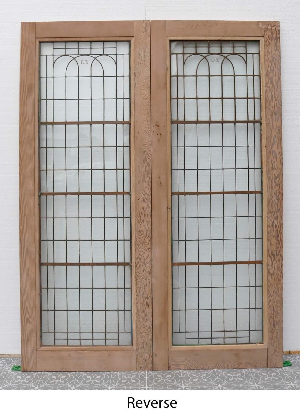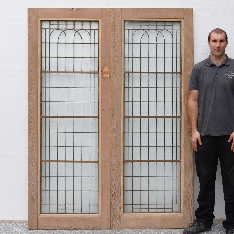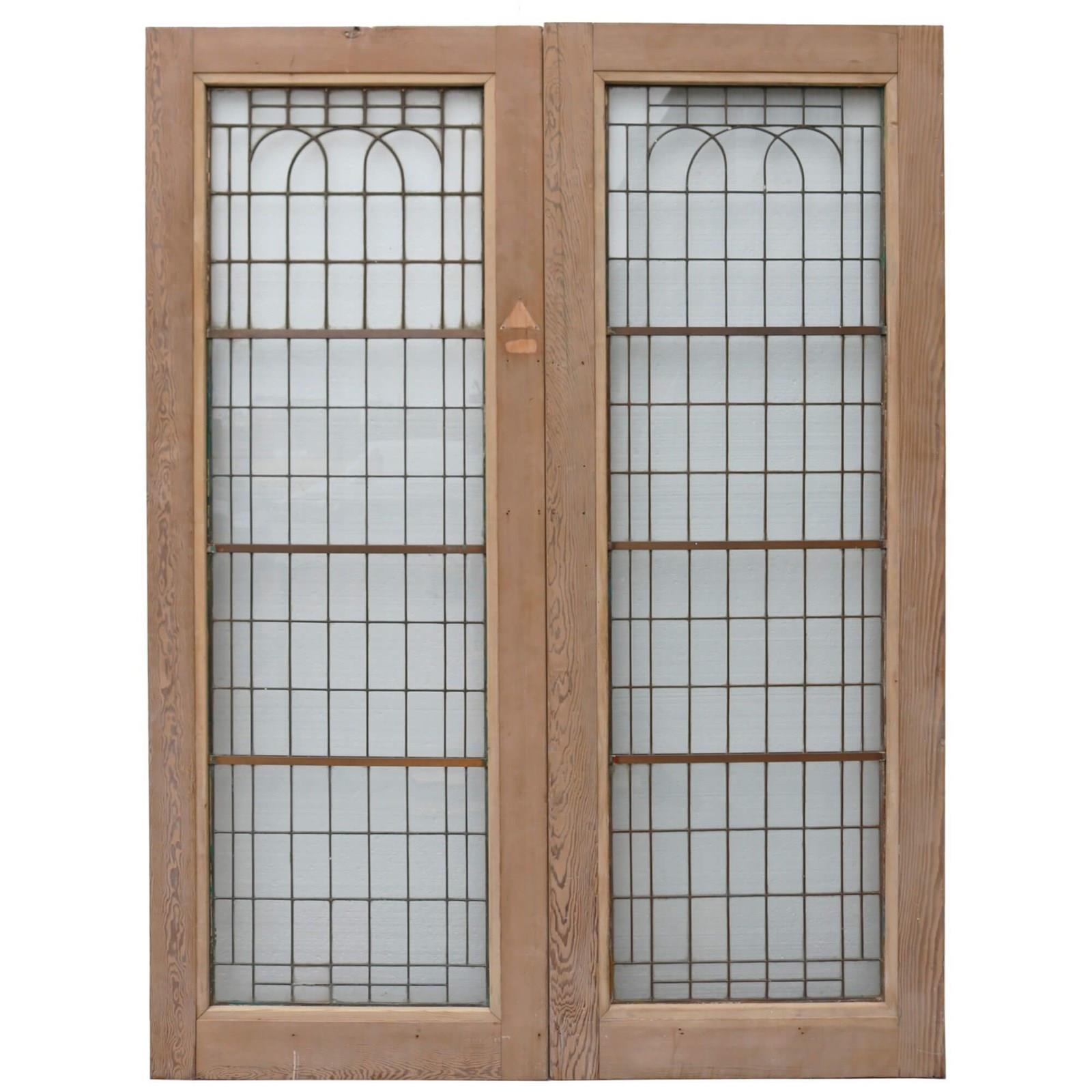 Good structural condition. Stripped and sanded to a natural wood finish. Edges are slightly rounded from when they were formally hung as swing doors. The glass has been removed, cleaned, and refitted loosely. This will require sealing in place.