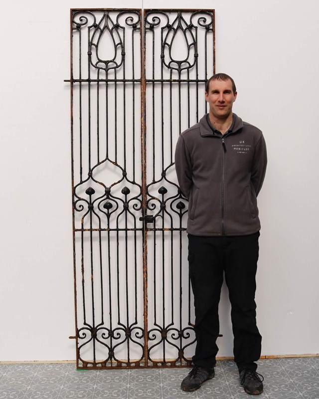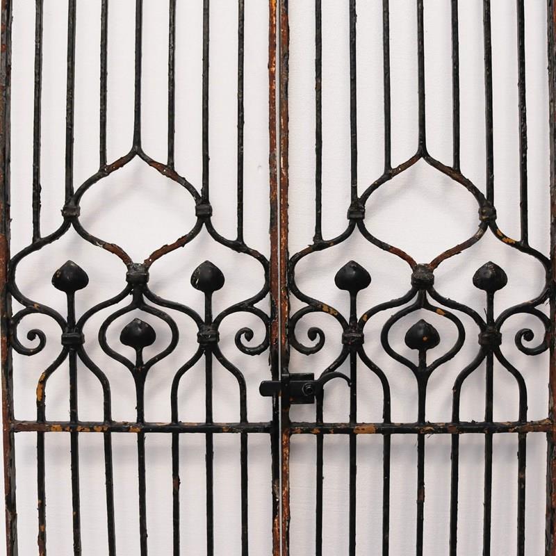 Standing at over 2m tall and crafted with closely knit vertical bars, these wrought iron gates provide excellent security for a passageway alongside a house or a narrow entrance to a walled courtyard. Beautifully made, each gate features a matching Art Nouveau inspired design to the top, base and centre, crafted at the hand of a talented 19th century blacksmith.