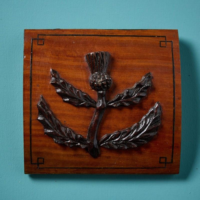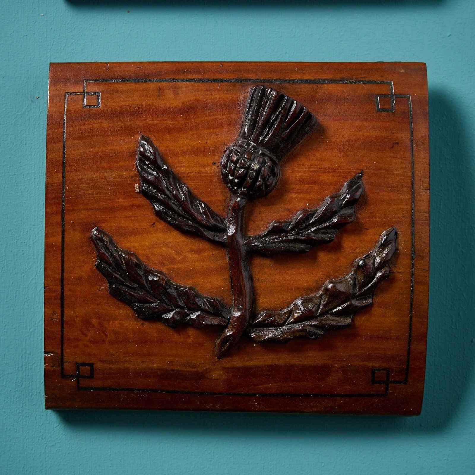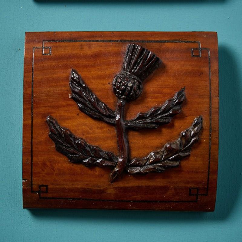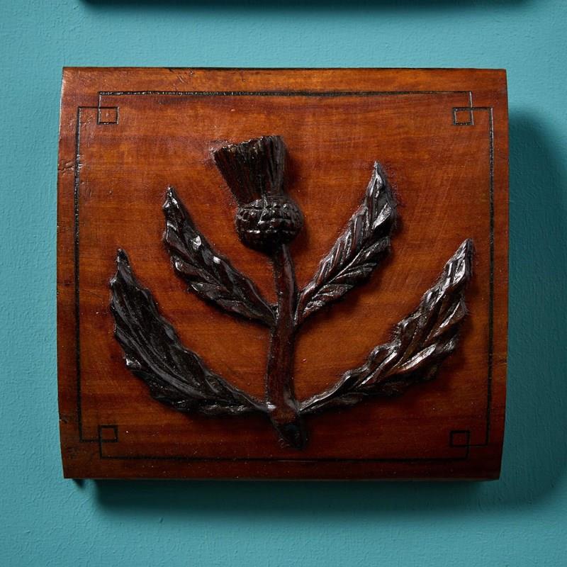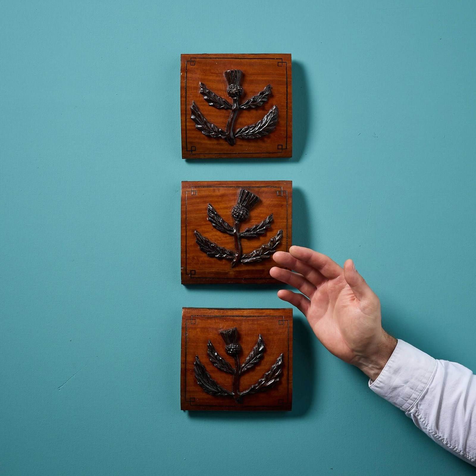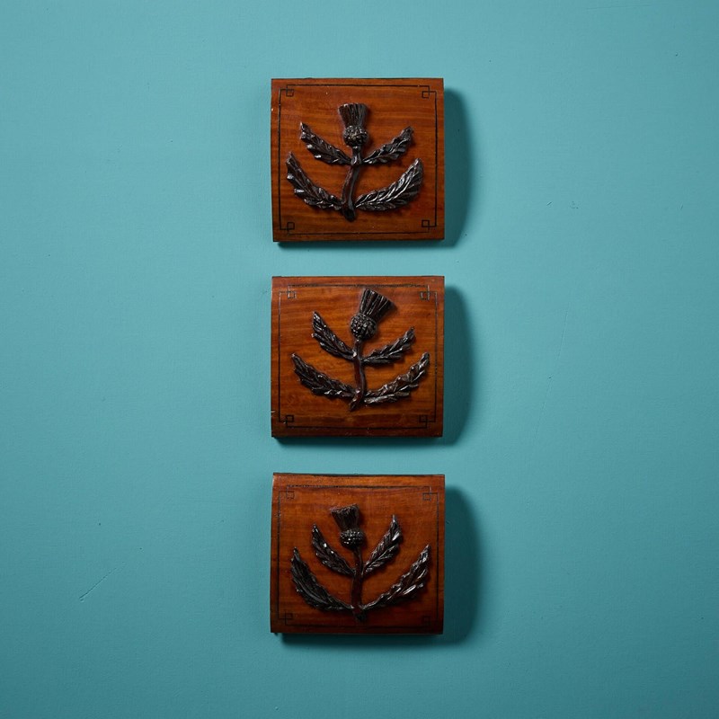 A set of three 19th century satin wood thistle plaques with raised composite carvings. This Scottish origin triptych is ready to hang in either a vertical or horizontal position. Dating from the 1830s, these ornate works were possibly once part of a larger architectural frieze, depicting gentle movements in their intricate details. INDIVIDUAL DIMENSIONS 14cm H x 15cm W x 3cm D1.5kg total weight CONDITION REPORT Good structural condition. Backs are slightly rough from removal. Edges are unfinished, as they may have been part of a larger architectural frieze.