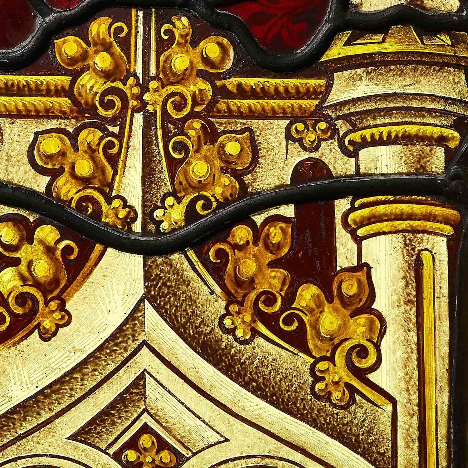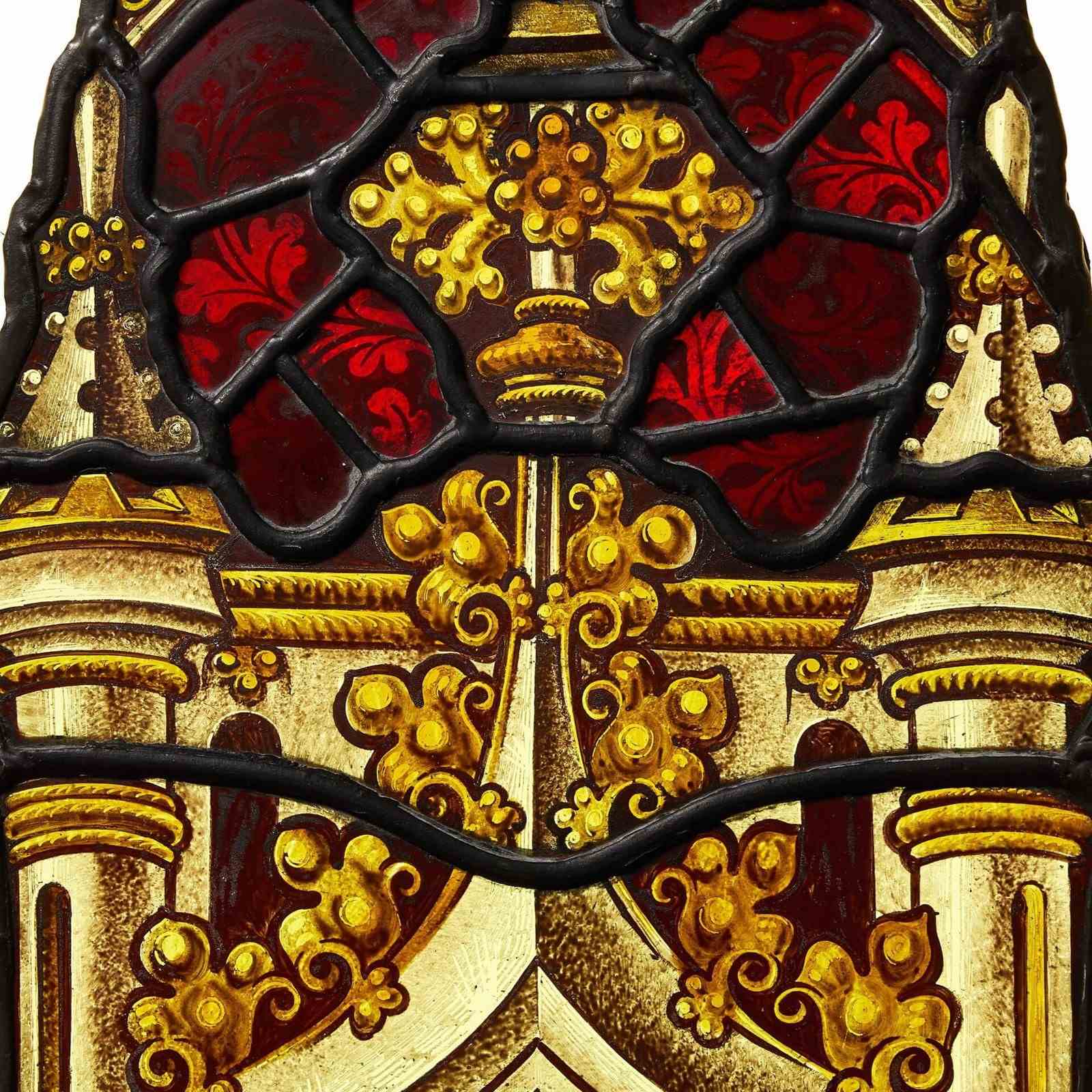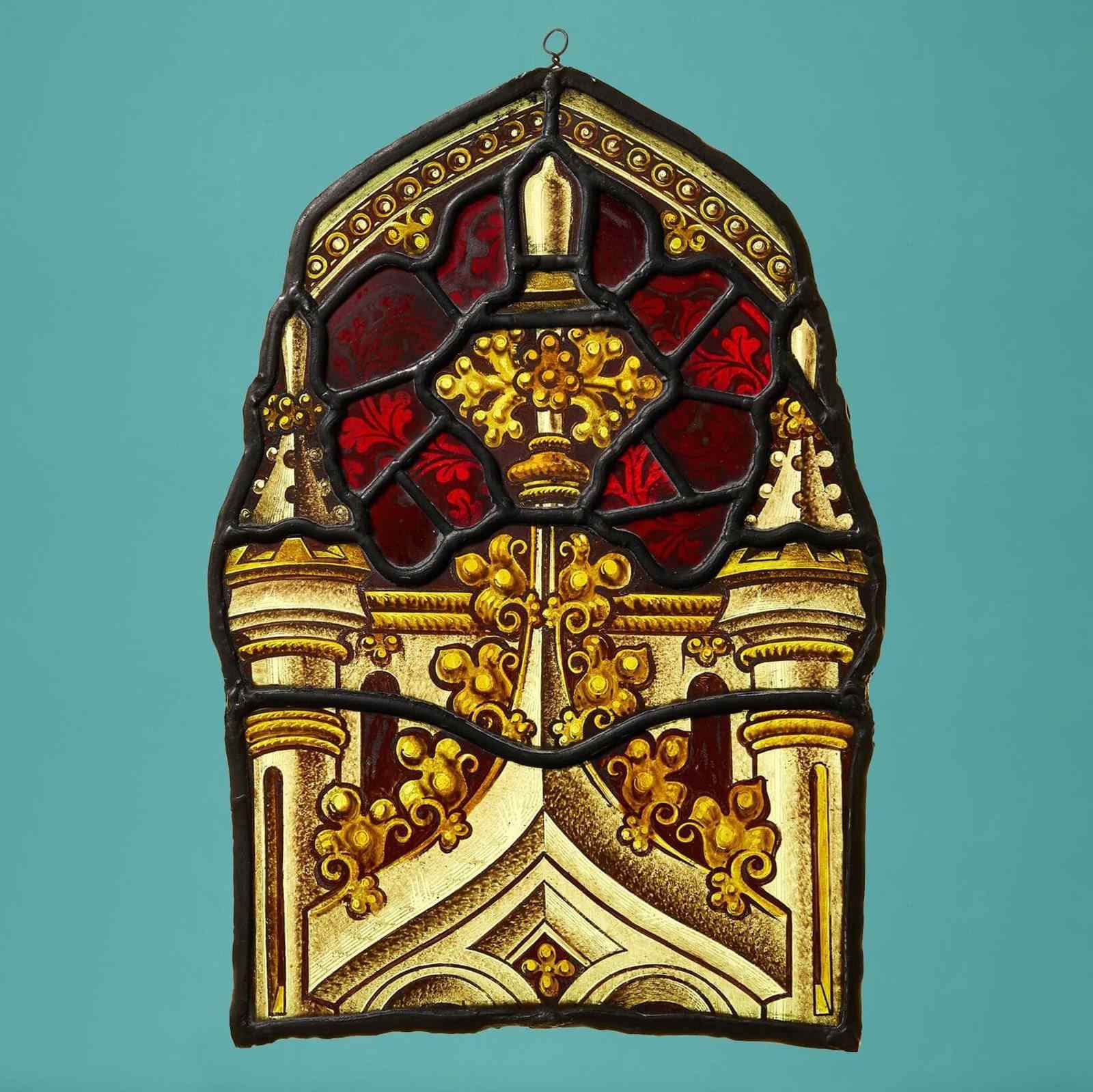 This stained glass window hanging depicts ecclesiastical style finials and arches, highlighted with gold and contrasted with red glass.