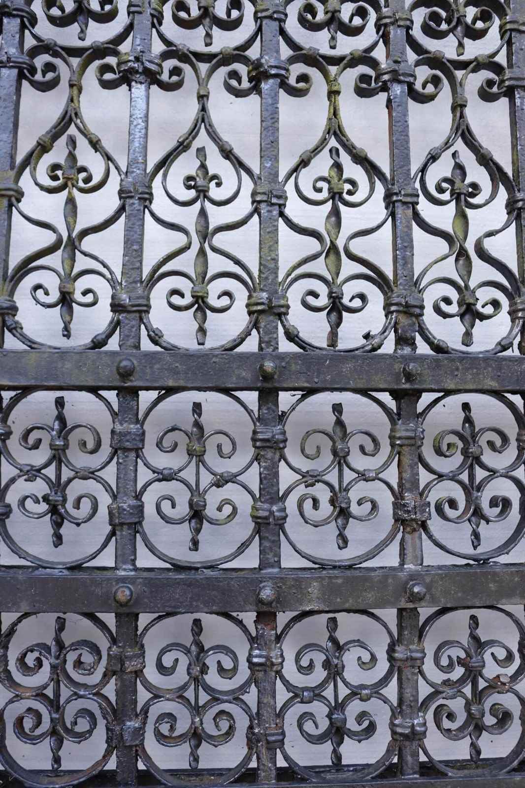 Good structural condition. Historic repairs. Old paint. Would benefit from being sand blasted and painted. Working latch. Latches to both sides. Drop bolt and stay.