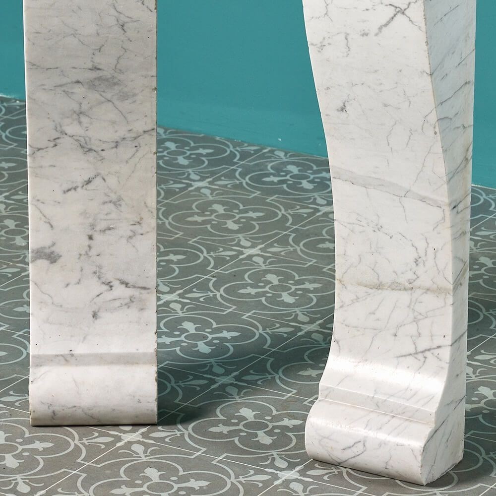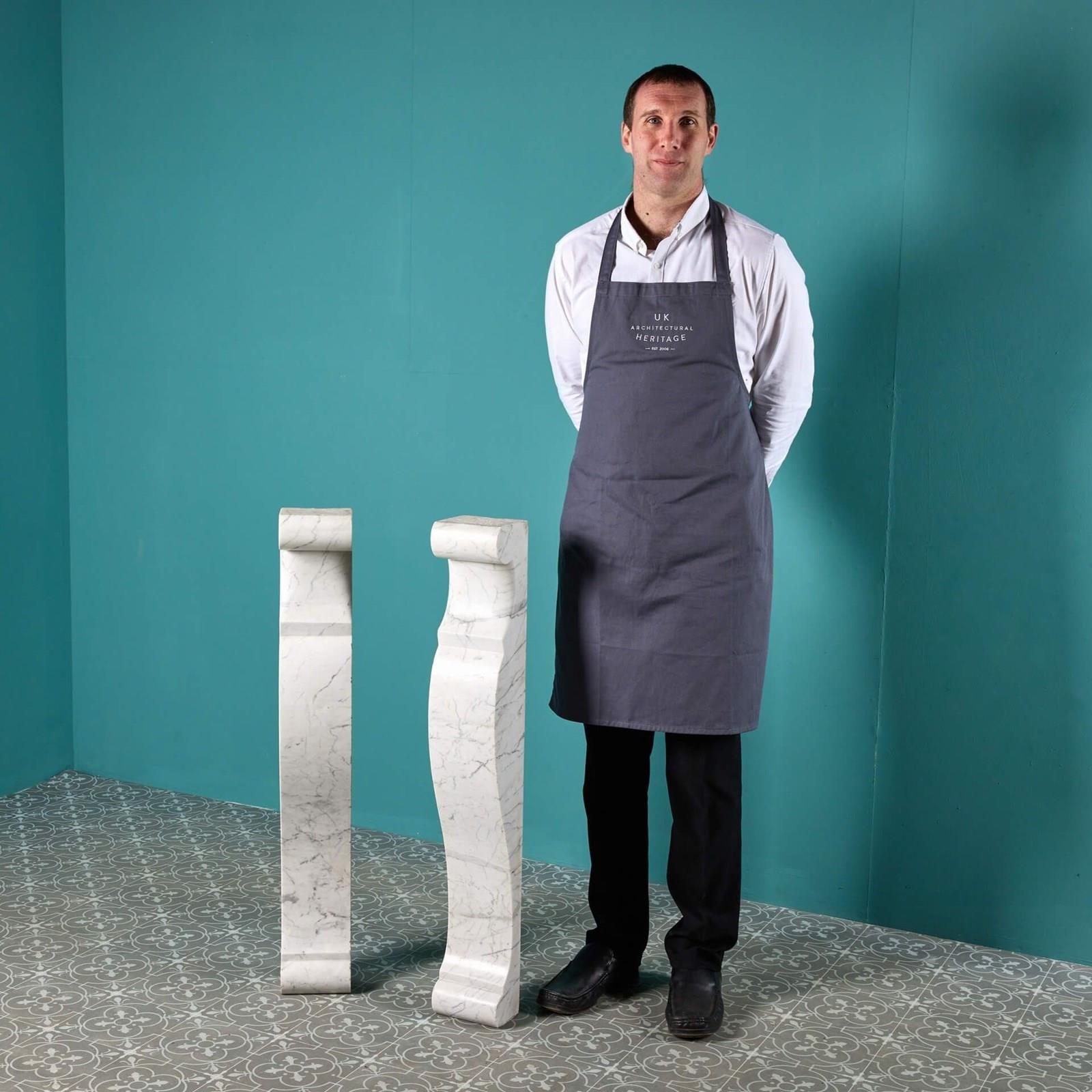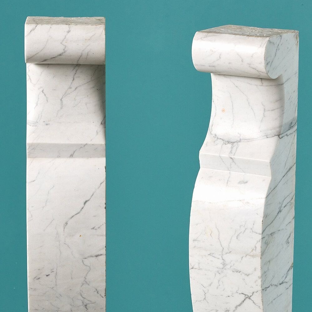 A stunning pair of carved antique Carrara marble corbels in good condition circa 1880. These tall, sleek marble corbels are of beautiful quality, the Carrara detailed with natural grey veining characteristic of this beautiful and popular marble. Once used as architectural decoration, these corbels can be used as sculptural items in an interior, their impressive scale and definition looking striking in any space. Alternatively, these marble corbels could be topped with glass to create a stylish console table or shelf, instilling any setting with timeless luxury.