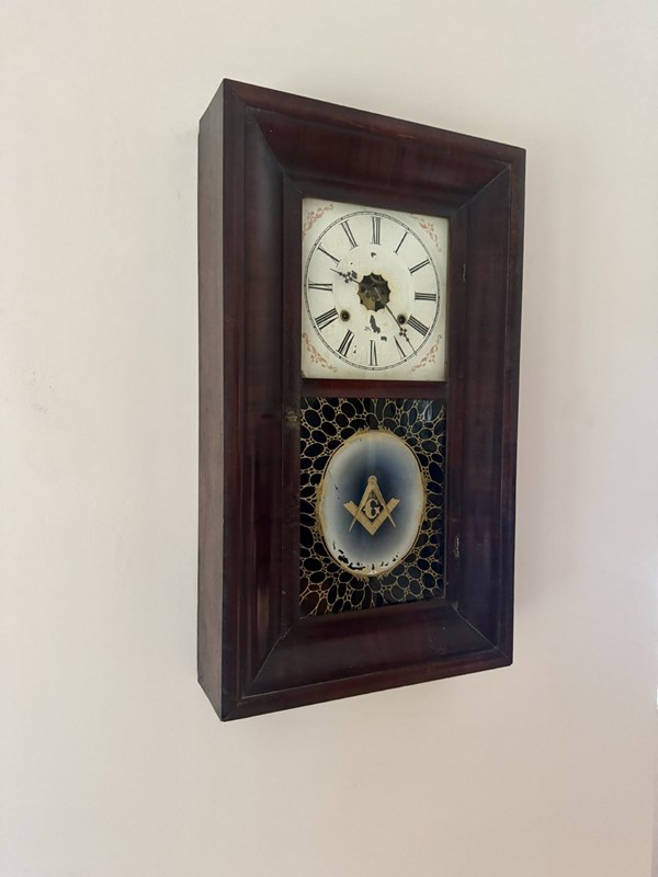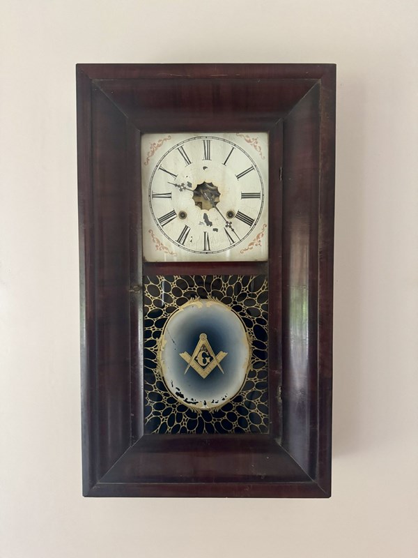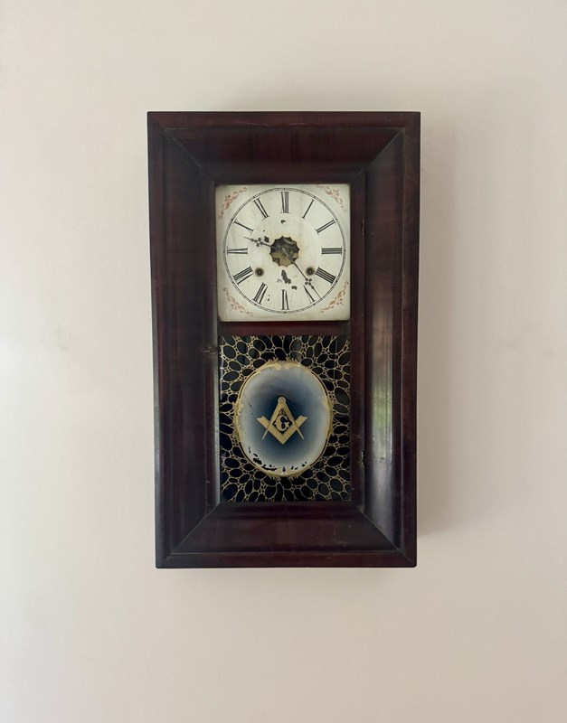 Antique 19th Century American mahogany wall clock, having a quality 19th century wall clock with a rectangular shaped case with a single glass panel to the front, having a painted dial to the top with black Roman numerals and black ornate hands above a painted masonic emblems panel, having the original drop down weighted pendulum, with a eight day movement striking on a gong. All clocks get serviced prior to delivery. D. 1860