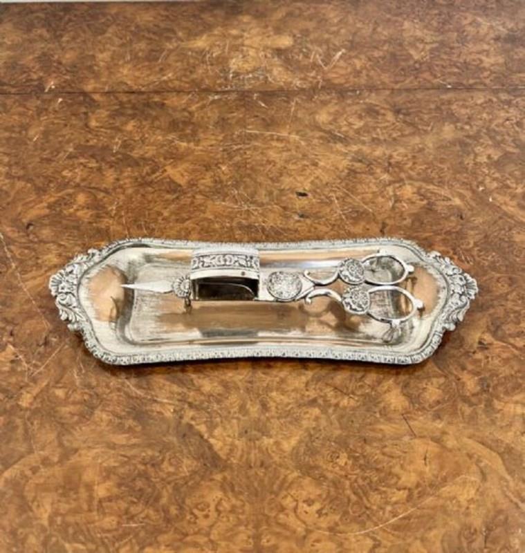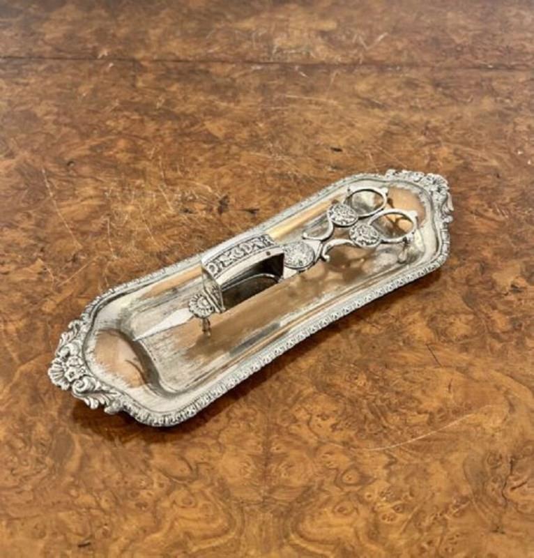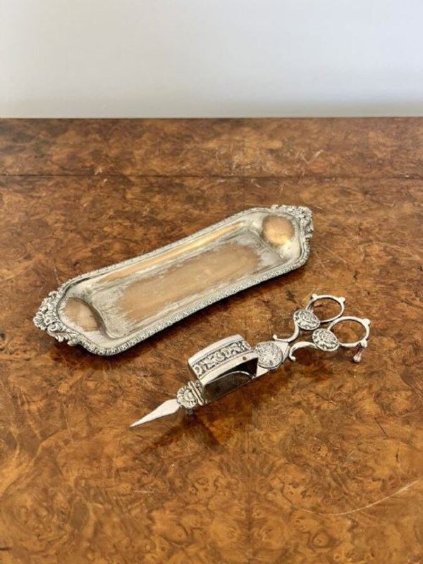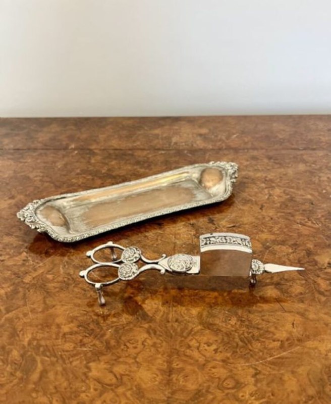 Pair of candle snuffers and tray having a lovely pair of electroplated candle snuffers and a wonderful ornate tray.