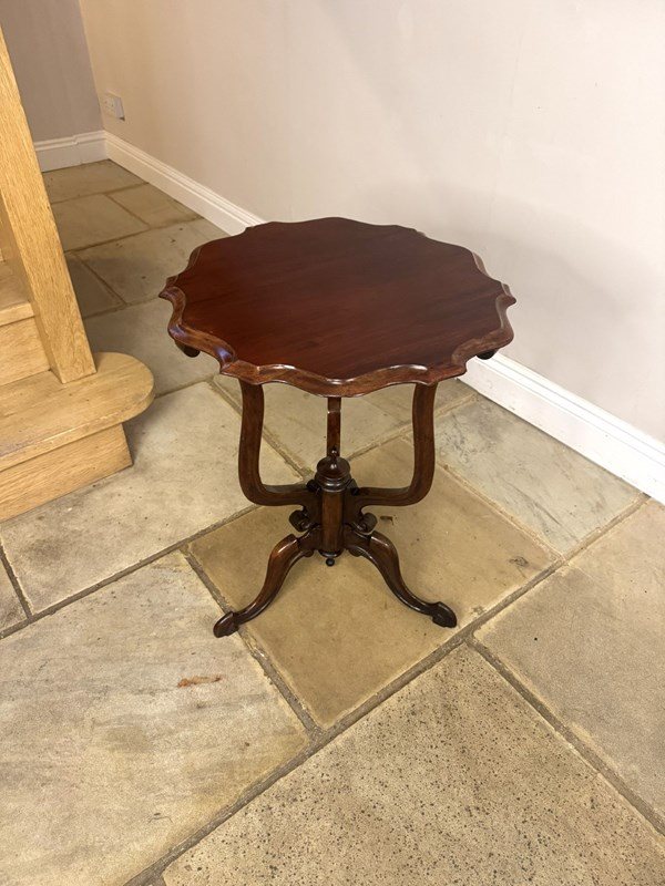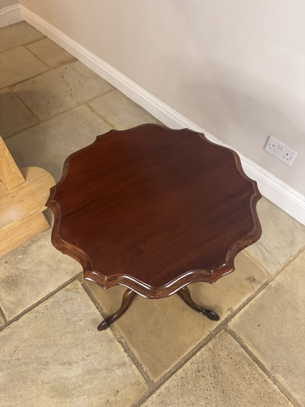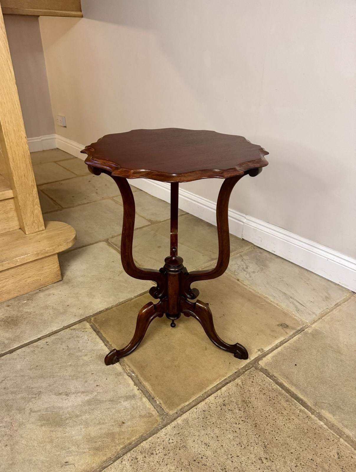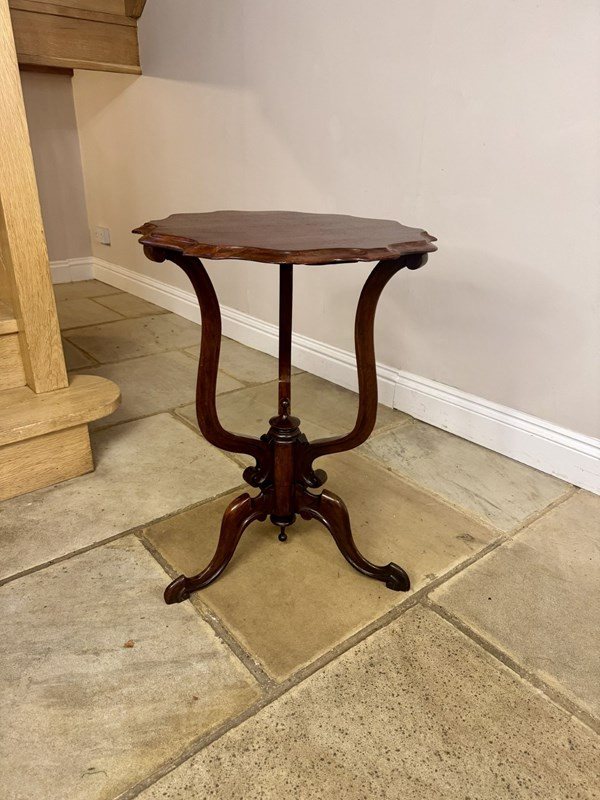 Elegant quality antique Edwardian mahogany occasional table, with a beautifully shaped top above a basket support turned centre column raised on three downswept legs terminating in scroll feet, with a polished finish. D. 1900