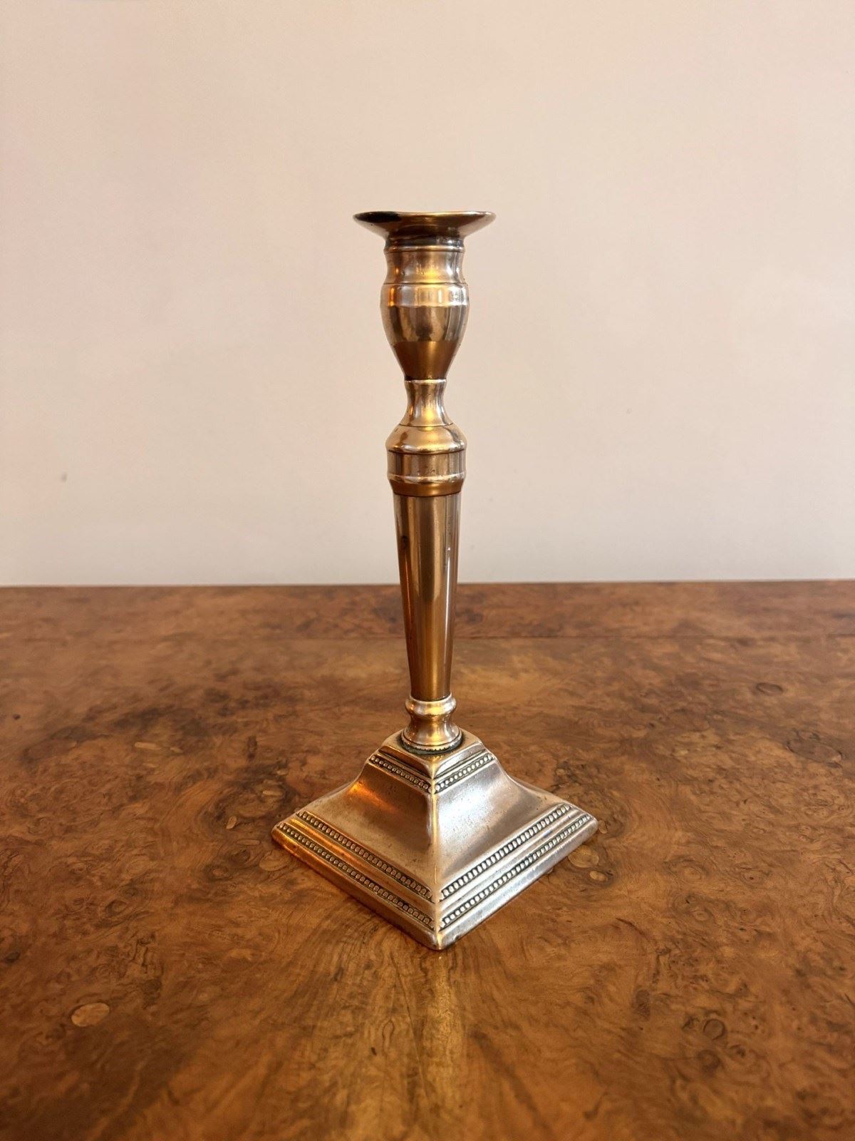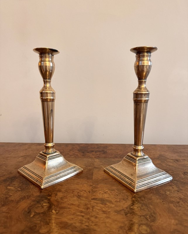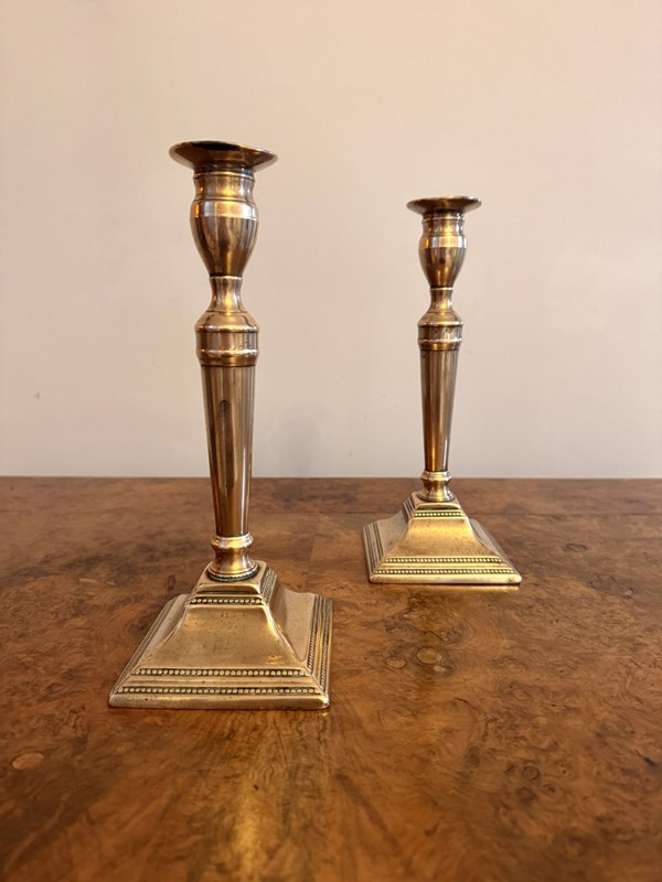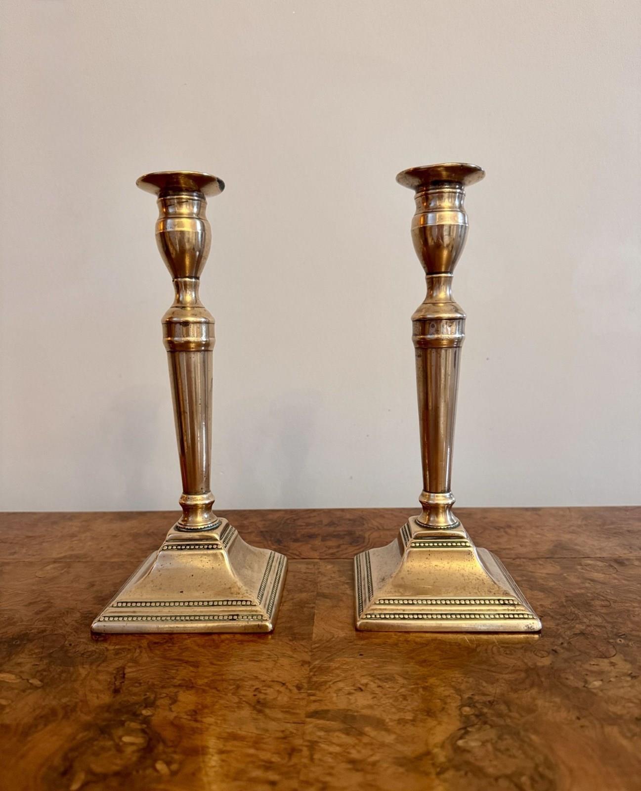 Elegant quality pair of antique Victorian brass candlesticks having a quality pair of antique brass candlesticks with turned columns raised on a stepped square brass base with beaded detail. D. 1880