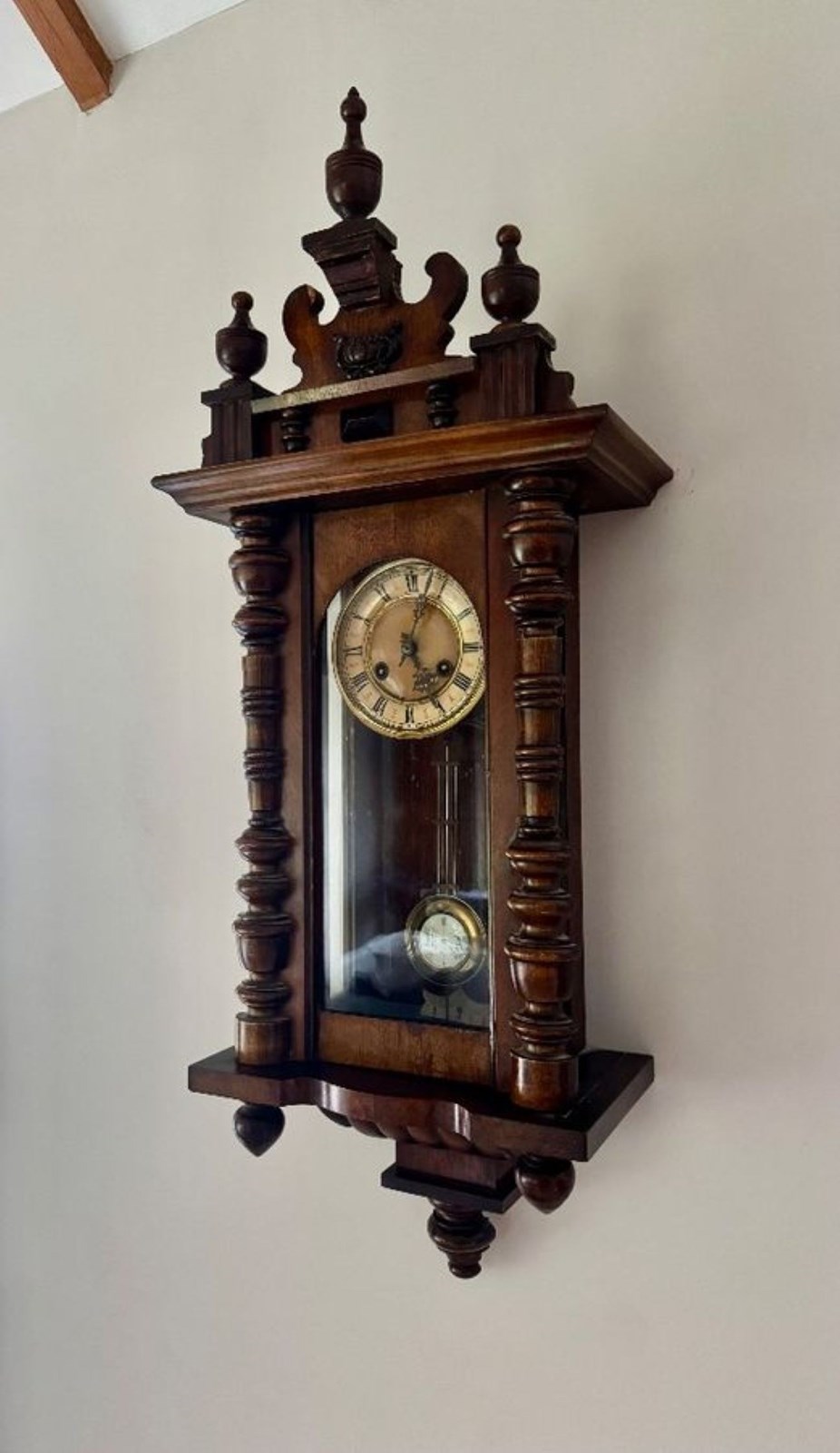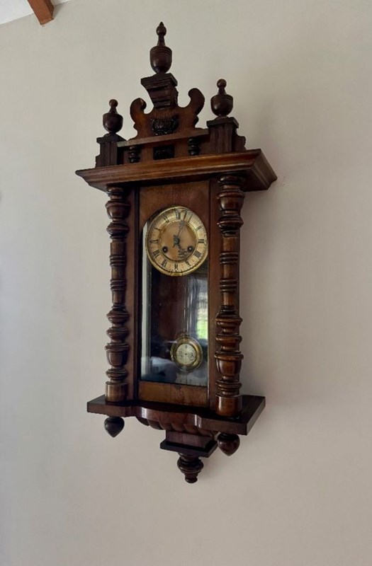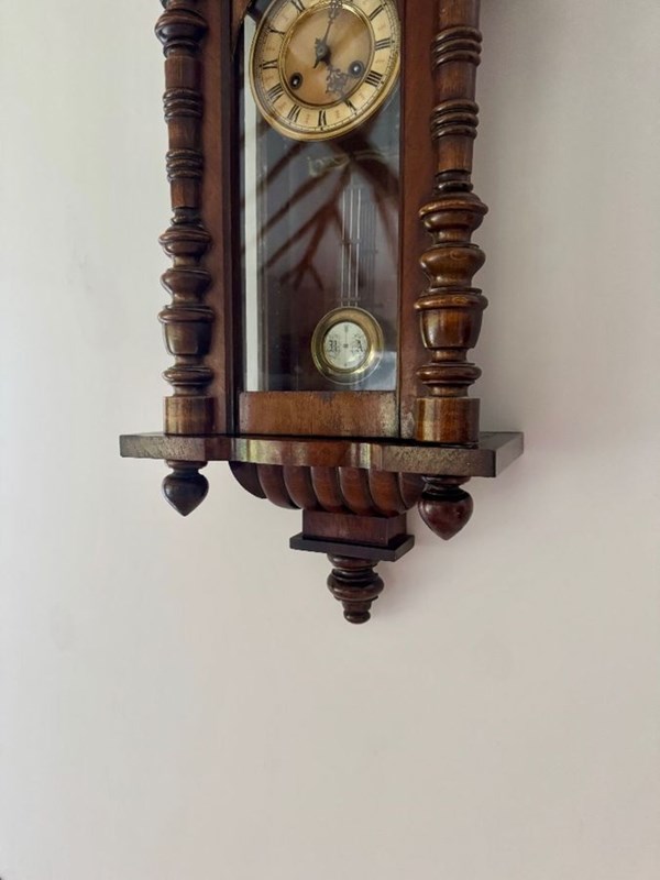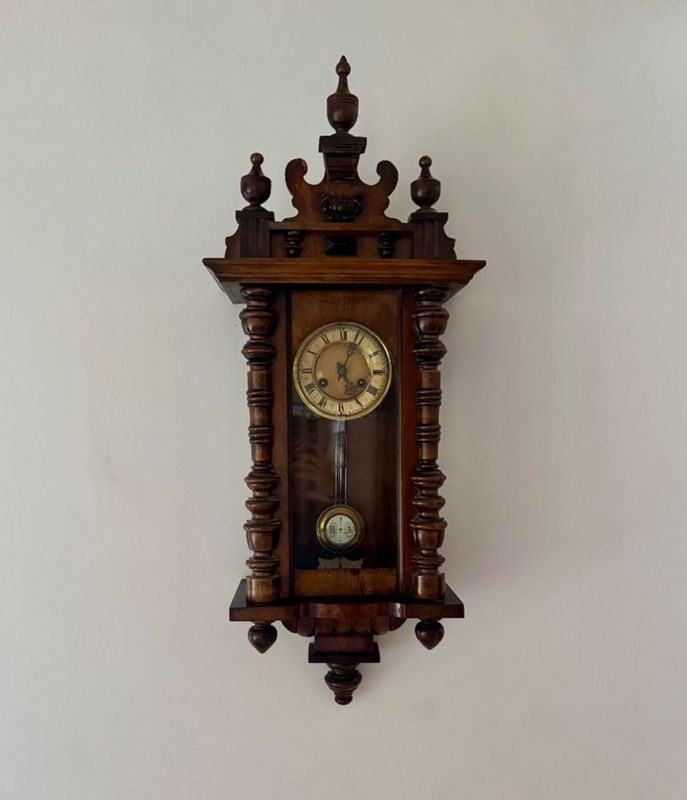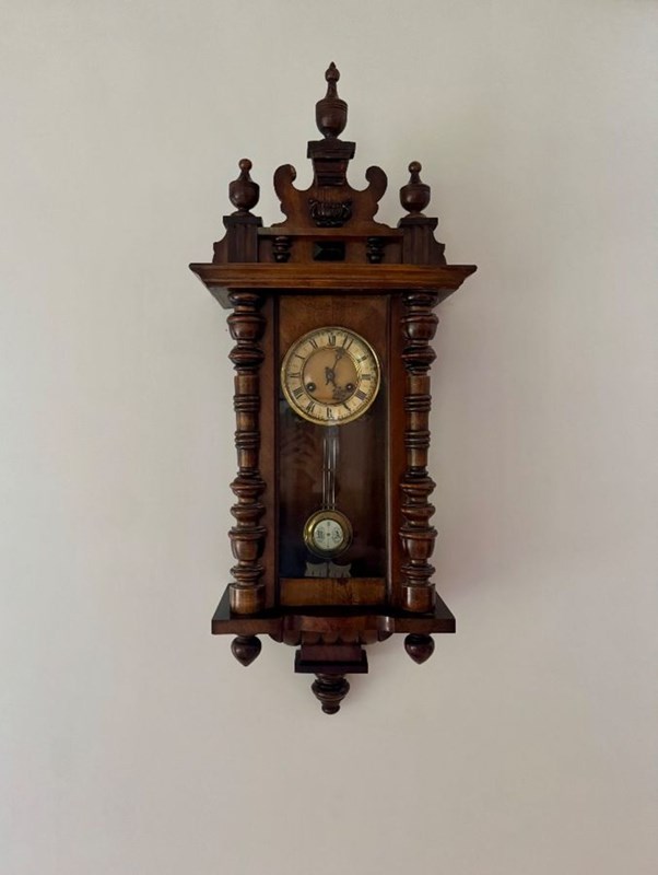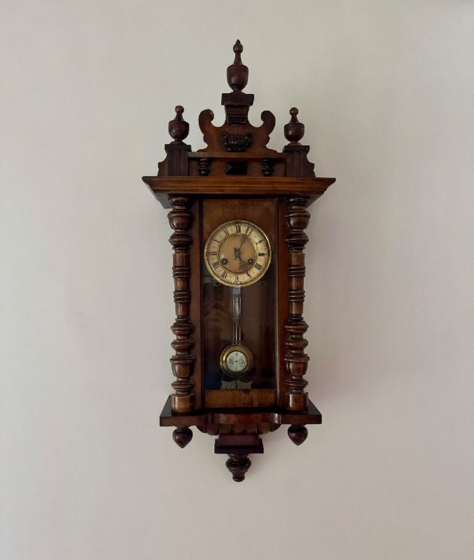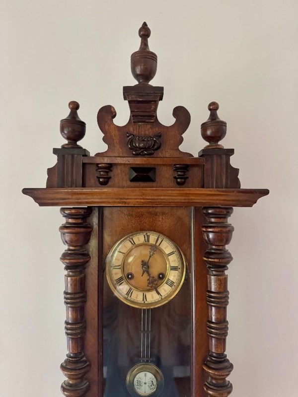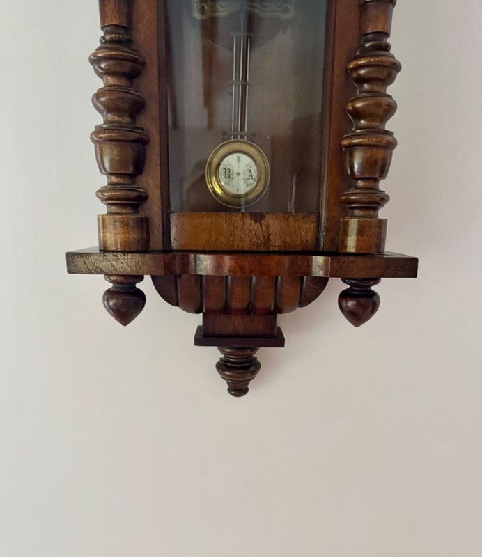 Excellent quality antique Victorian quality carved walnut Vienna wall clock having turned columns, original finale's with a shaped top and bottom. Single walnut glazed door opening to reveal a circular porcelain dial with the original hands with Roman numerals, having an 8 day movement striking the hour and half hour on a gong with the original pendulum and winding key.