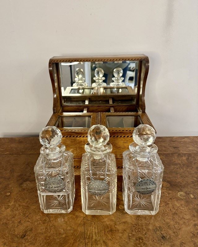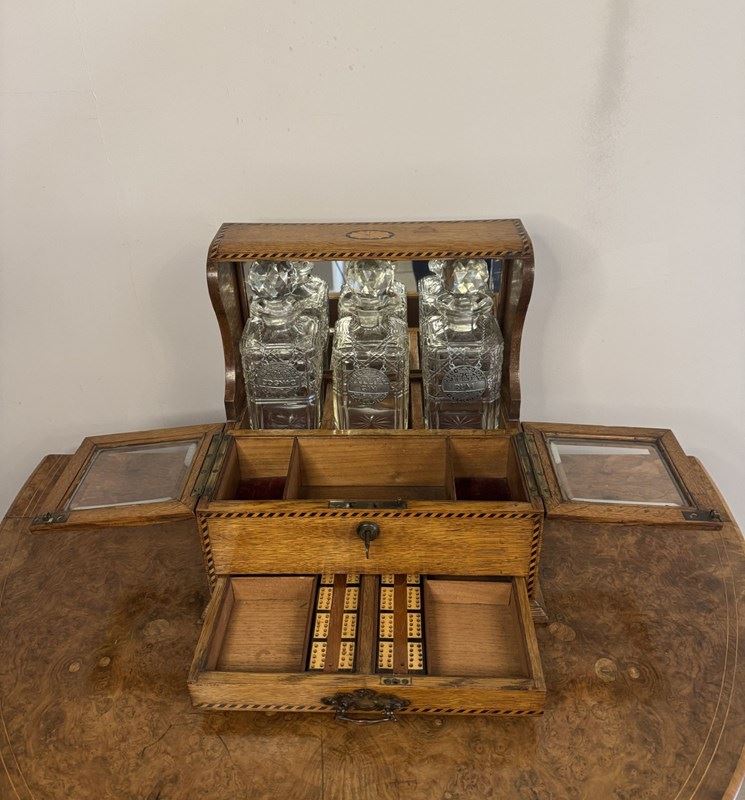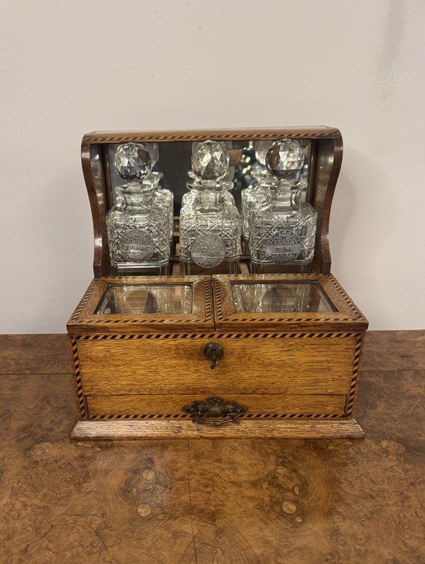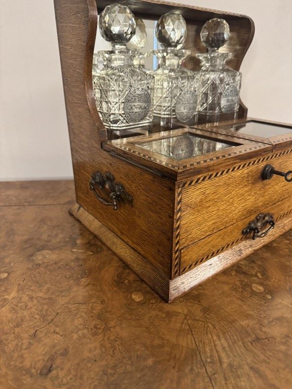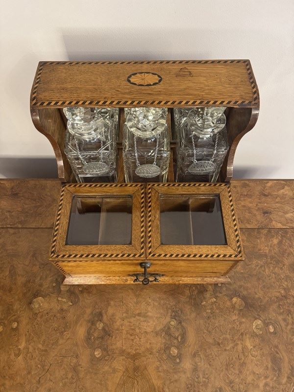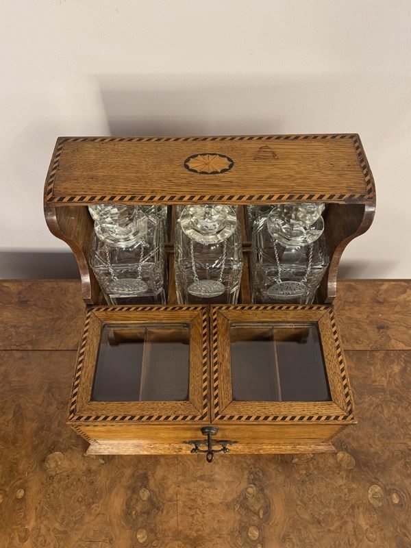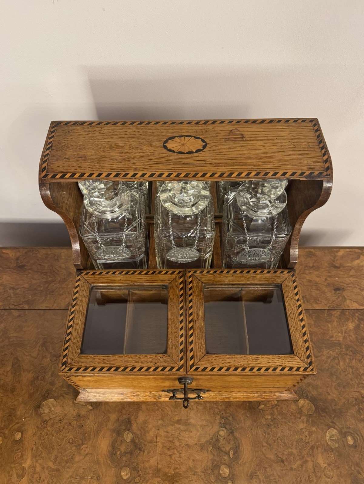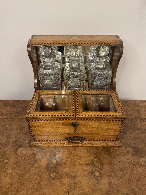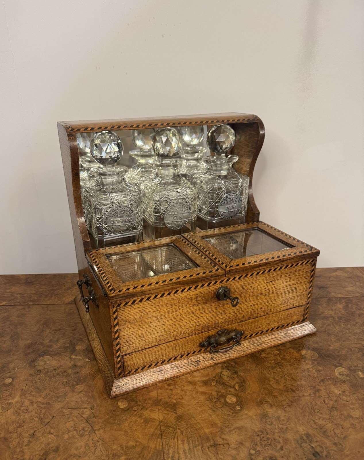 Exceptional Quality Antique Victorian Oak Marquetry Strung Tantalus