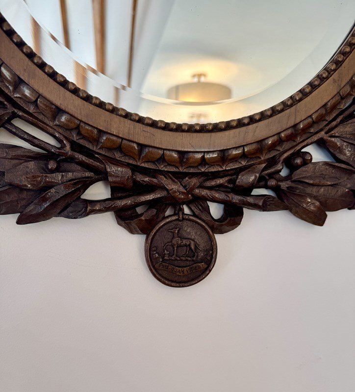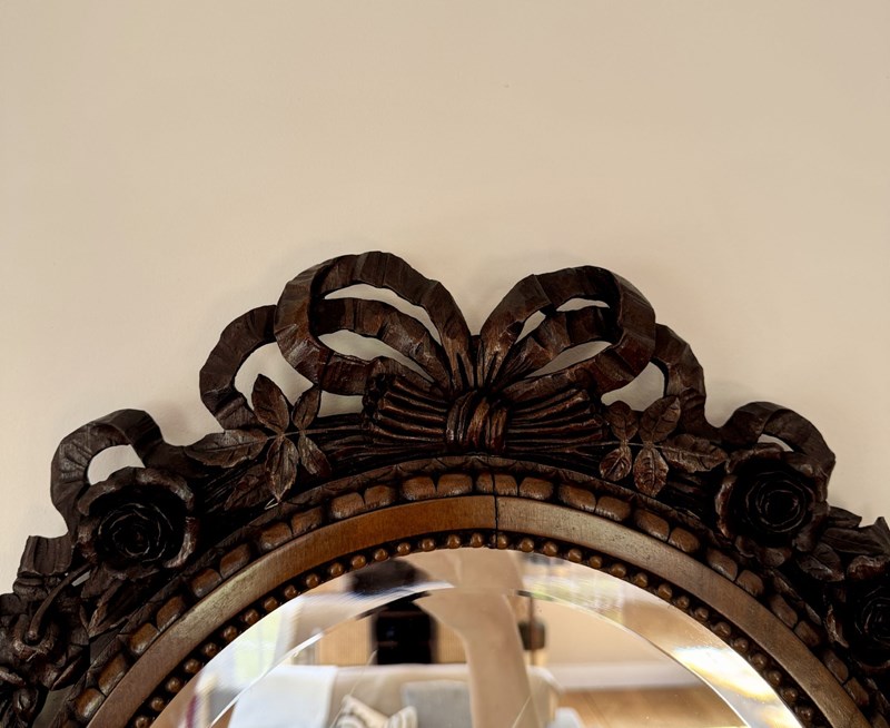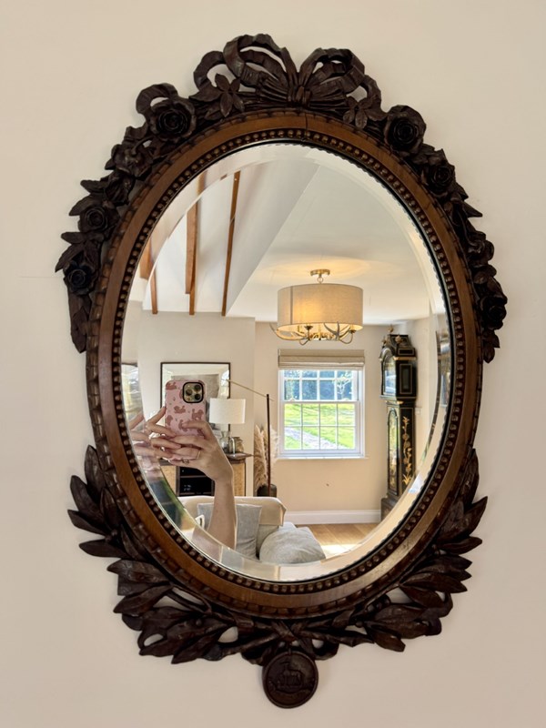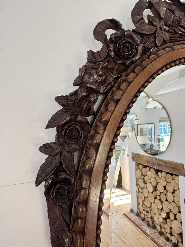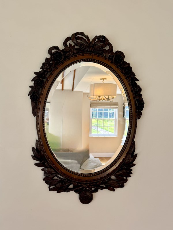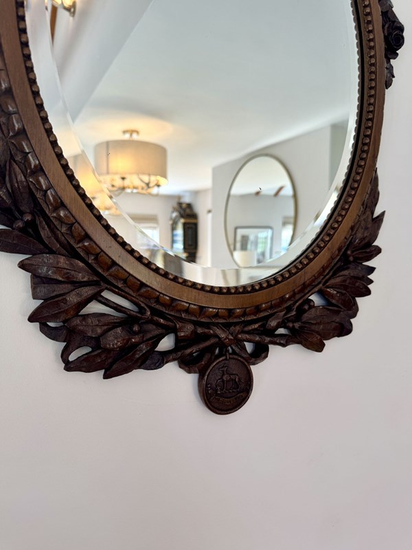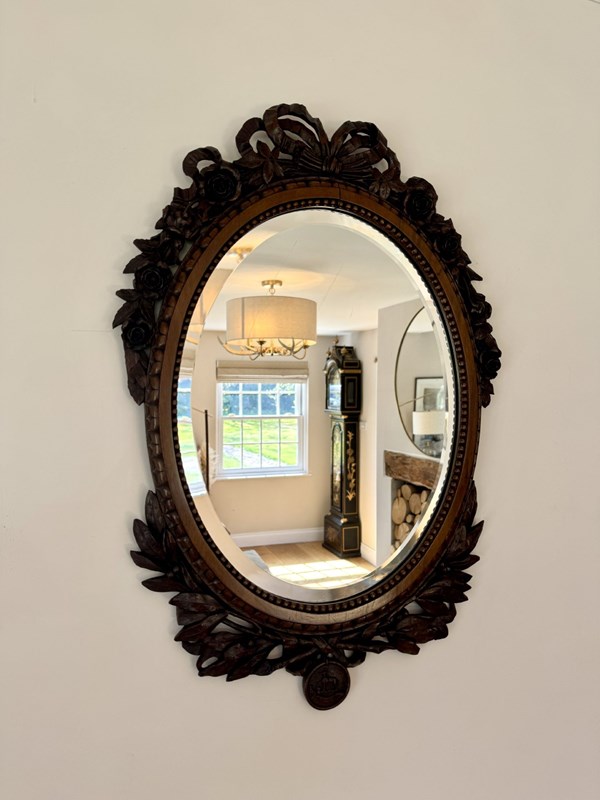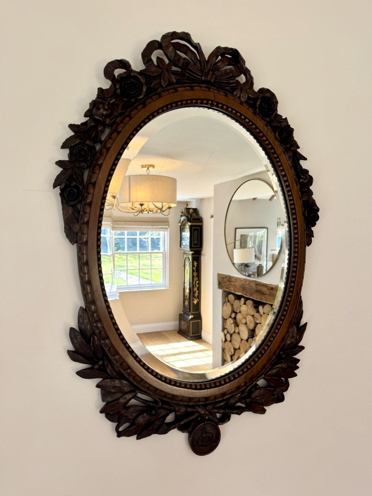 Fantastic quality antique 19th century carved oak wall mirror, having a quality highly carved oak frame casing an oval shaped mirror, the carved frame featuring intricate carvings of flowers, leaves and ribbon motifs, to the top of the frame is a large carved ribbon surrounded by budding roses & to the bottom is a medallion featuring a carved she-wolf. D. 1860
