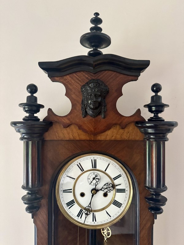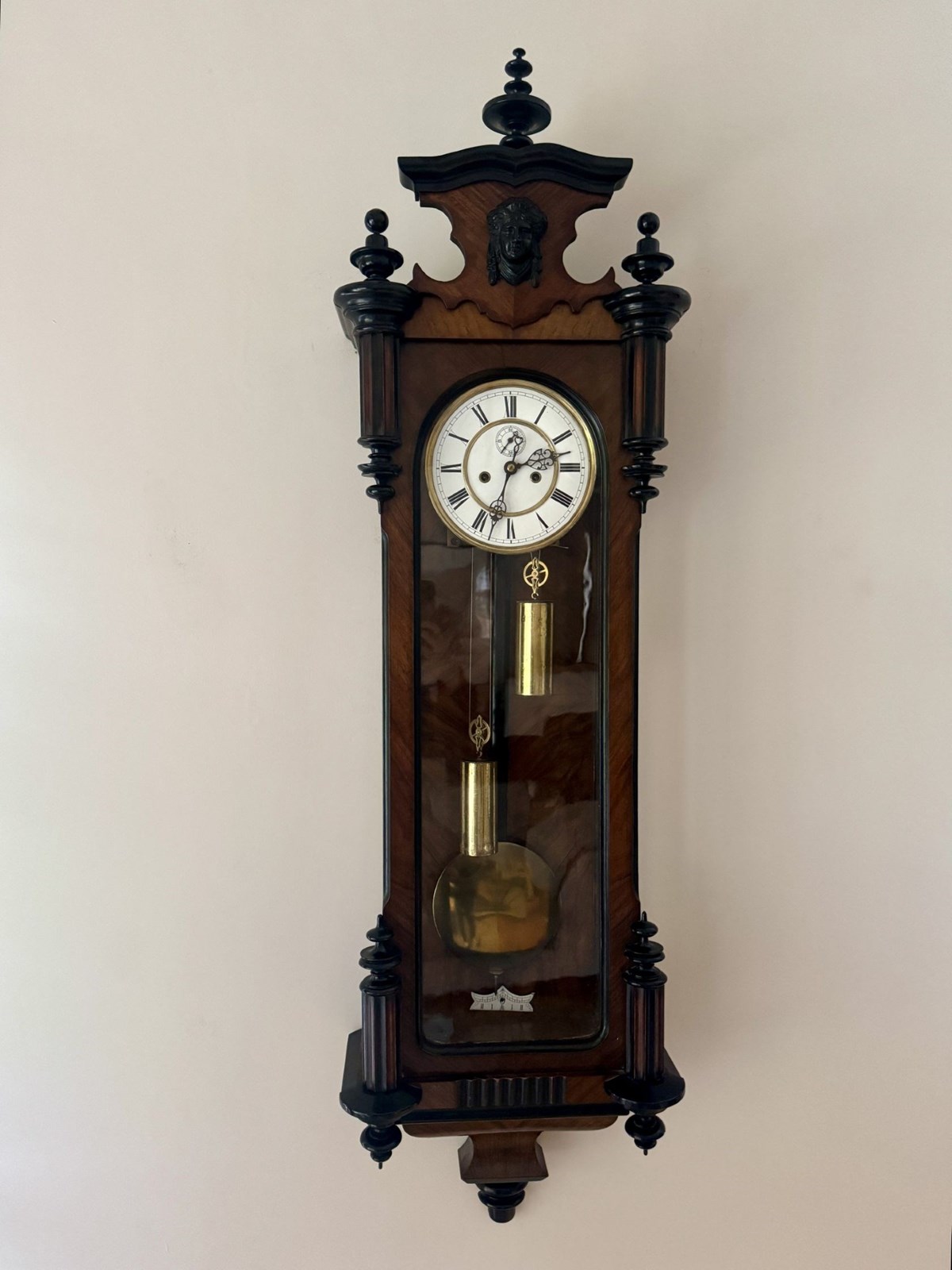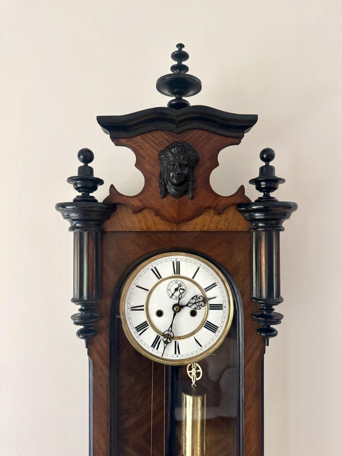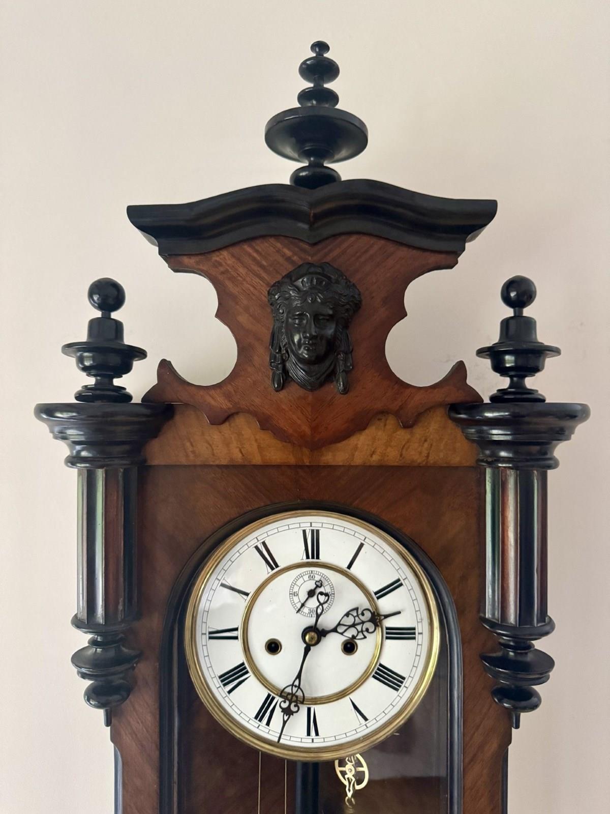 Fantastic quality antique 19th century walnut double weight wall clock, having a fantastic quality 19th century walnut ebonised wall clock, having a stunning carved walnut case with ebonized assets, with carved columns to the sides of the single glazed door, with a circular white enamel dial with black Roman numerals and black ornate hands cased within a brass bezel, having a quality eight day movement striking on a gong, with the original brass twin weights and circular brass pendulum, having the original carved ebonised finals to the shaped bottom and the top finished with a carved ebonised figural mount. D. 1860