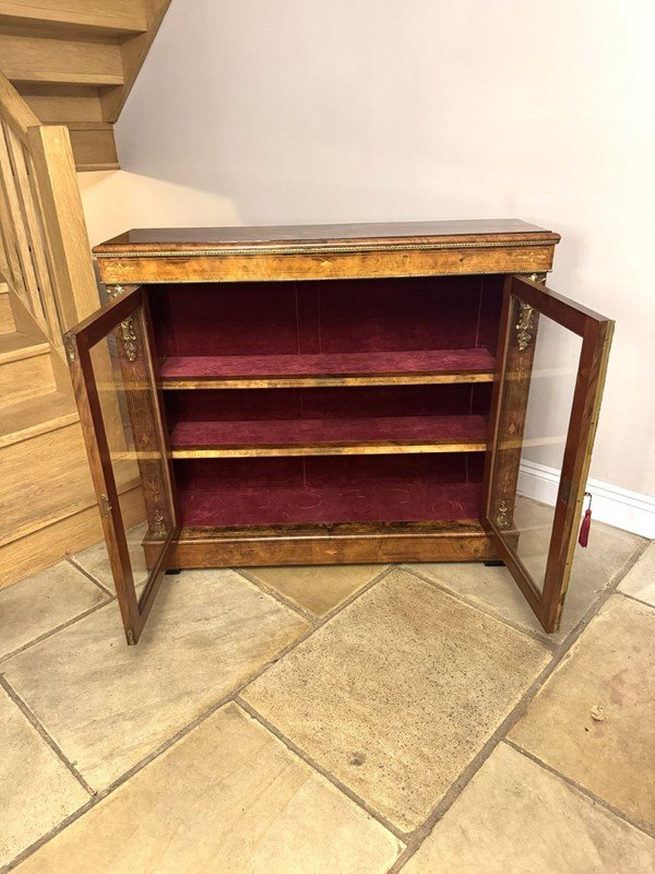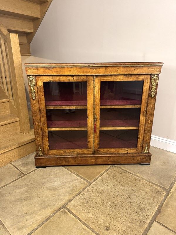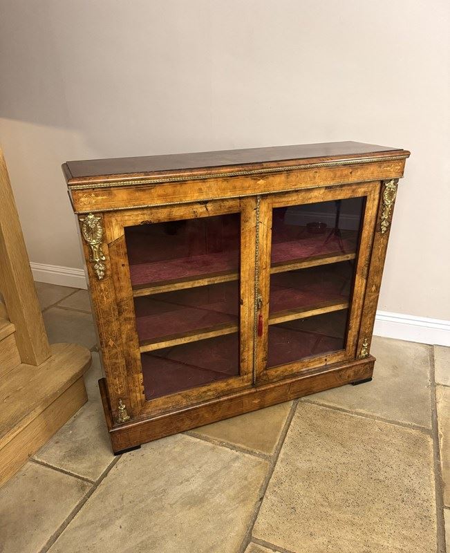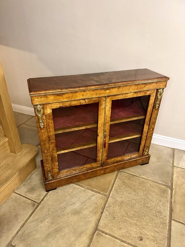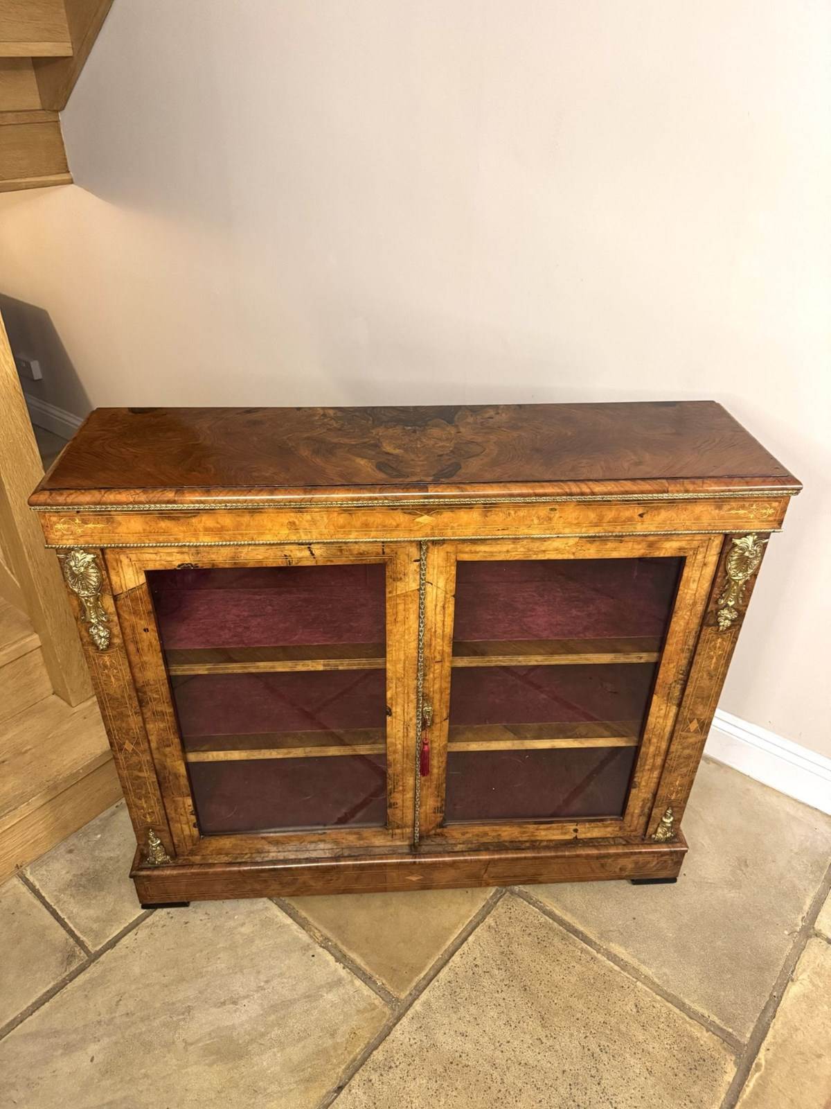 Fantastic quality antique Victorian figured walnut Pier cabinet, having a quality antique Victorian walnut pier cabinet with beautiful ormolu embellishment, having two glazed doors opening to reveal a velvet lined interior with two non-adjustable shelves standing on a plinth base decorated with satinwood line inlay. D. 1860