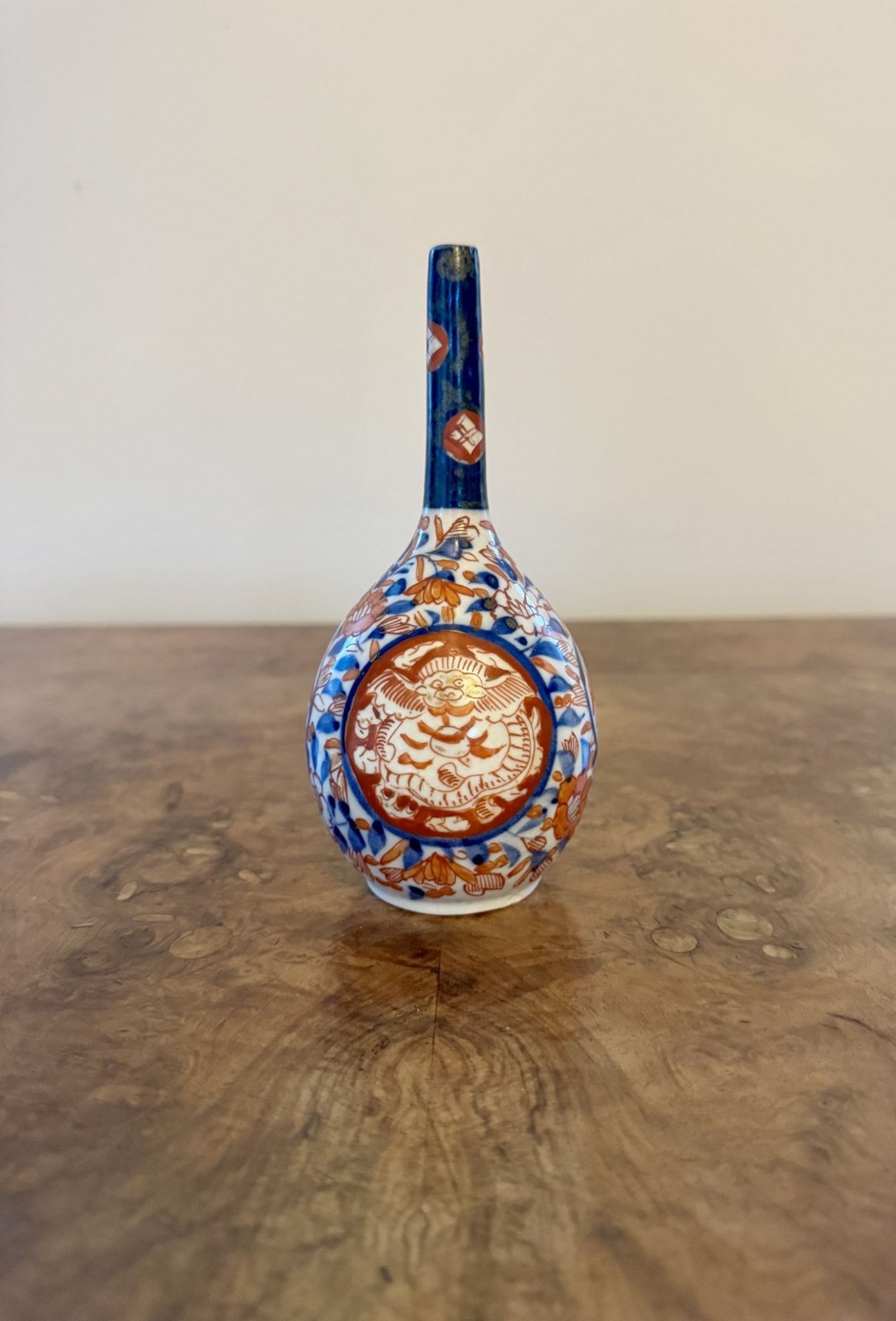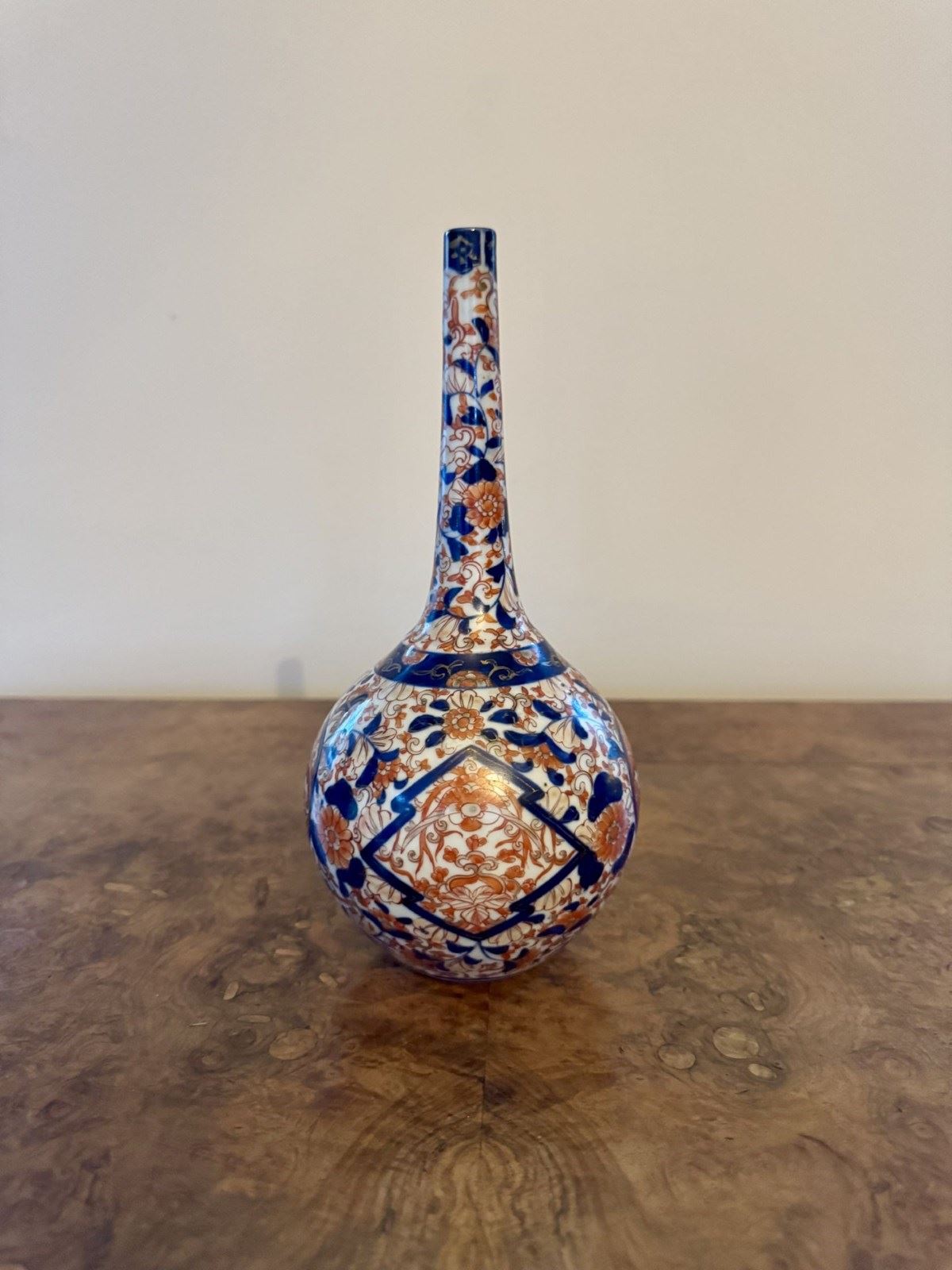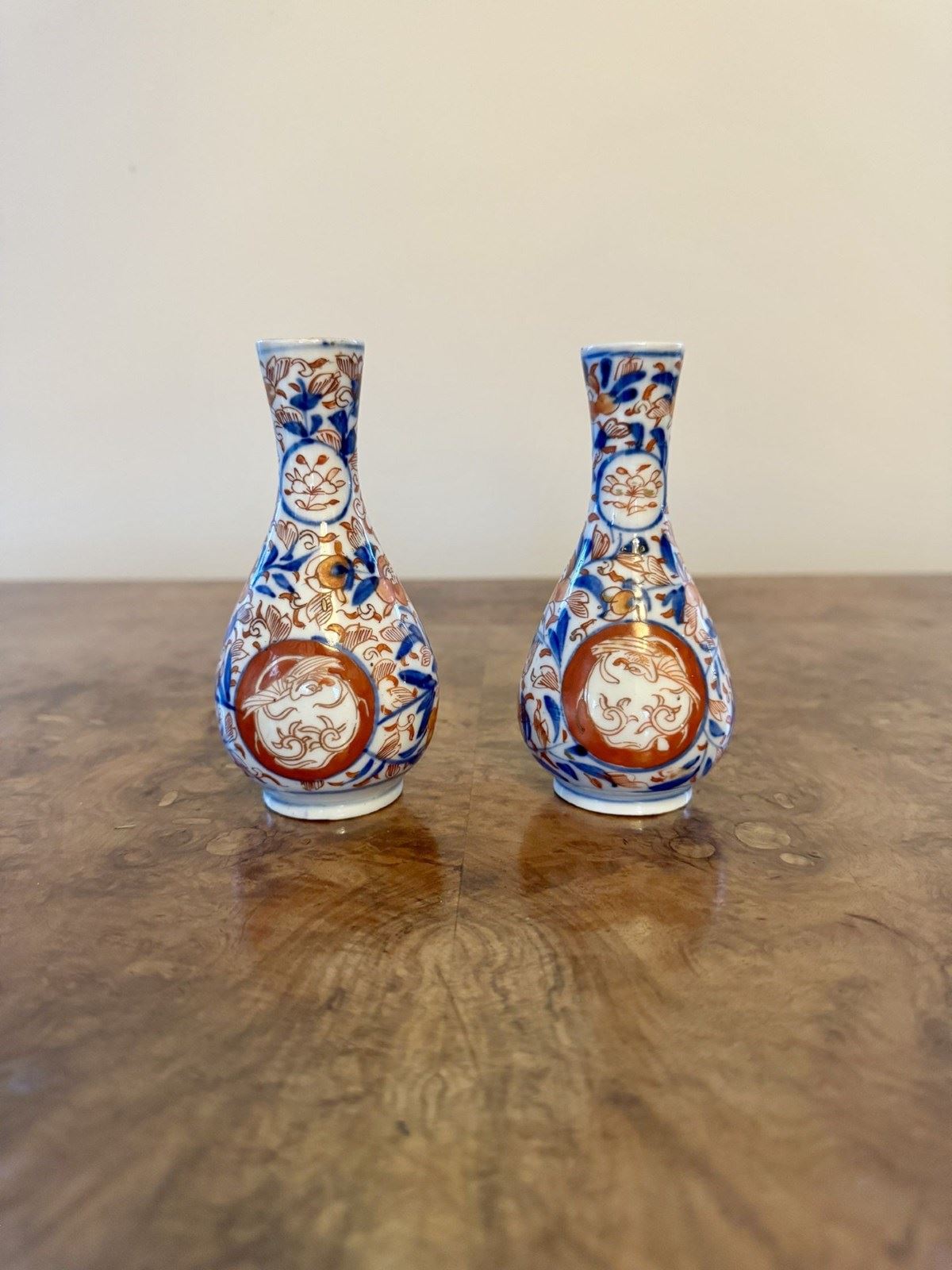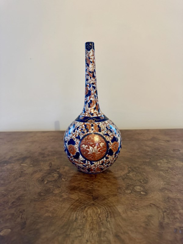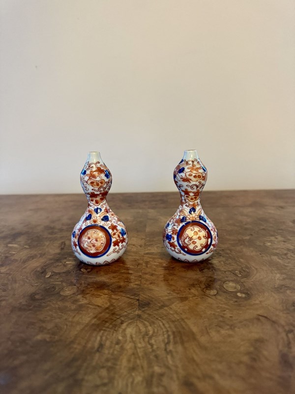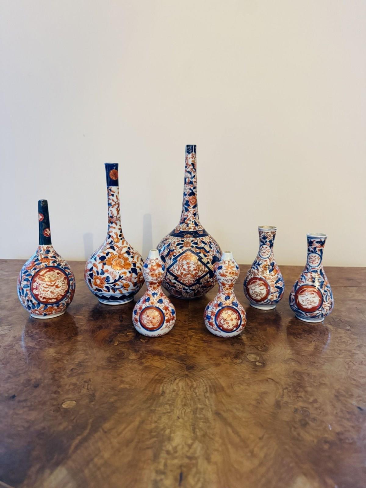 Fantastic quality collection of seven antique Japanese imari vases, having a fantastic quality collection of seven antique Japanese imari vases comprising of two pairs of smaller shaped vases, and three bottle shaped vases, all of a similar colour pallet hand painted with wonderful red, blue and white colours. D. 1900