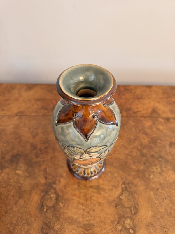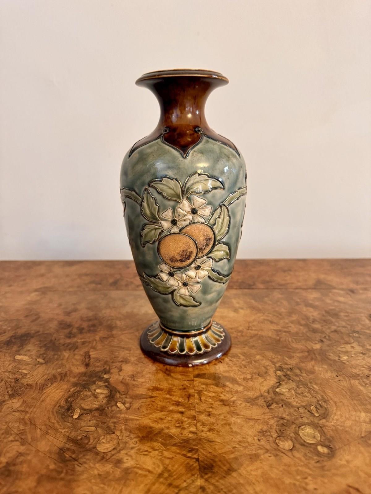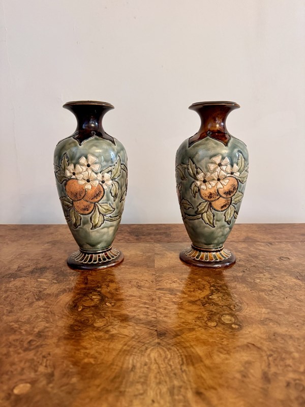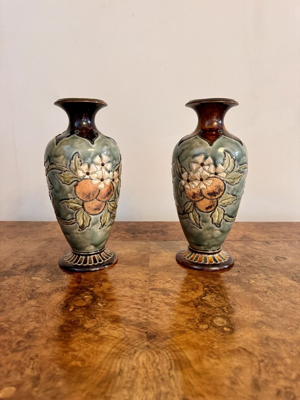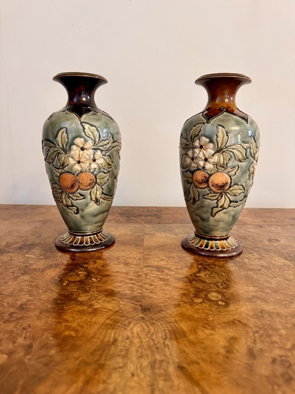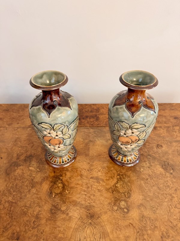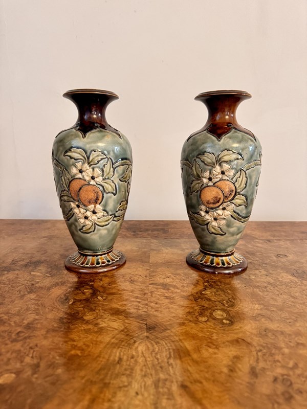 Fantastic quality pair of Doulton Lambeth vases by Eliza Simmance, having a quality pair of Doulton Lambeth vases with a bulbous shaped body decorated with relief decoration with fruit, flowers, leaves and blossoms in orange, green and cream colours on a green ground, with a brown slender fluted shaped neck, raised on a circular shaped base with a decorative scalloped pattern hand painted in green and brown tones. Stamped & signed to the base as shown. D. 1884