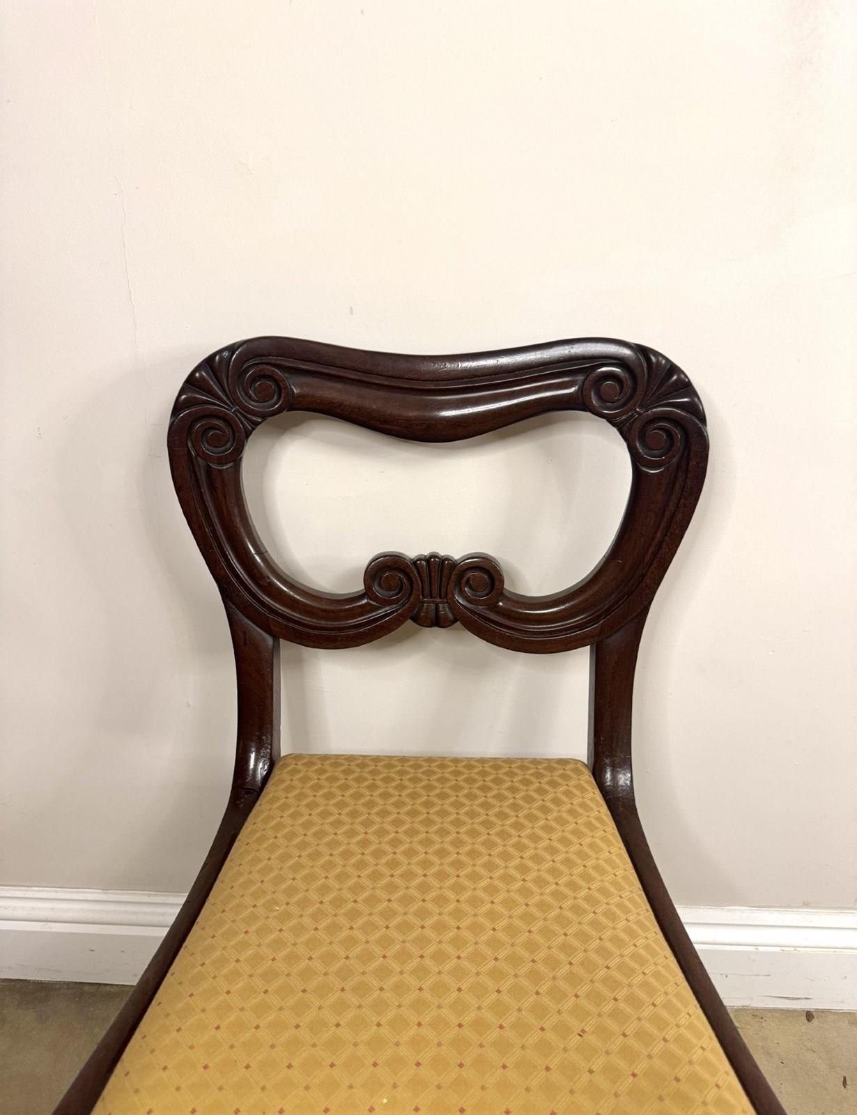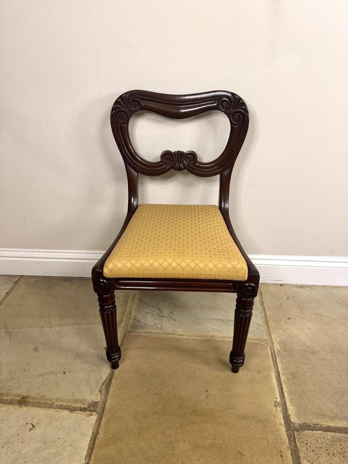 Fantastic quality set of six antique Regency mahogany dining chairs, having a fantastic quality set of six Regency dining chairs with kidney shaped backrests and beautiful carved detail, above drop in seats upholstered in a yellow fabric above turned and reeded forelegs. D. 1820