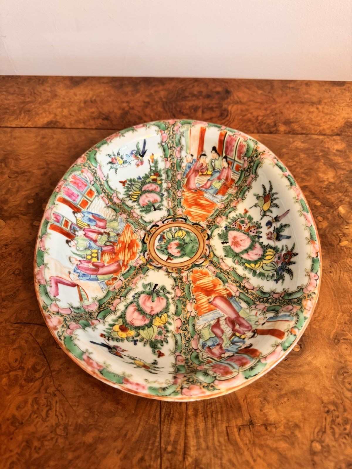 Fine quality antique 19th Century Chinese canton large bowl, having a quality porcelain 19th century Chinese canton large bowl decorated with famille rose within panels surrounded by a decretive border round the rim, with figures, insects and foliage in a pallet of beautiful colours of pink, green, blue, white & yellow shades. D. 1860