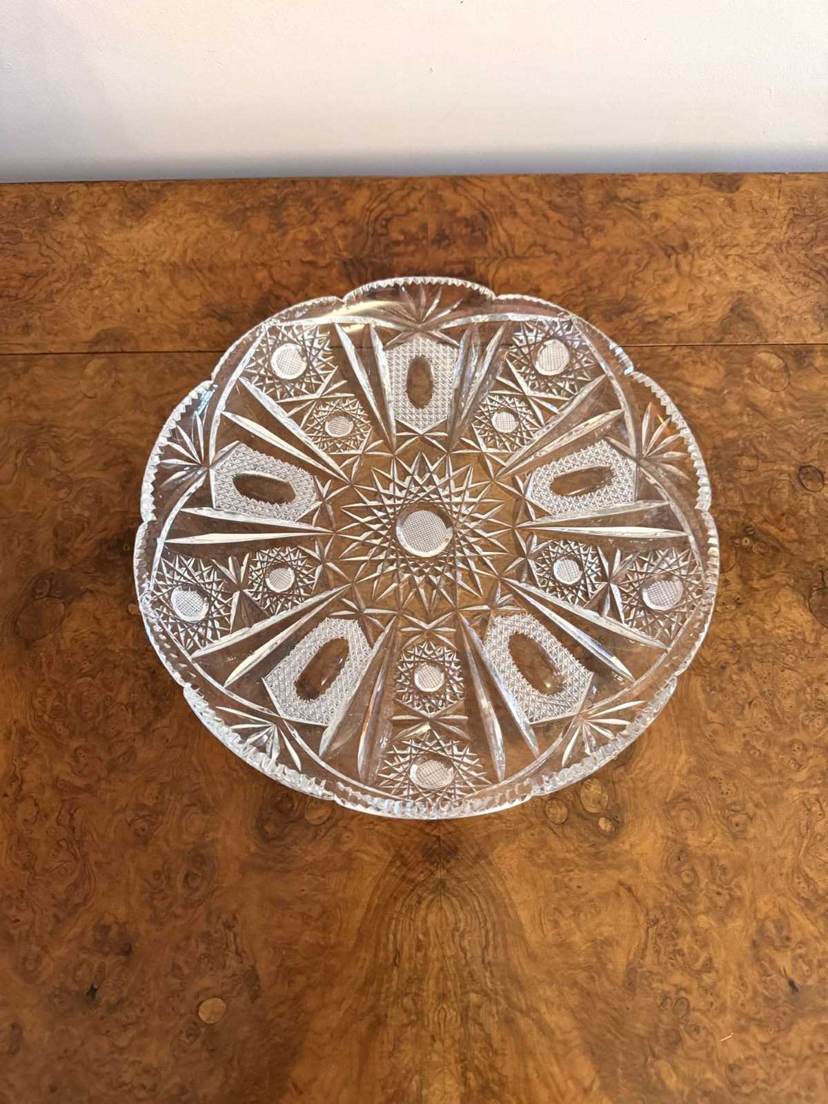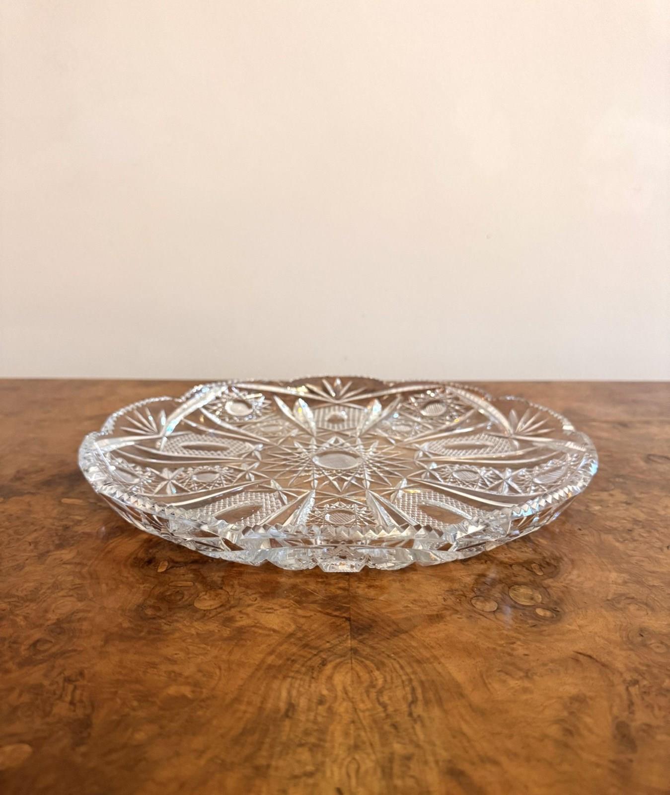 Fine quality antique Edwardian cut glass dish, having a quality antique Edwardian cut glass dish with beautiful cut glass detail and a shaped edge. D. 1900