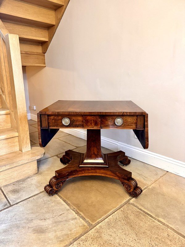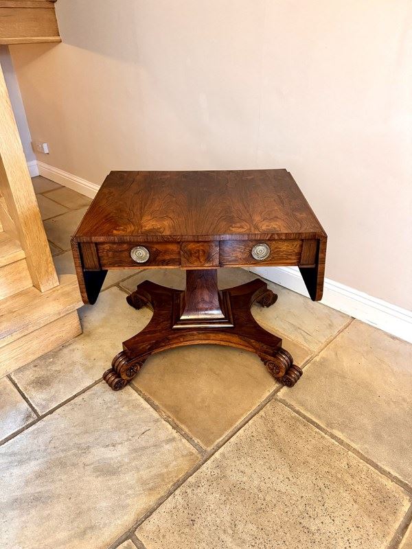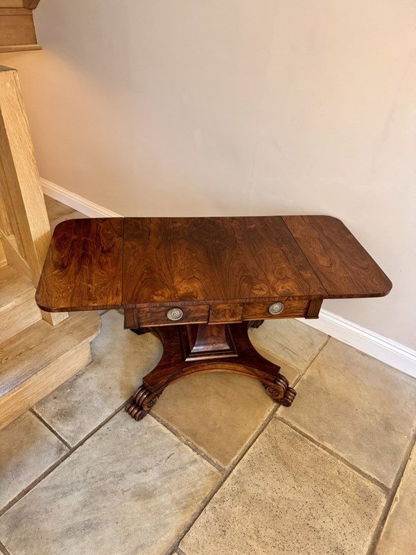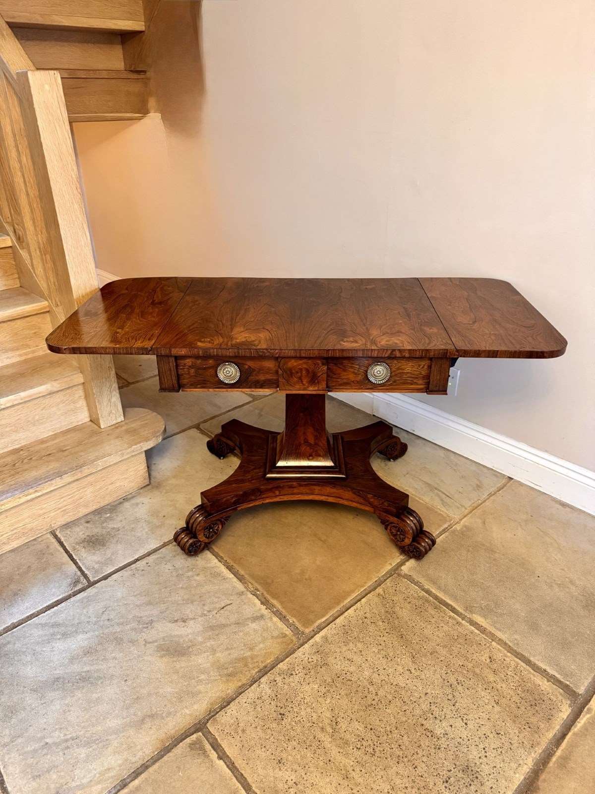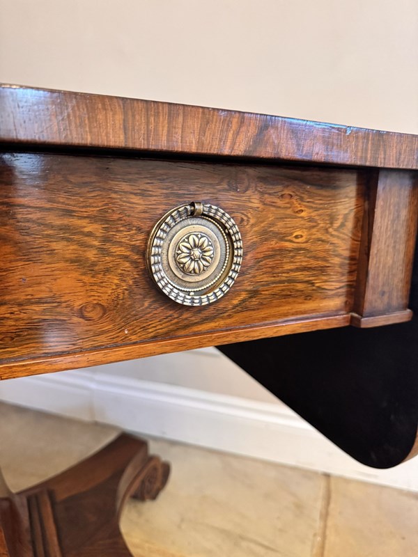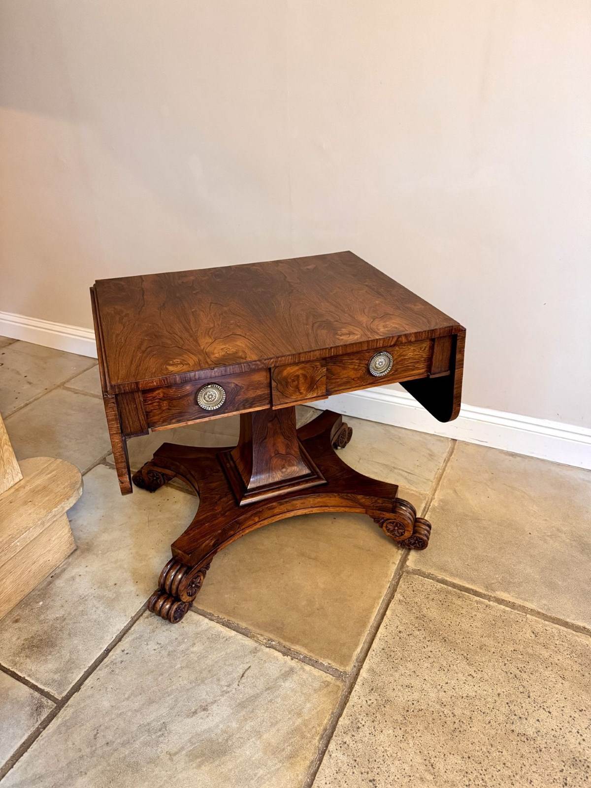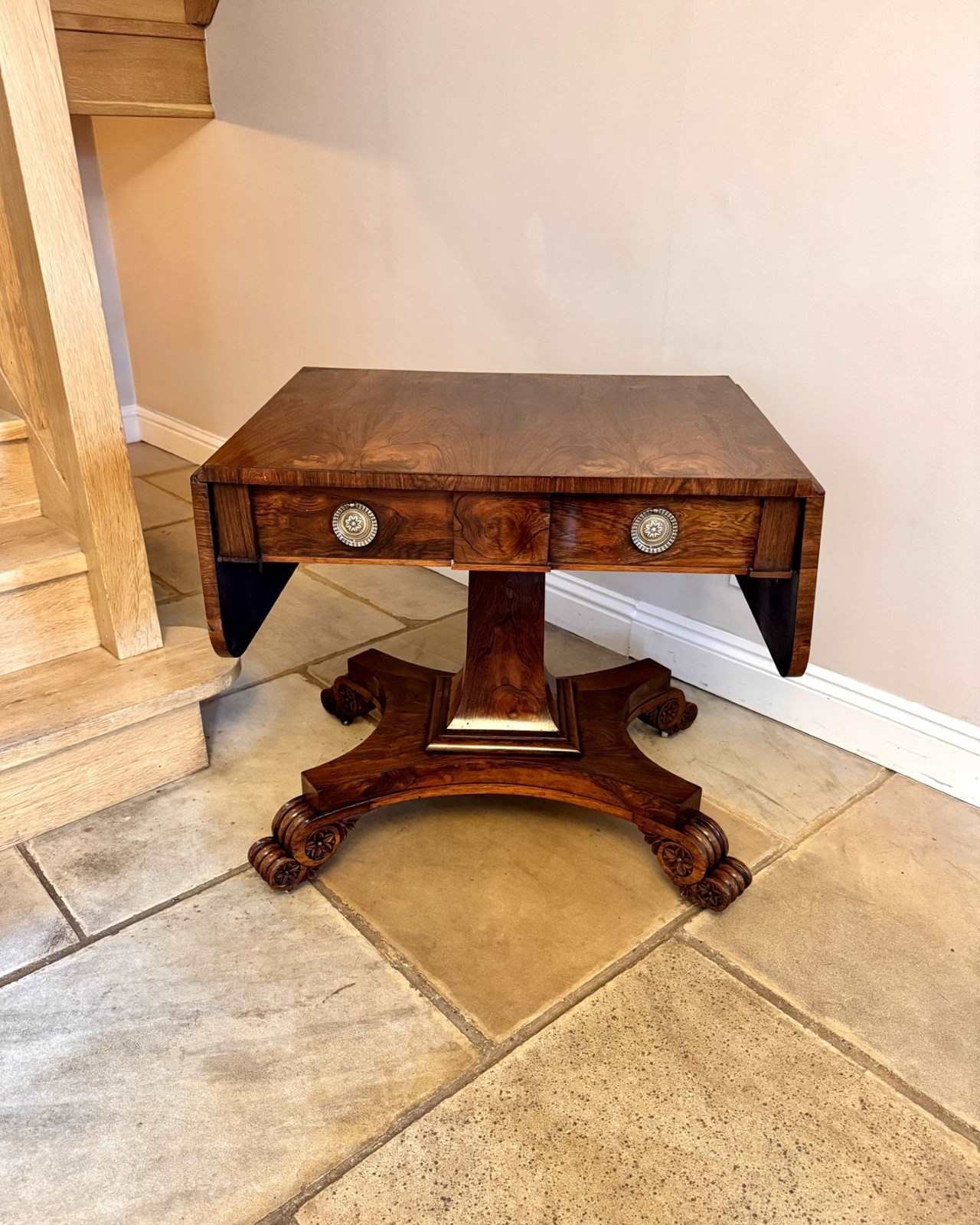 Fine quality antique Regency rosewood sofa table, having a quality polished rosewood top with drop leaves above two drawers with the original ornate brass ring knobs, with a central pedestal raised on four scroll feet with beautiful carved detail, with a polished finish.