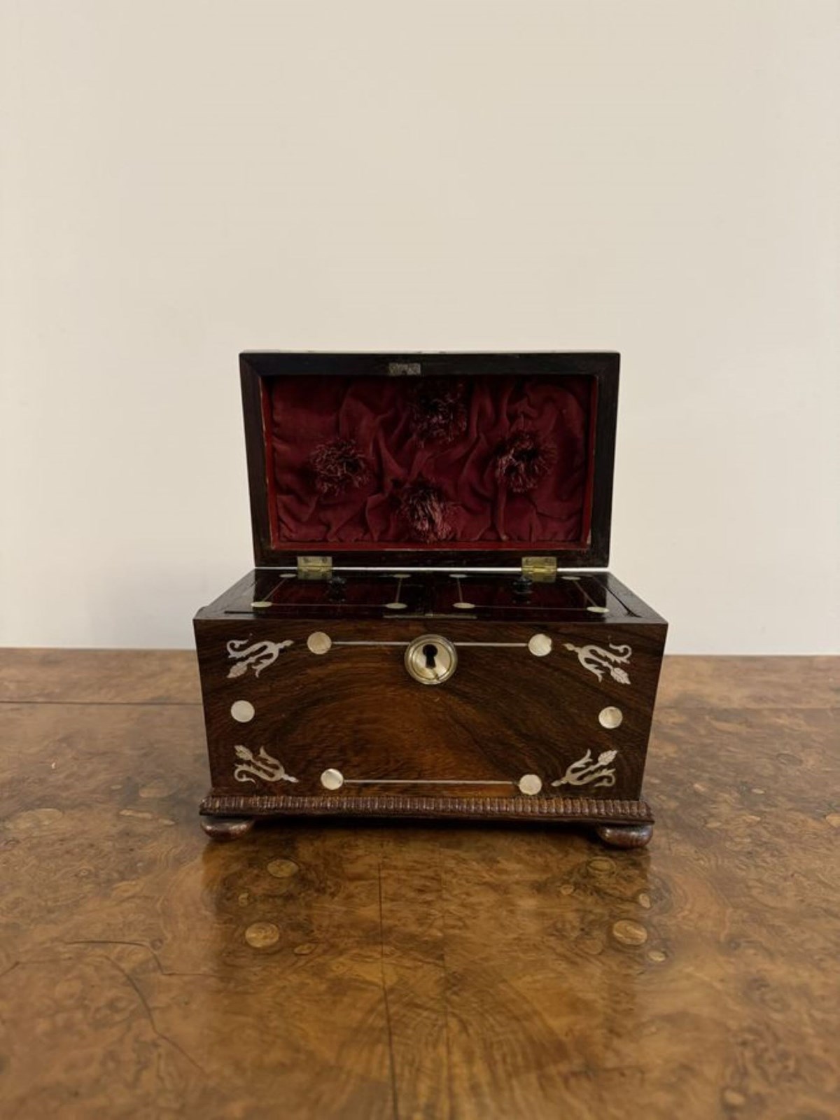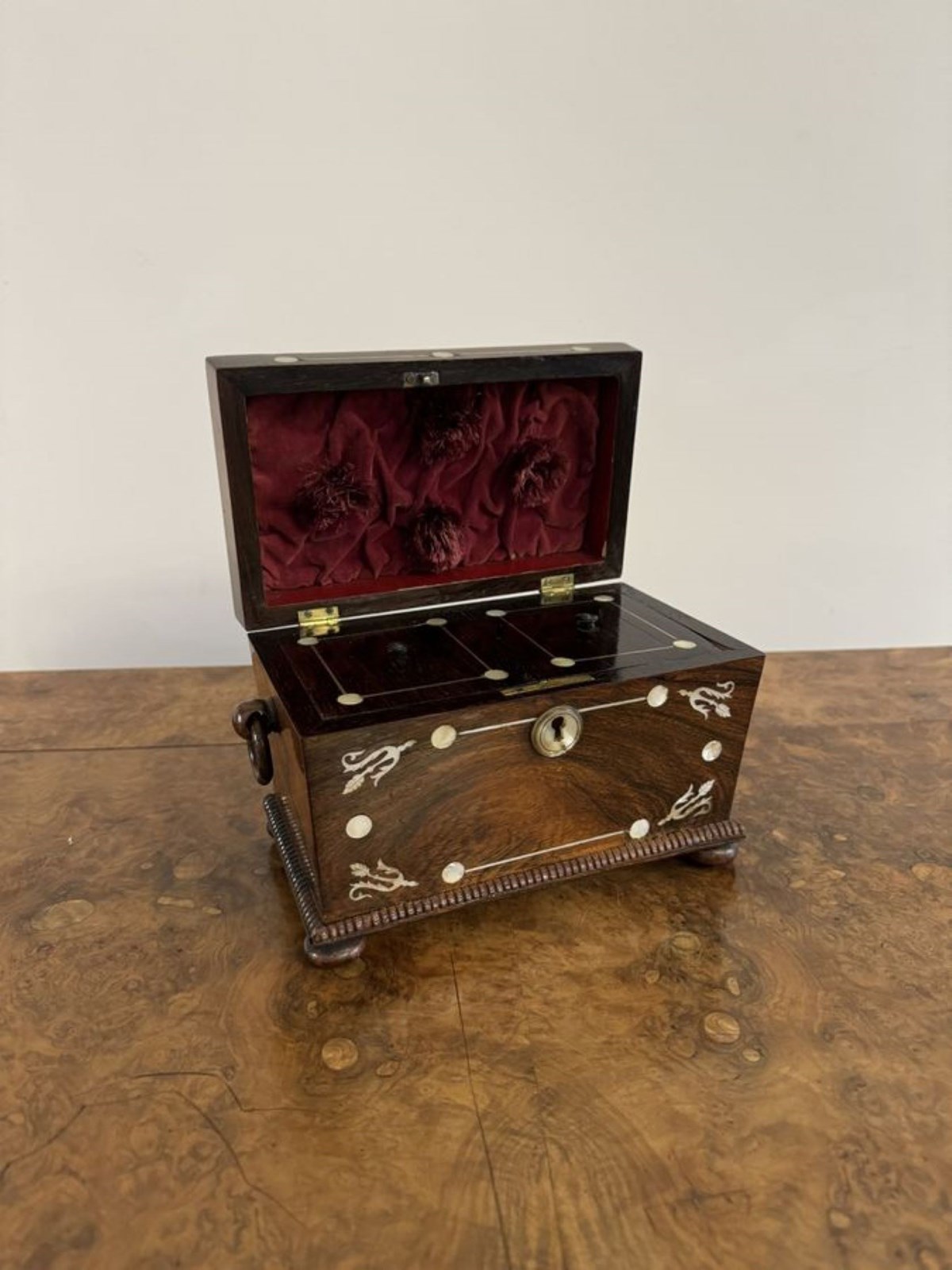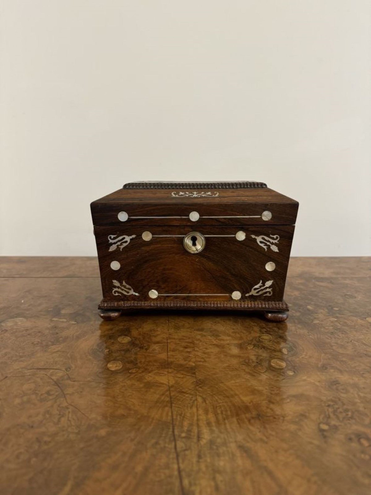Fine quality antique Regency rosewood tea caddy, having a outstanding quality 19th Century rosewood and mother of pearl inlaid sarcophagus shaped tea caddy, with a quality carved moulded edge top opening to reveal two compartments for tea and the original fitted interior, flanked by ring handles raised on four original bun feet.