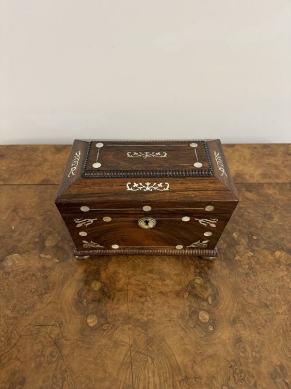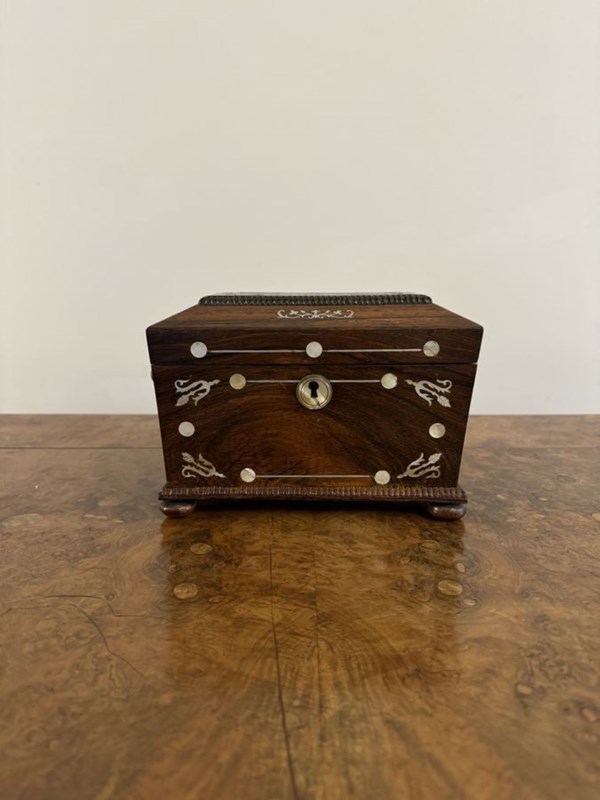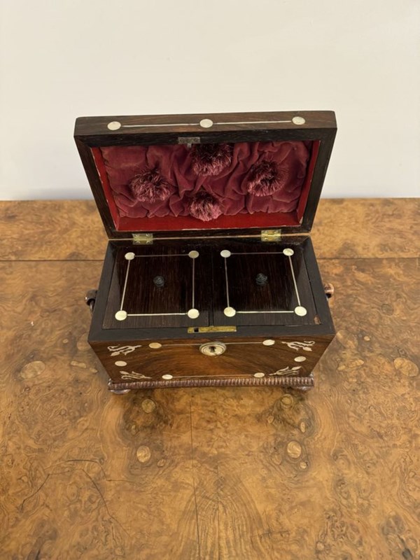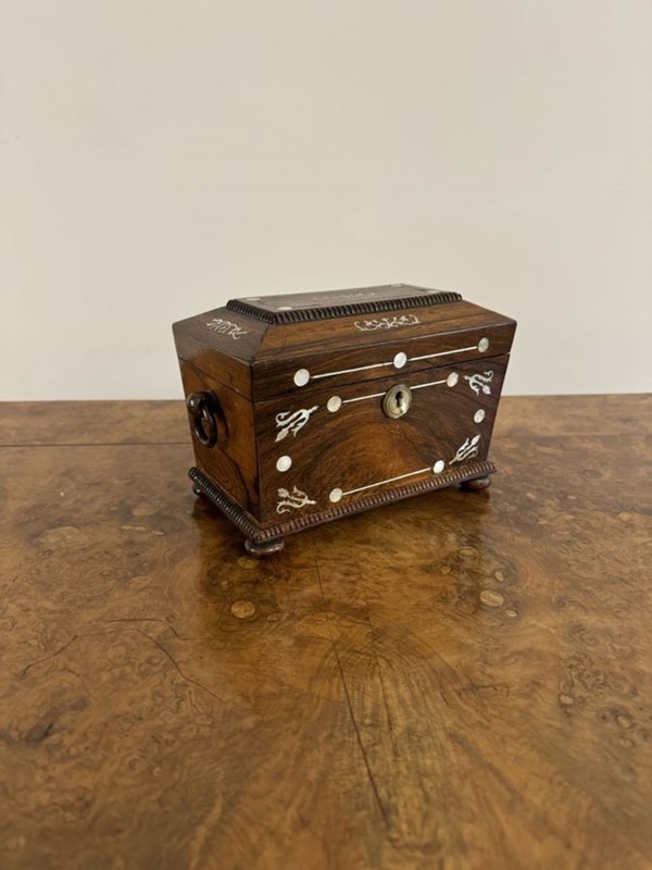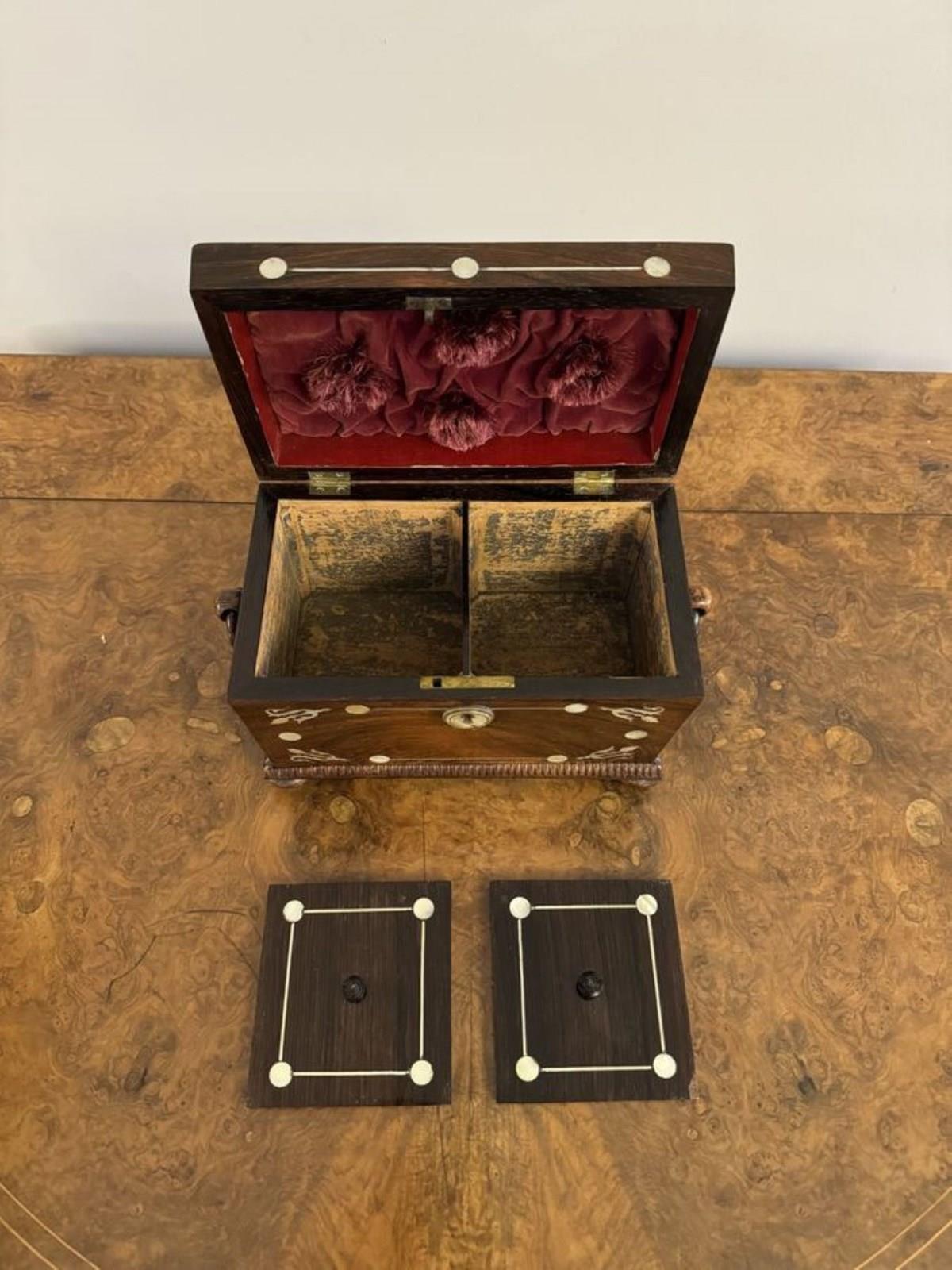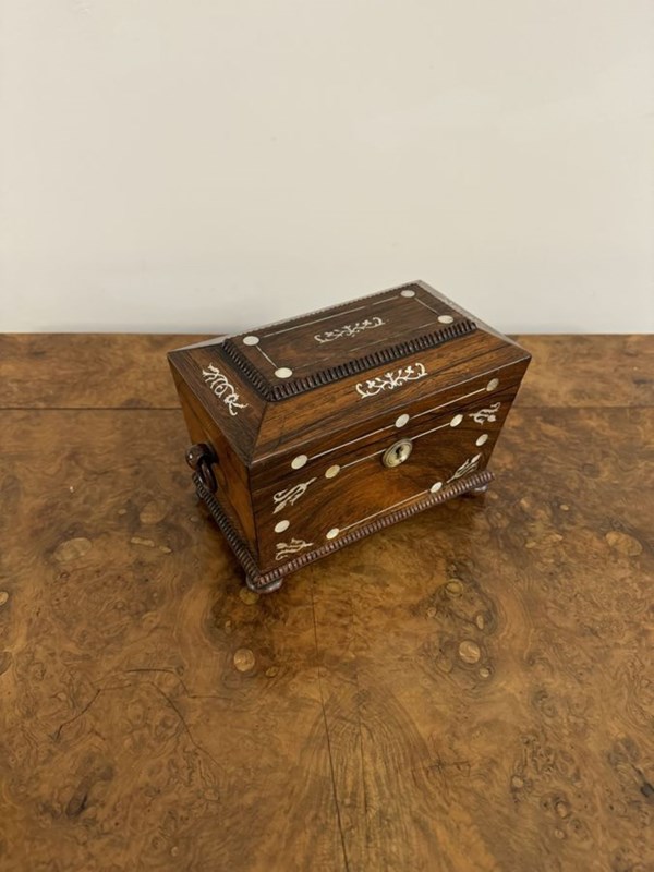 Fine quality antique Regency rosewood tea caddy, having a outstanding quality 19th Century rosewood and mother of pearl inlaid sarcophagus shaped tea caddy, with a quality carved moulded edge top opening to reveal two compartments for tea and the original fitted interior, flanked by ring handles raised on four original bun feet.