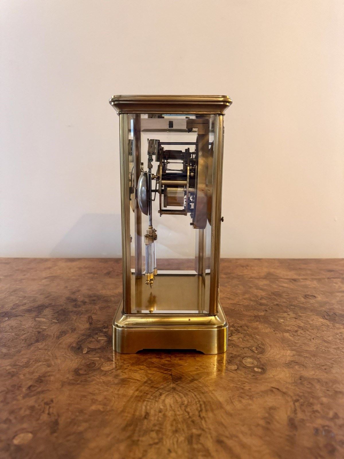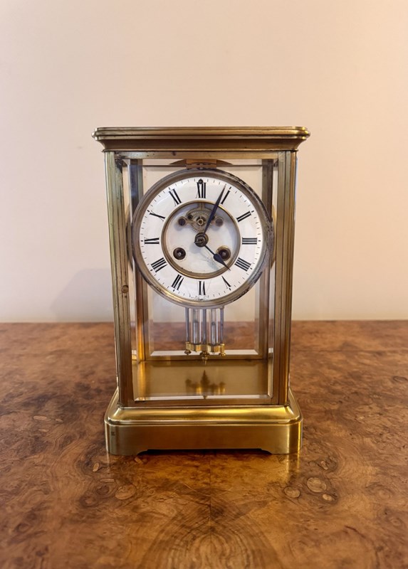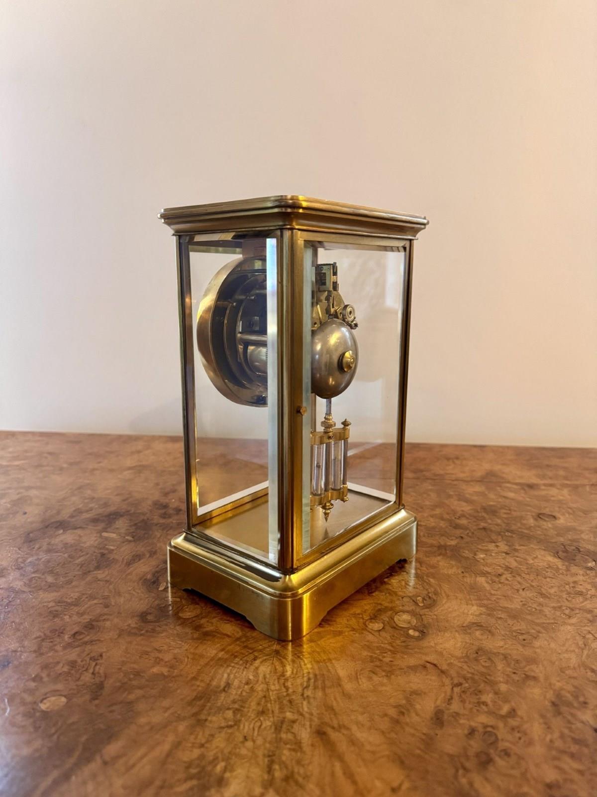 Fine quality antique Victorian brass mantle clock, having a quality antique 19th century mantle clock with a brass case flanking four glass panels exposing the clock and its workings, having a white circular dial with black Roman numerals with black spade hands above a hanging mercury pendulum, having a quality eight day movement striking on a bell. All clocks are serviced prior to delivery D. 1880
