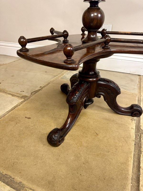 Fine quality antique Victorian burr walnut lamp table, having a quality antique Victorian burr walnut lamp table with a circular shaped burr walnut top above a book rack with three sections for books, raised on a carved base terminating into carved cabriole legs. D. 1860