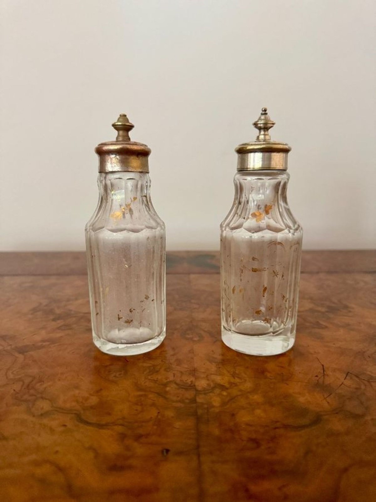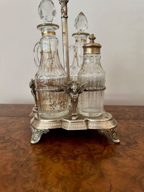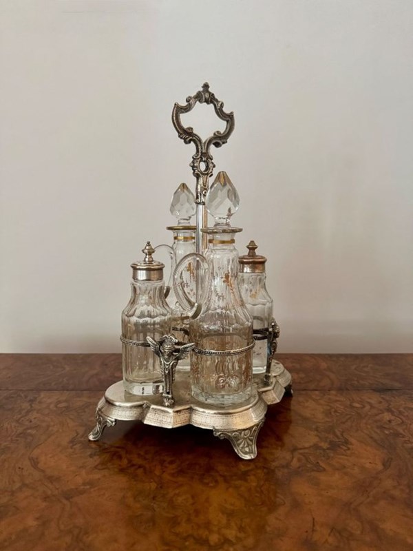 Fine quality antique Victorian ornate silver plated cruet set with a unusual ornate silver plated stand raised on four decorative legs with scrollwork and relief detailing, with a shaped ornate carrying handle to the centre, next to the bottle sections are four cherub surrounding the original glass gilded bottles with delicate floral vine motifs, two bottles with silver plated tops and two with the original stoppers used for oil, vinegar, salt and pepper. D. 1860