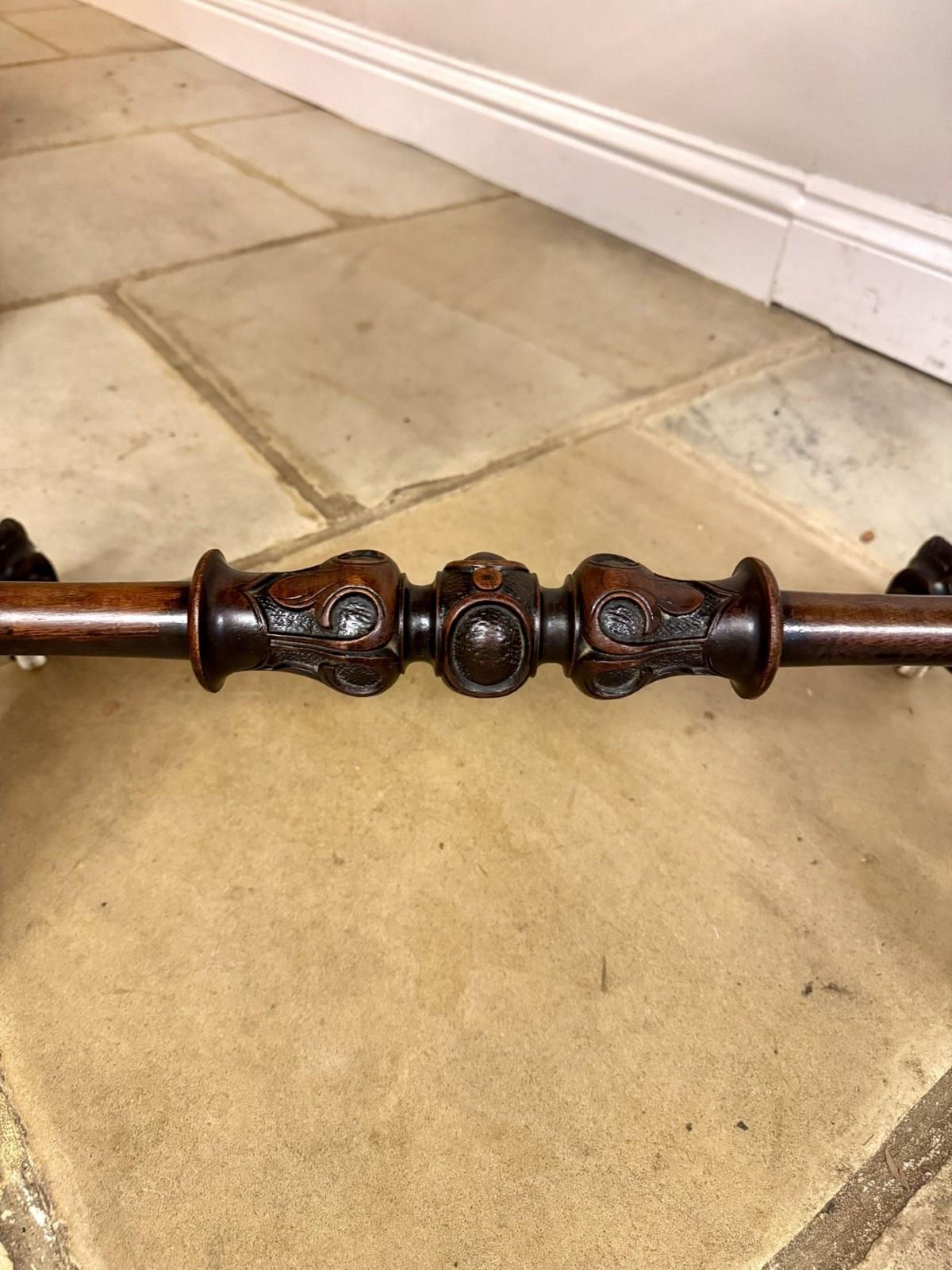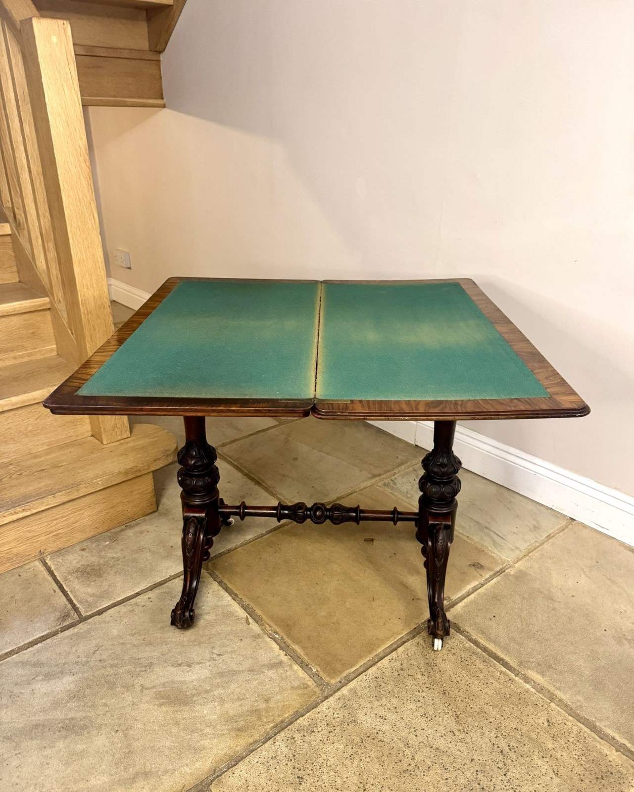 Fine quality antique Victorian walnut turnover top card table by Edwards & Roberts, having a quality walnut top with a polished finish opening to reveal a green baize lined interior surface for playing cards, above a quality pair of carved legs mounted on the original castors united by a quality carved stretcher, label to the underside 'Edwards & Roberts' D. 1860