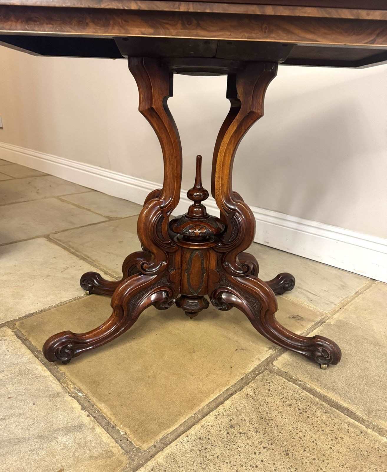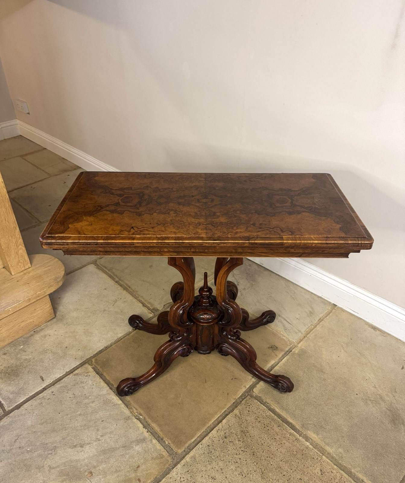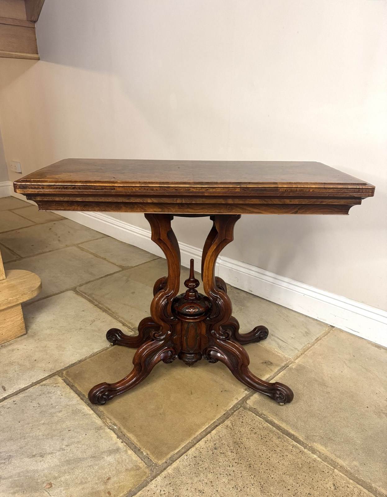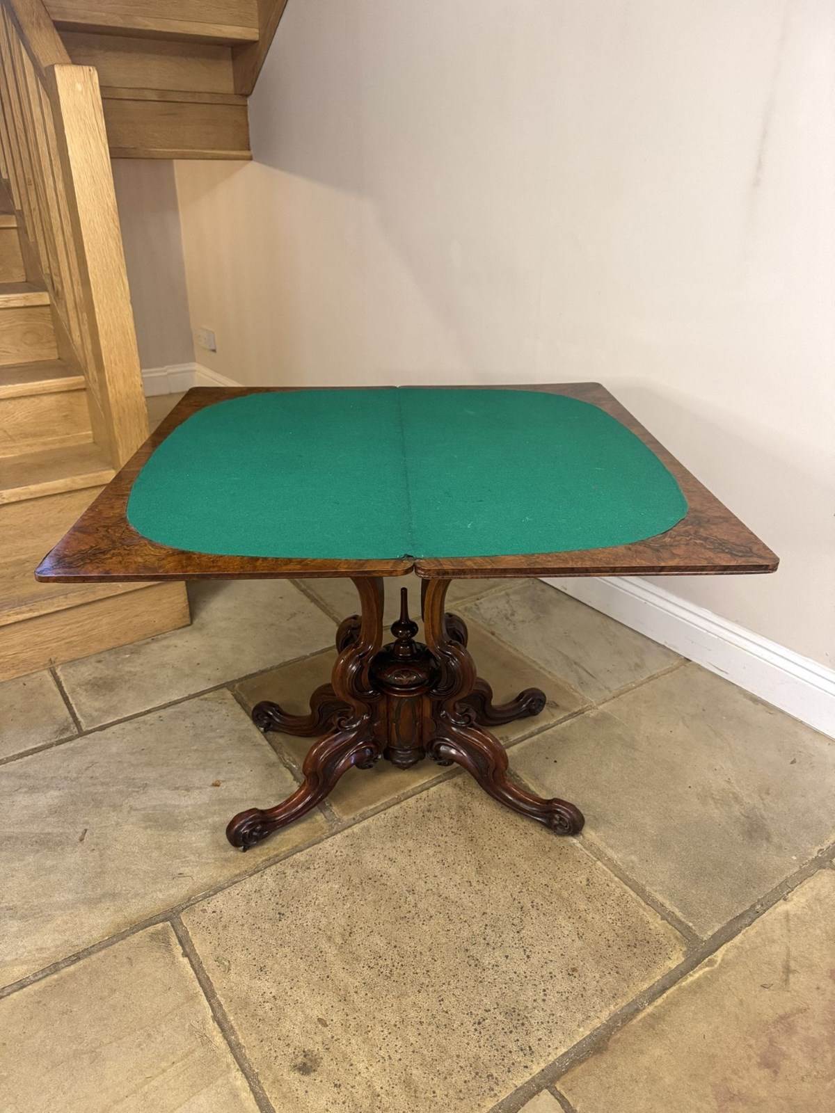 Fine quality antique Victorian walnut games table, having a quality walnut rectangular shaped top with rounded corners, having a swivel action opening to reveal a green lined playing surface, above a highly carved pedestal with scrollwork and a turned central finial terminating into four curved cabriole legs. Having a polished finish. Dimensions open: W 91cm D 91cm D. 1860
