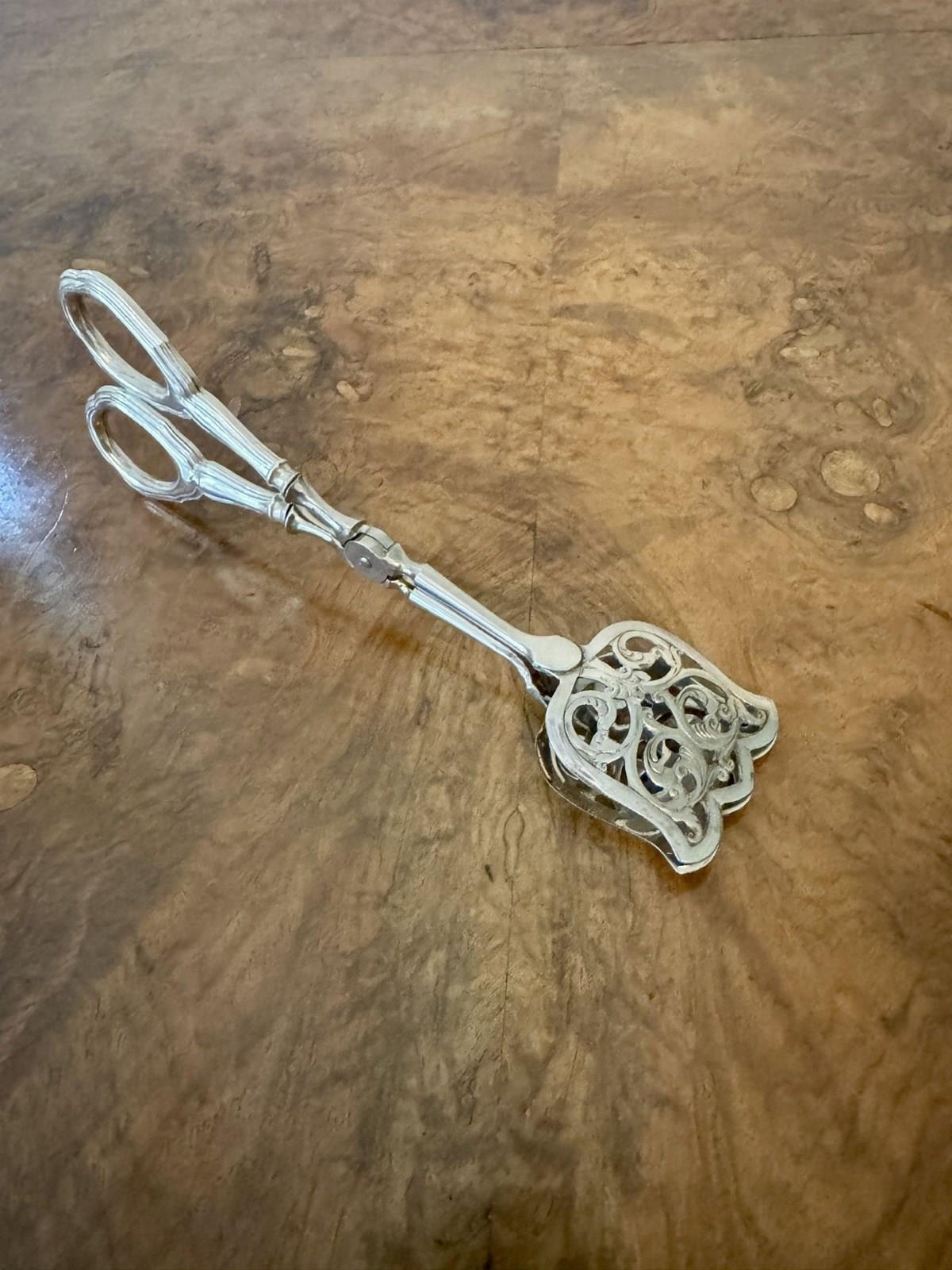 Fine quality pair of antique silver serving tongs, having a quality pair of antique silver serving tongs with rounded handles with subtle ridged detailing and with flat pierced serving ends. D. 1900