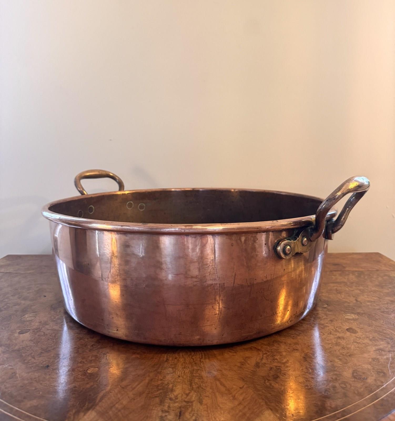 Large quality antique George III copper pan, having a quality large antique George III copper pan with shaped carrying handles to both sides. D. 1800