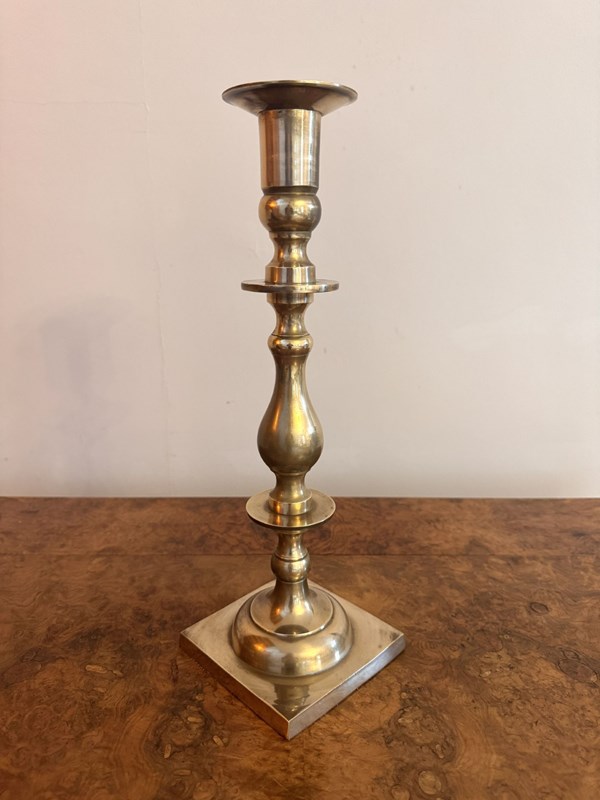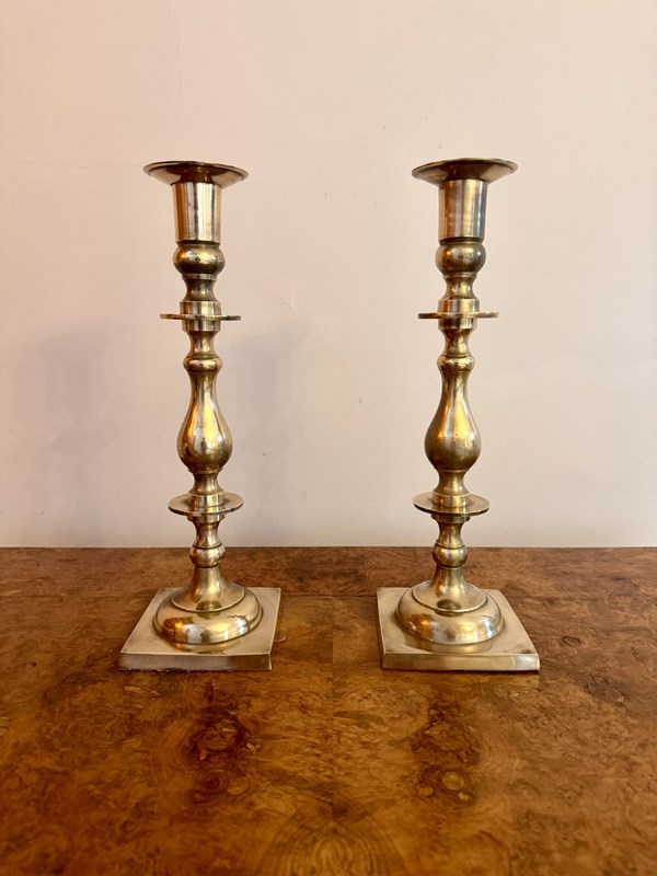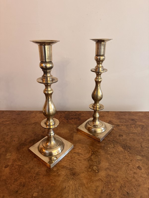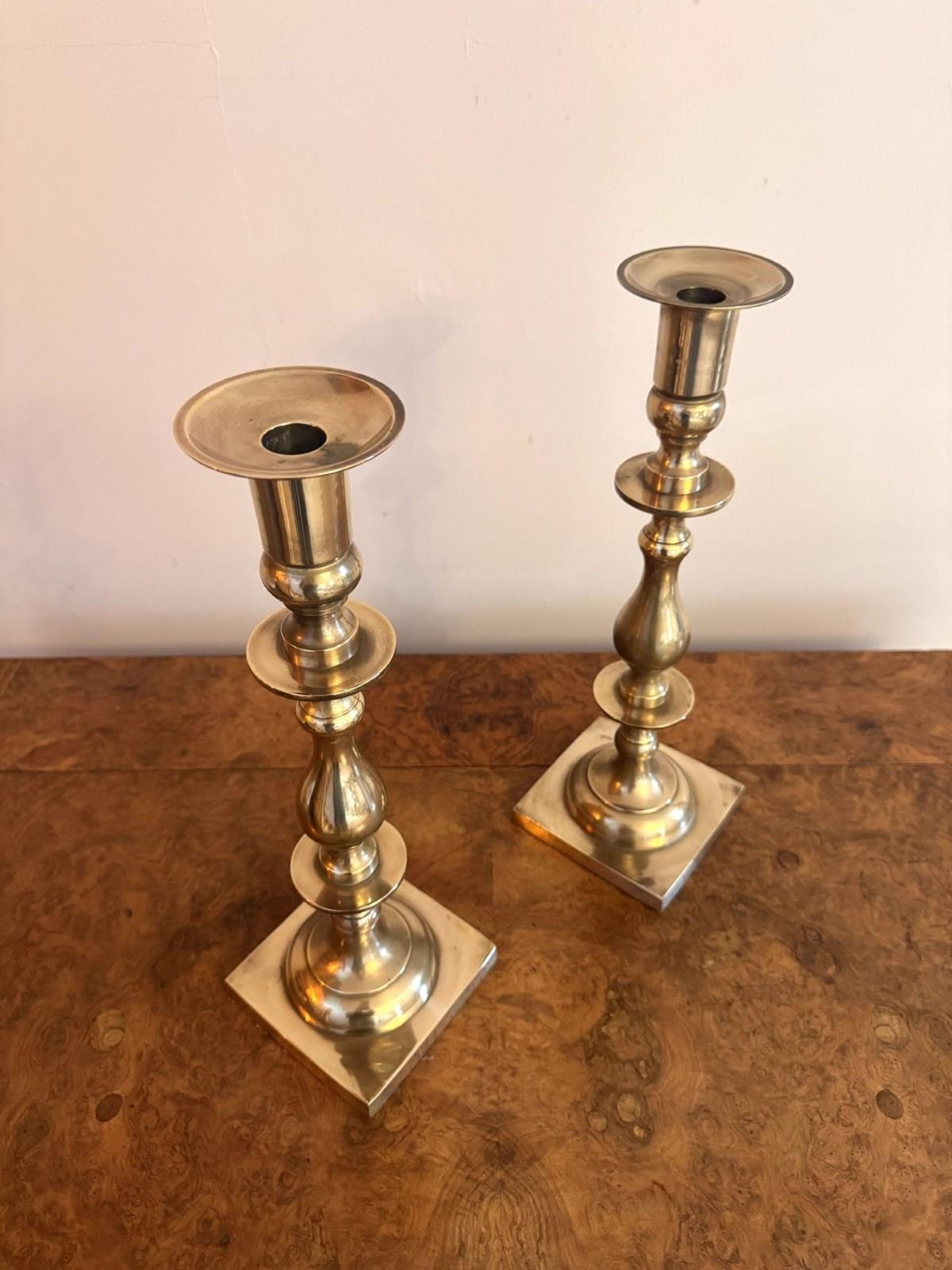 Large quality pair of brass antique candlesticks, having a quality pair of large brass candlesticks with turned shaped columns raised of square stepped bases. D. 1890