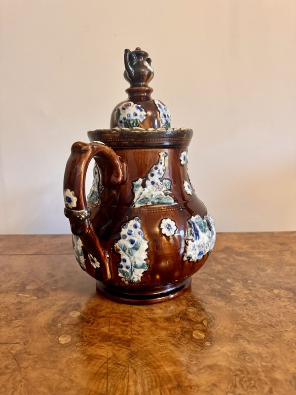 Large unusual antique bargeware tea pot decorated with wonderful bunches of flowers in blue, green, pink and white colours on a brown glazed ground, the lid having a small teapot finial to the top, with a shaped handle and spout. D. 1880