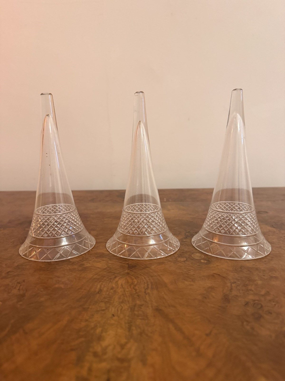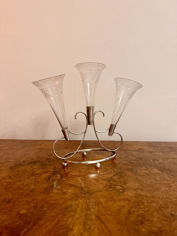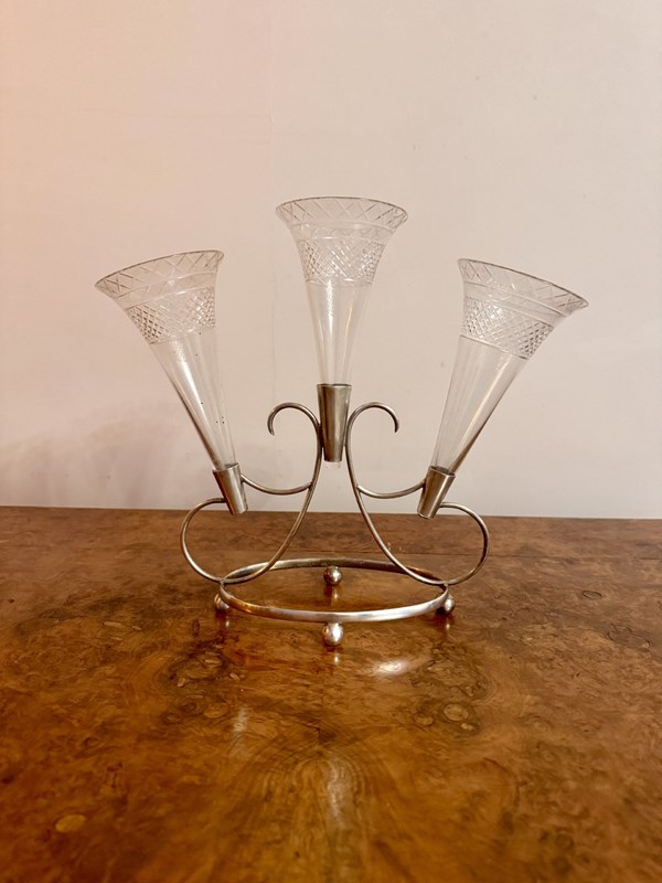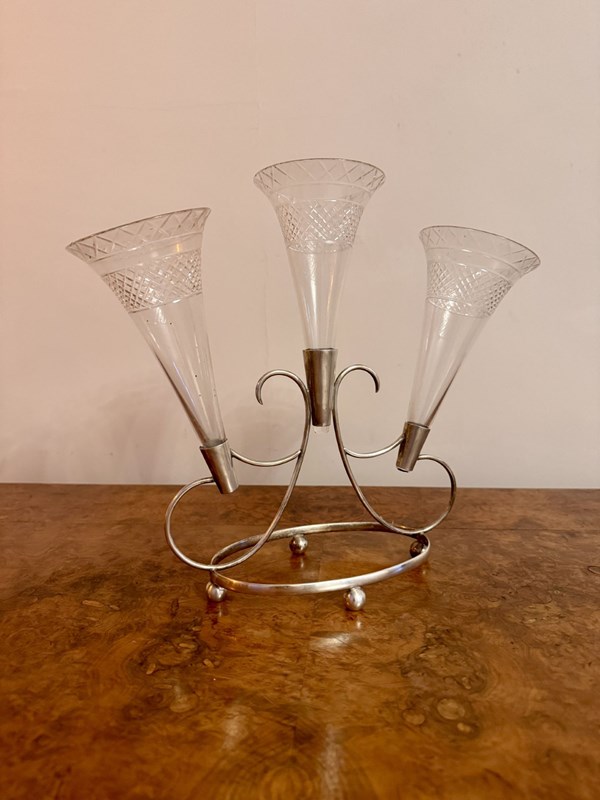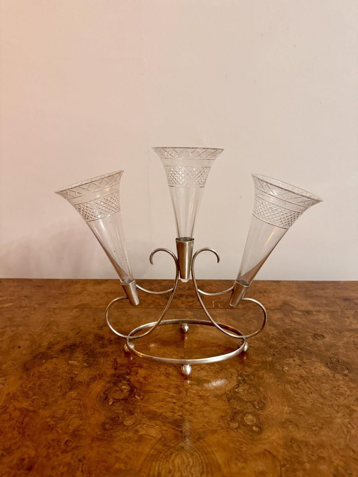 Lovely quality antique Edwardian epergne, having a lovely quality antique Edwardian epergne with a shaped silver plated stand holding three etched glass trumpets. Perfect condition. D. 1900