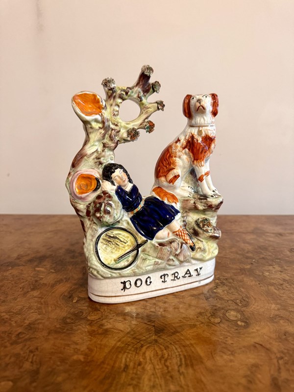 Lovely quality antique Victorian Staffordshire figure, having a quality antique Victorian Staffordshire figure of a lady laying down with her spaniel seated next to her surrounded by foliage, raised on an oval shaped base with 'DOG TRAY' hand written on it, hand painted in stunning green, blue, orange and black colours. D. 1880