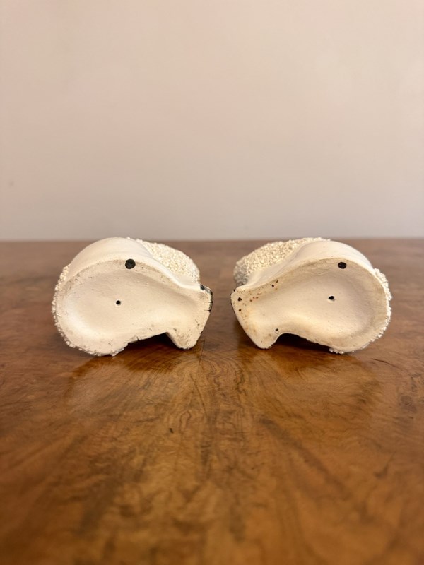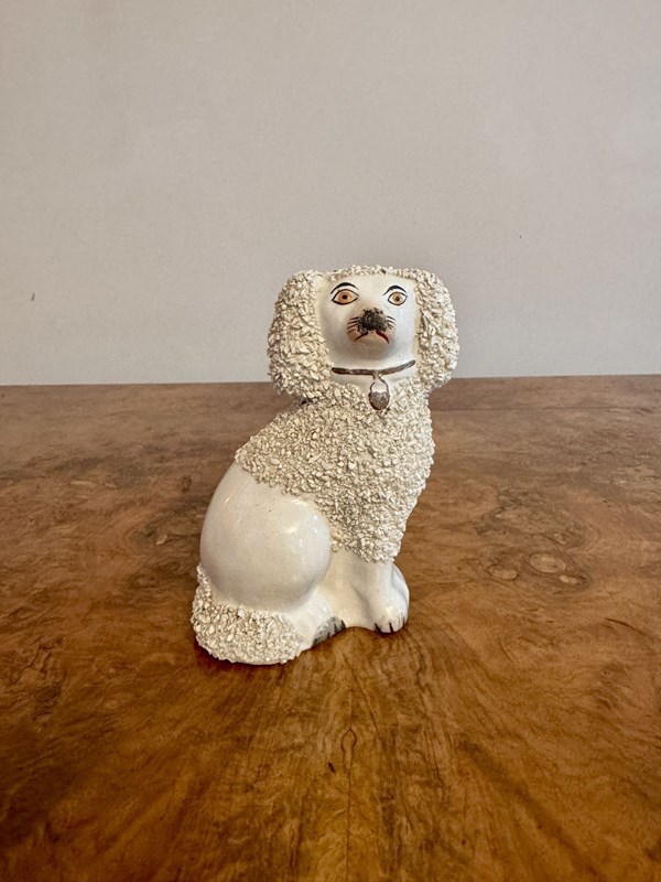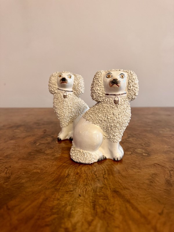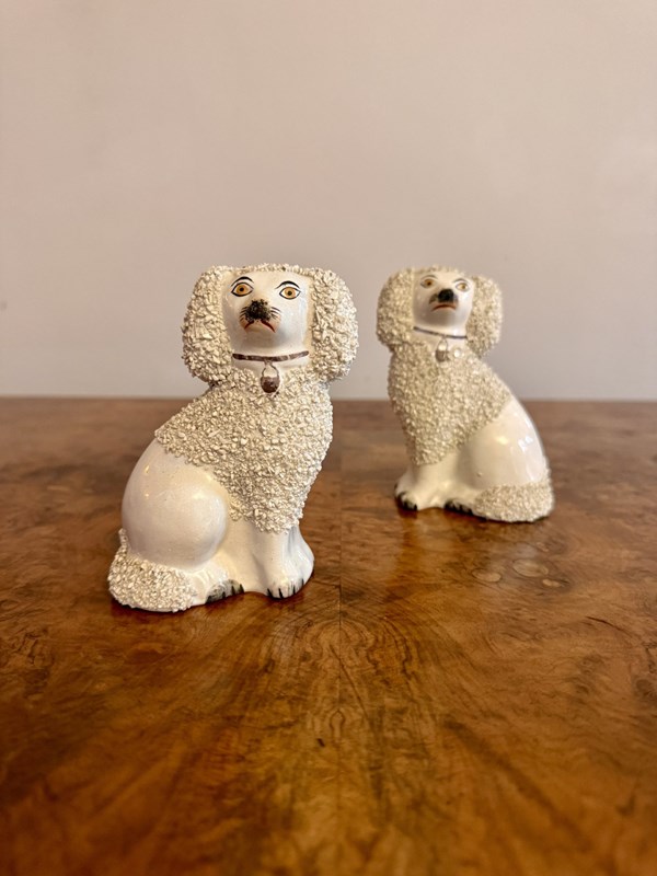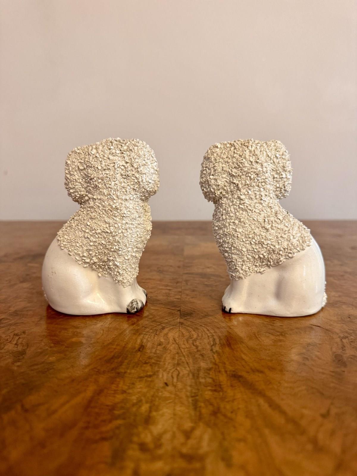 Lovely quality pair of antique miniature poodles, having a lovely quality pair of antique miniature seated poodles with matching white confetti glazed coats, silver collars and padlocks sitting in the same seated position as one another. Perfect condition as shown. D. 1900