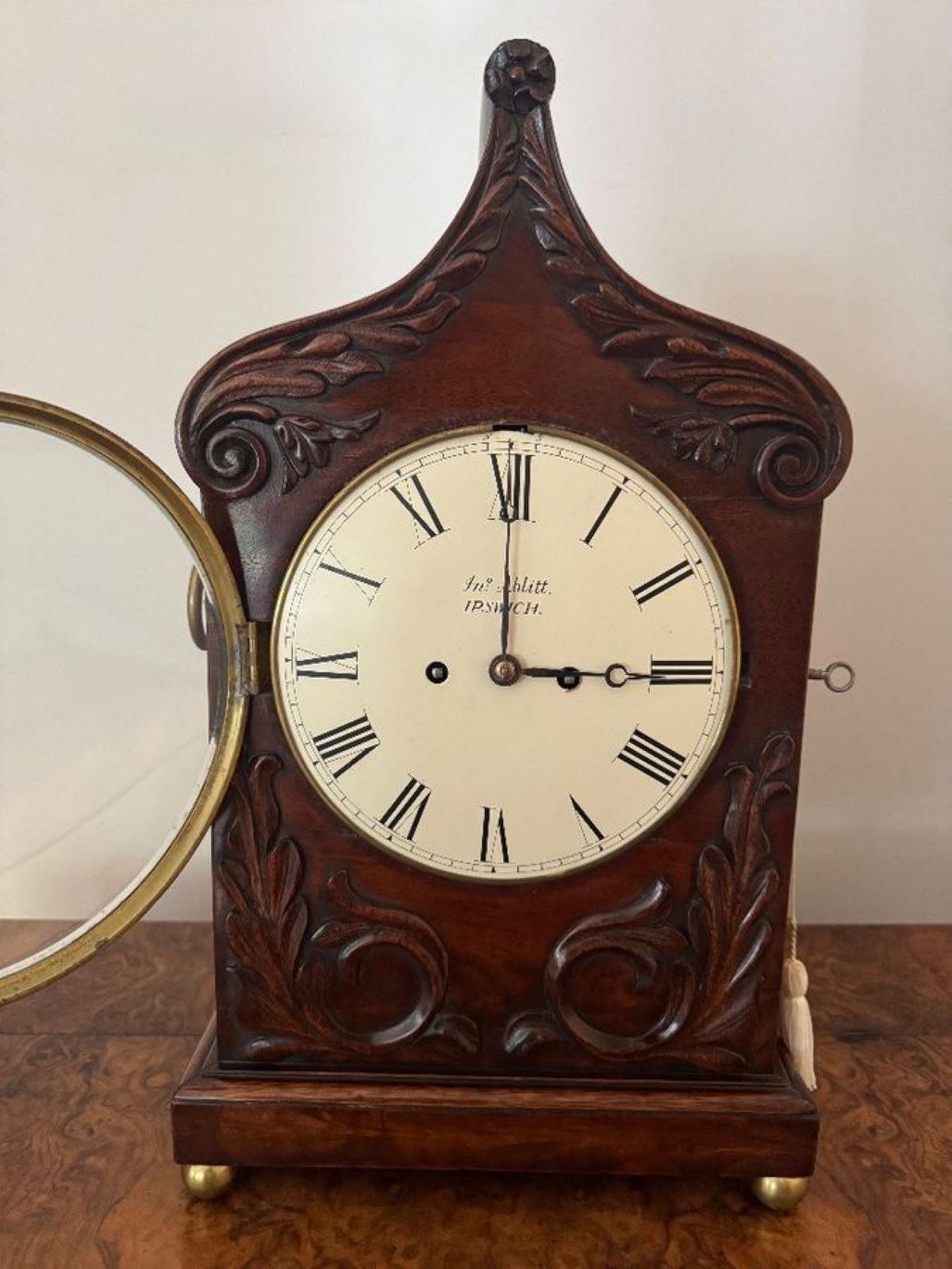 Outstanding quality antique Victorian mahogany bracket clock, having a quality antique Victorian mahogany bracket clock with a ogee top with beautiful scroll and leaf carving detail, having a large dial signed J Ablitt Ipswich with black Roman numerals and the original hands surrounded by a brass bezel, with an eight day fusee movement striking on a bell. Raised on brass feet. All clocks get serviced prior to delivery by a trusted horologist. D. 1850