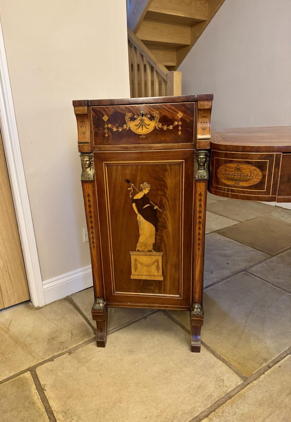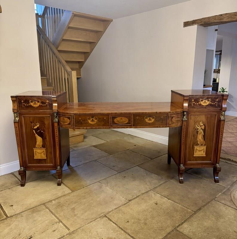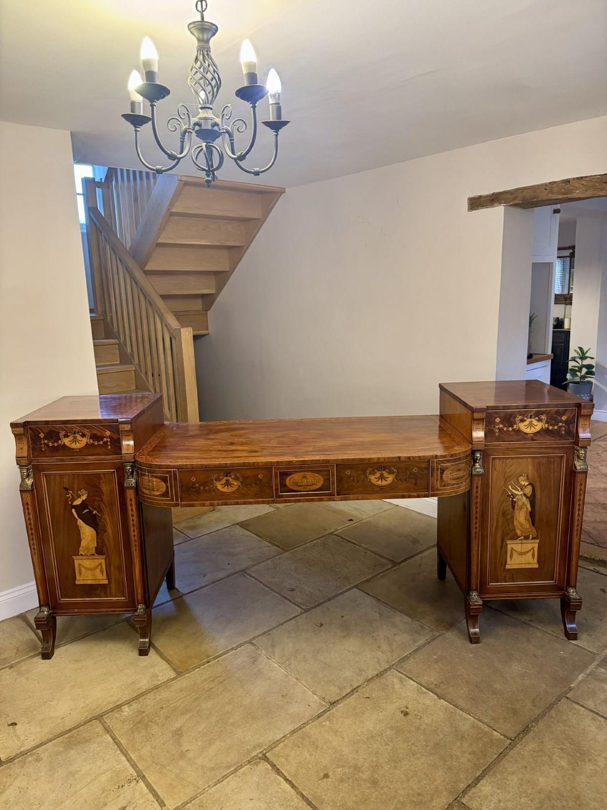 Outstanding quality large George III mahogany & satinwood inlaid sideboard, having a large figured mahogany sideboard with stunning Neo classical marquetry inlaid satinwood panelled doors to the pair of pedestal cabinets flanked by brass spinx heads, connected by a long central writing surface above two inlaid drawers with floral and urn detail, standing on sabre legs. Fine quality George III original sideboard in good condition. D. 1800