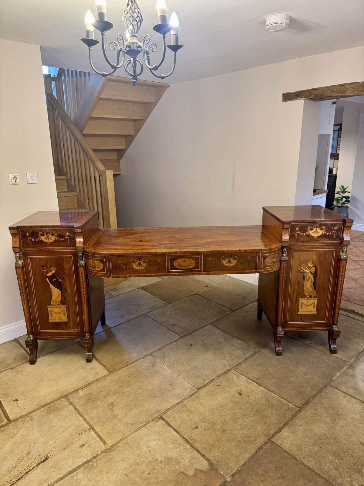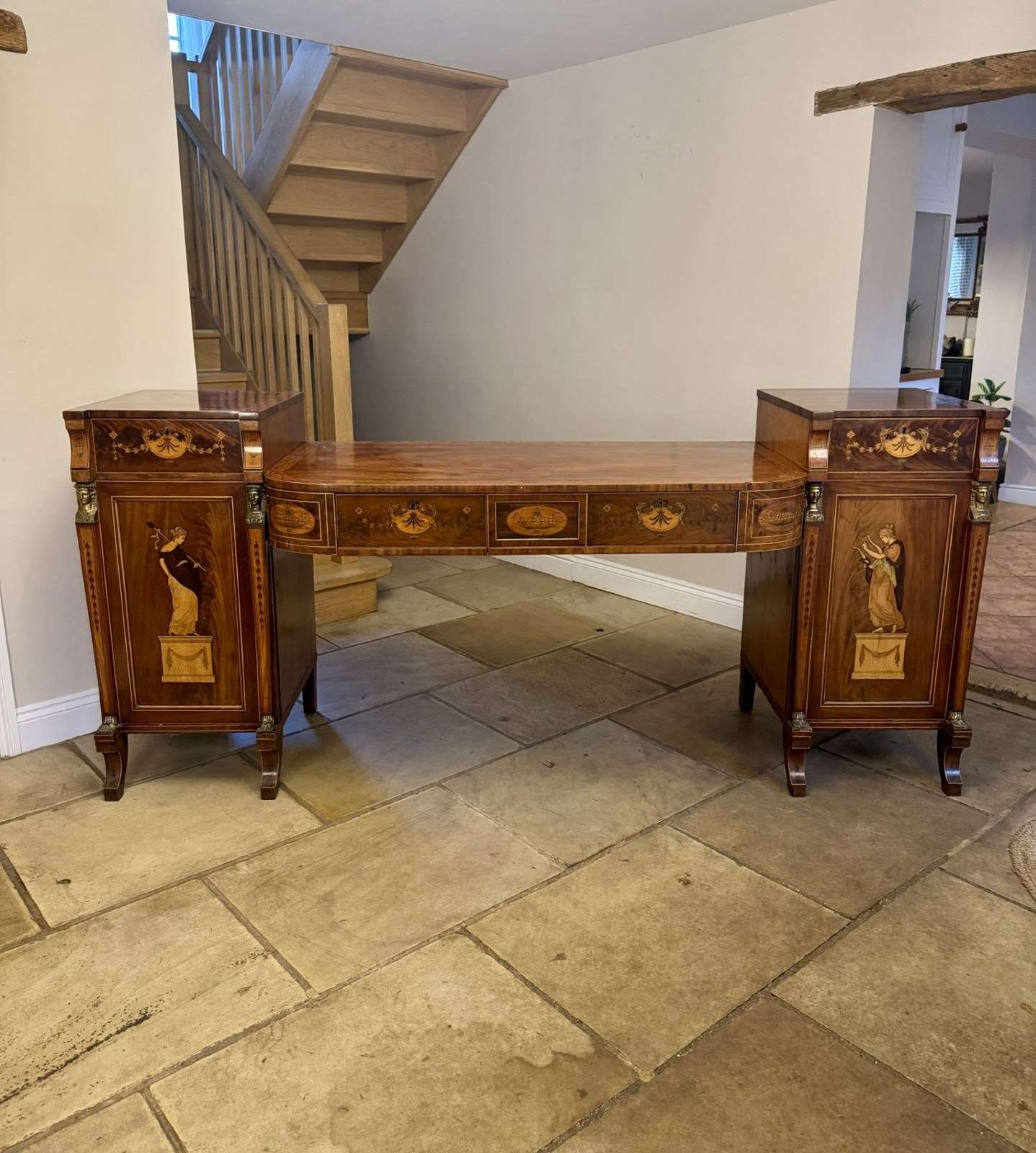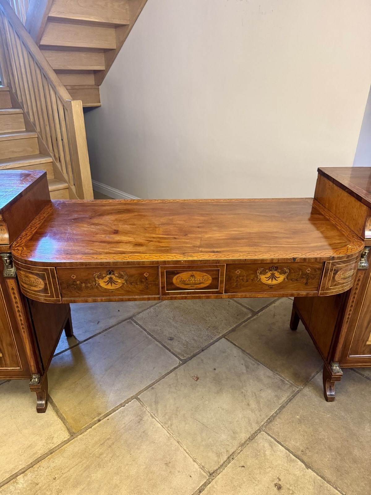 Outstanding quality large George III mahogany & satinwood inlaid sideboard, having a large figured mahogany sideboard with stunning Neo classical marquetry inlaid satinwood panelled doors to the pair of pedestal cabinets flanked by brass spinx heads, connected by a long central writing surface above two inlaid drawers with floral and urn detail, standing on sabre legs. Fine quality George III original sideboard in good condition. D. 1800